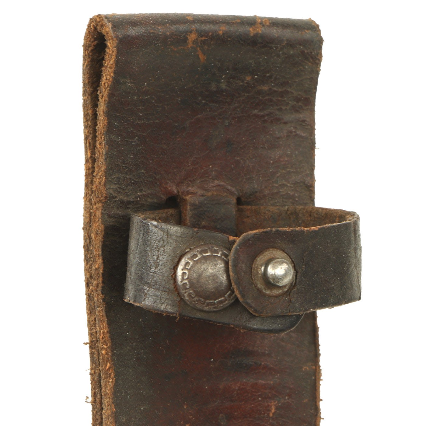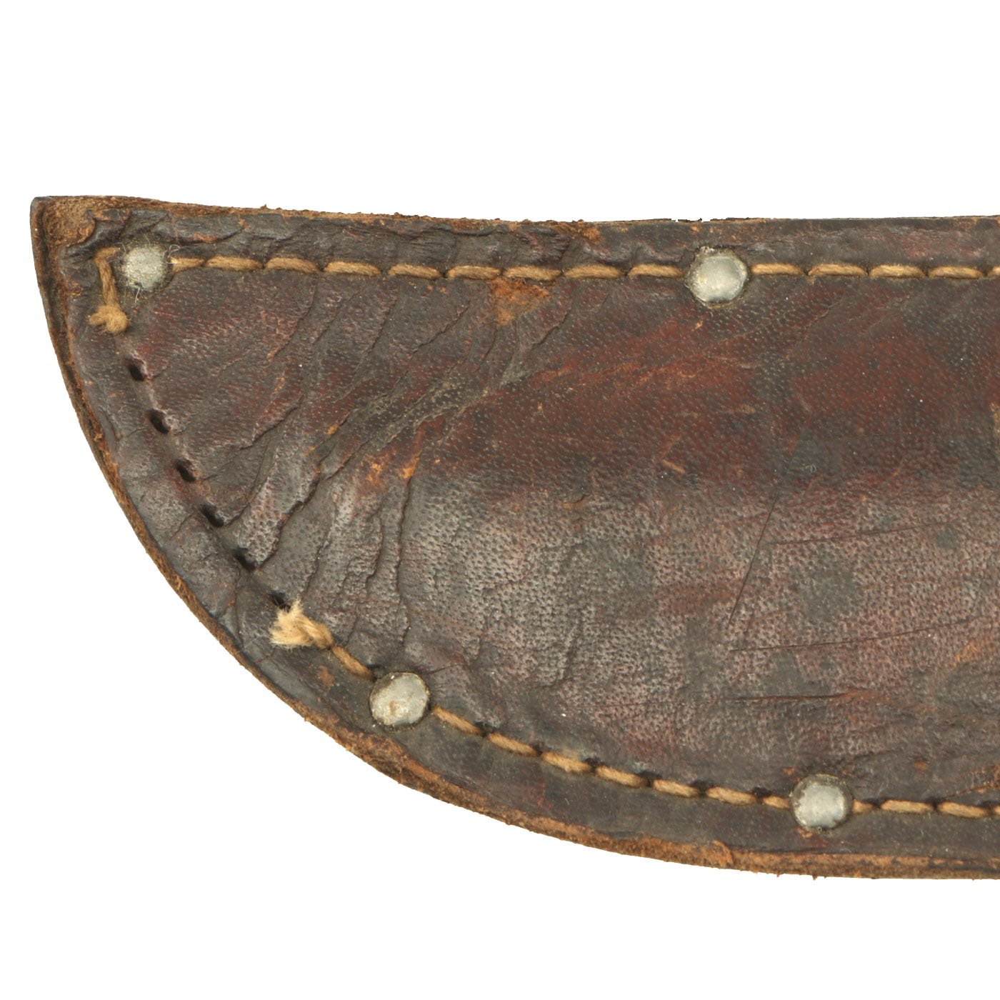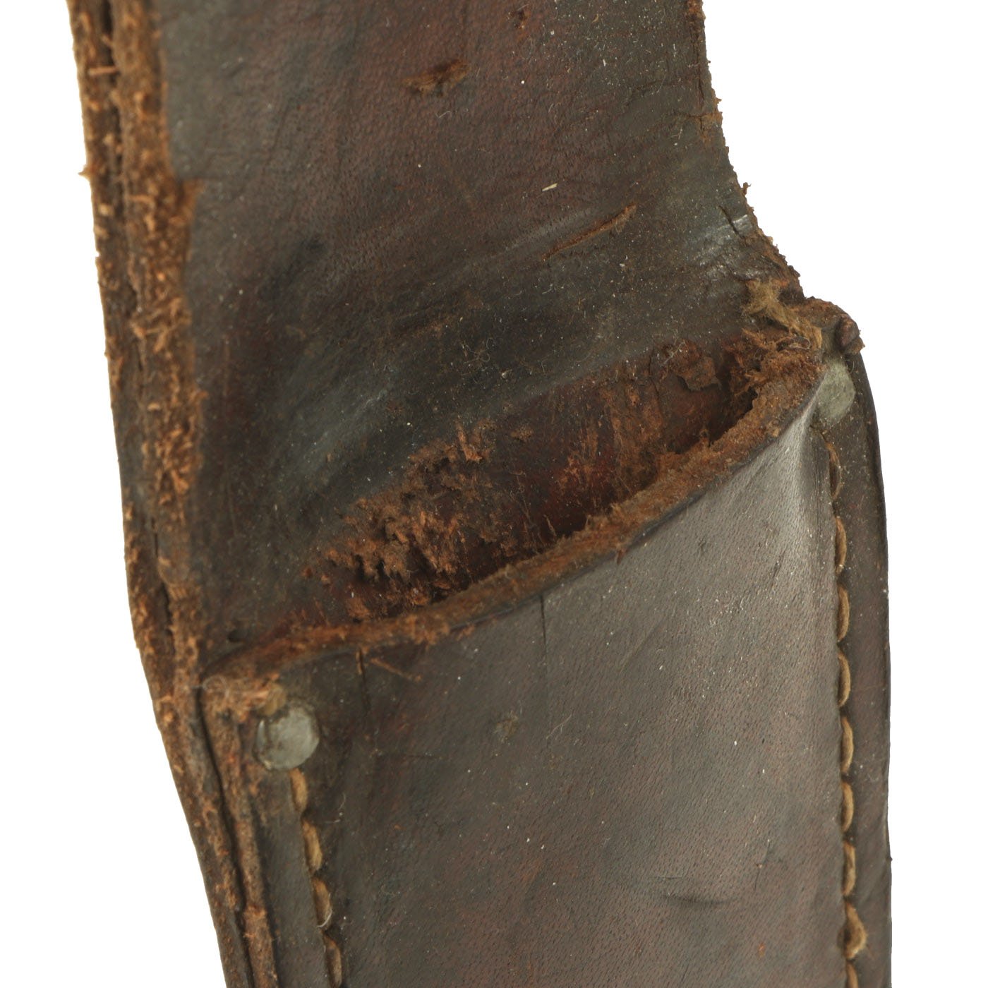 • Heavy duty U.S. Style leather sheath in very good condition with moderate overall wear. All rivets intact, though some of the stitching has pulled. Securing strap is functional.