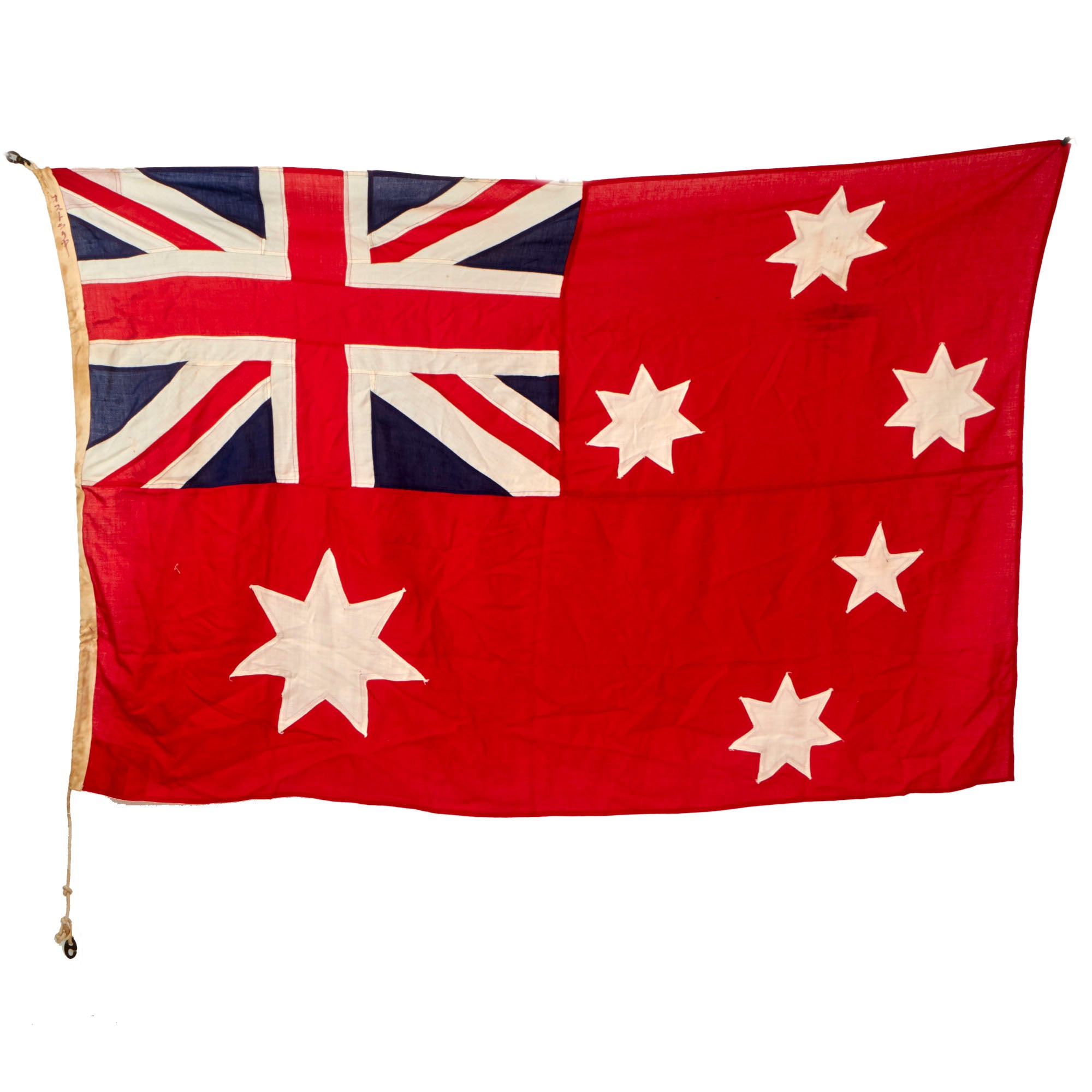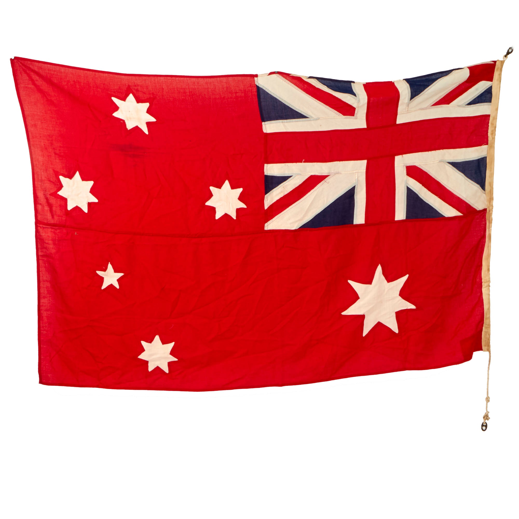 Original Item: Only One Available. The Australian Red Ensign is the civil ensign of Australia, the flag of nationality flown by Australian registered ships. It is a red version of the national flag, which is mainly blue. Both flags resulted from the Commonwealth Government's 1901 Federal Flag Design Competition which required two entries: an ensign for Commonwealth Government use and another for the merchant navy. The winning design for the merchant ensign was based on the traditional British Red Ensign and featured the Southern Cross and Commonwealth Star.
