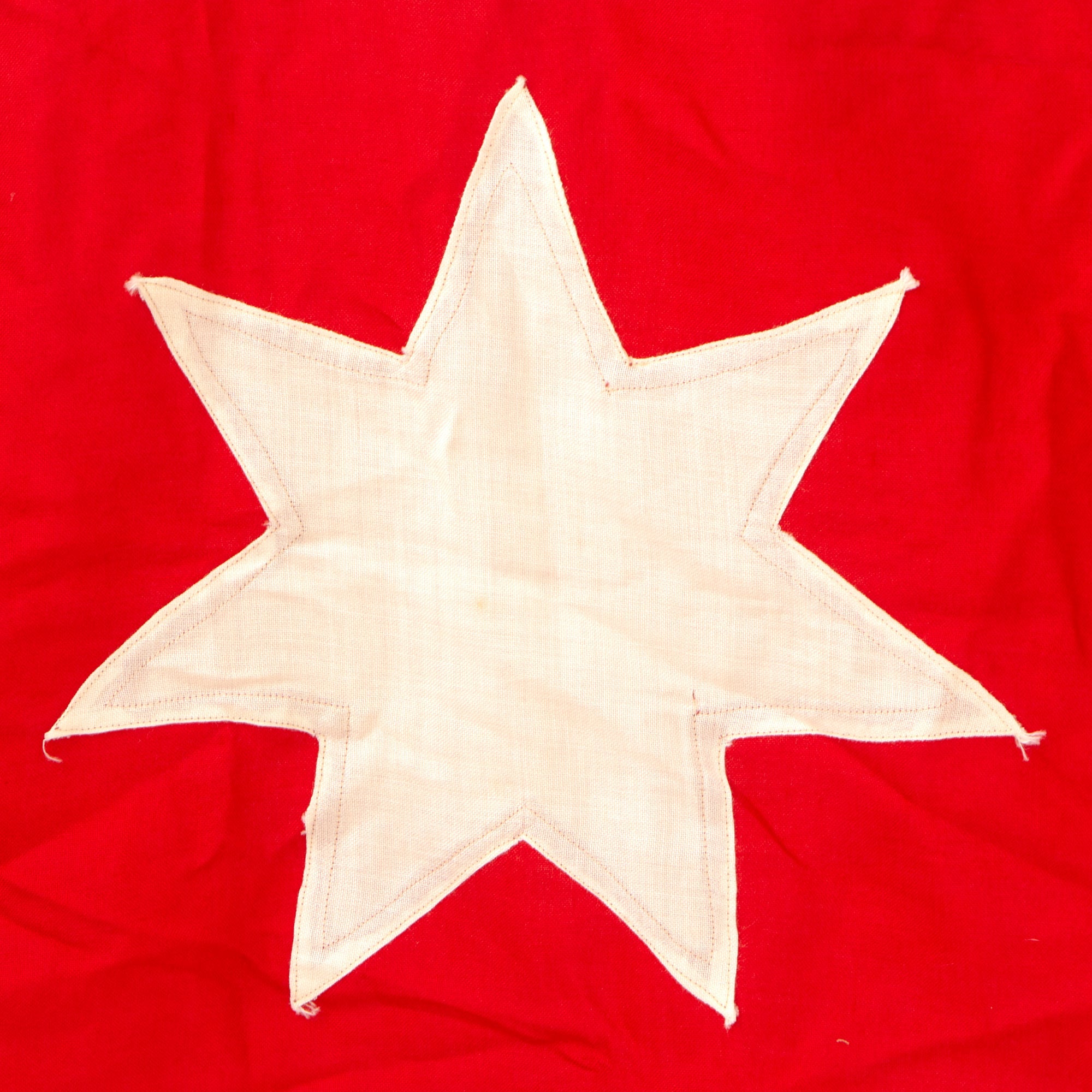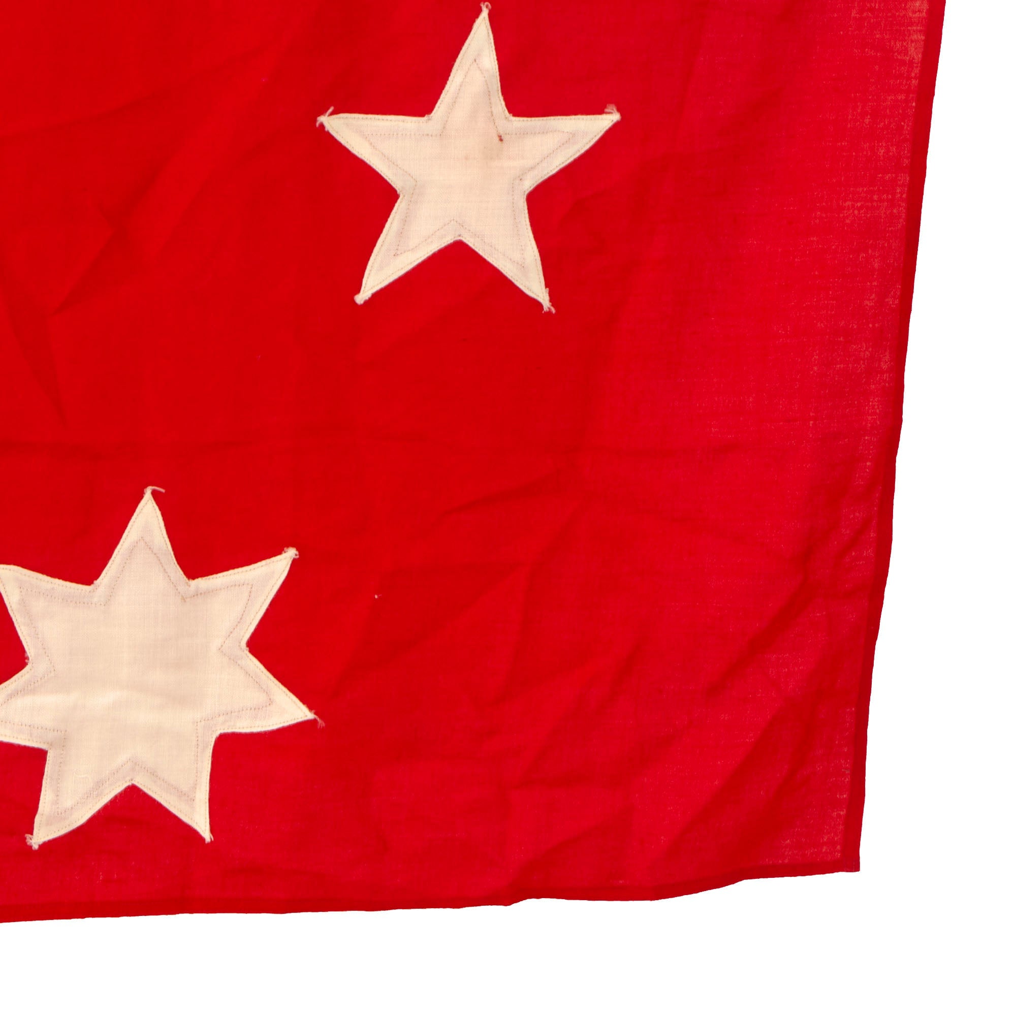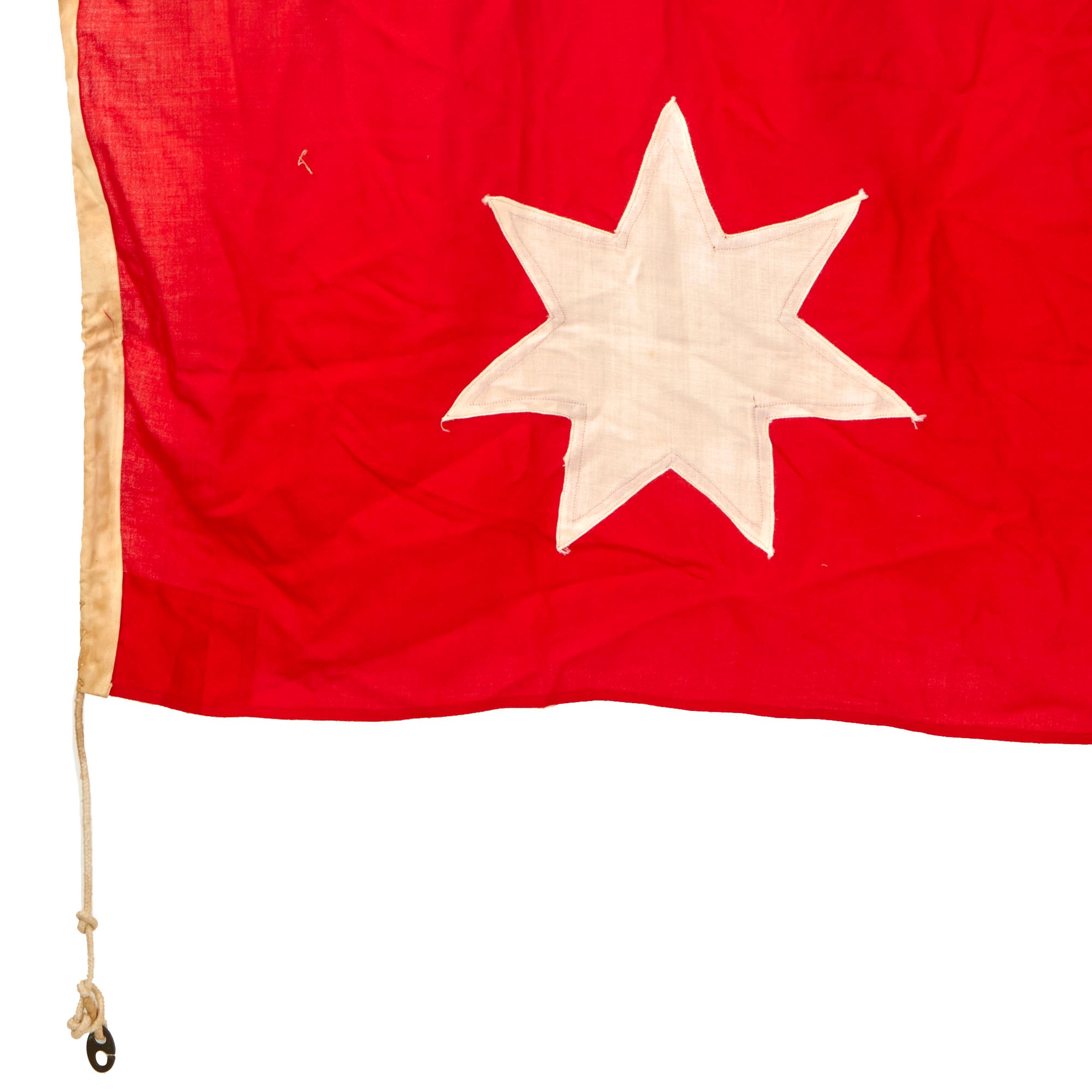 This large flag measures approximately 45" x 72” and is offered in wonderful, worn condition. The heavy canvas construction is dyed and multi-piece, with the Union Jack and stars being individual pieces. There is wear and a few scattered holes present as well as tearing, evident signs of actually being flown for service.