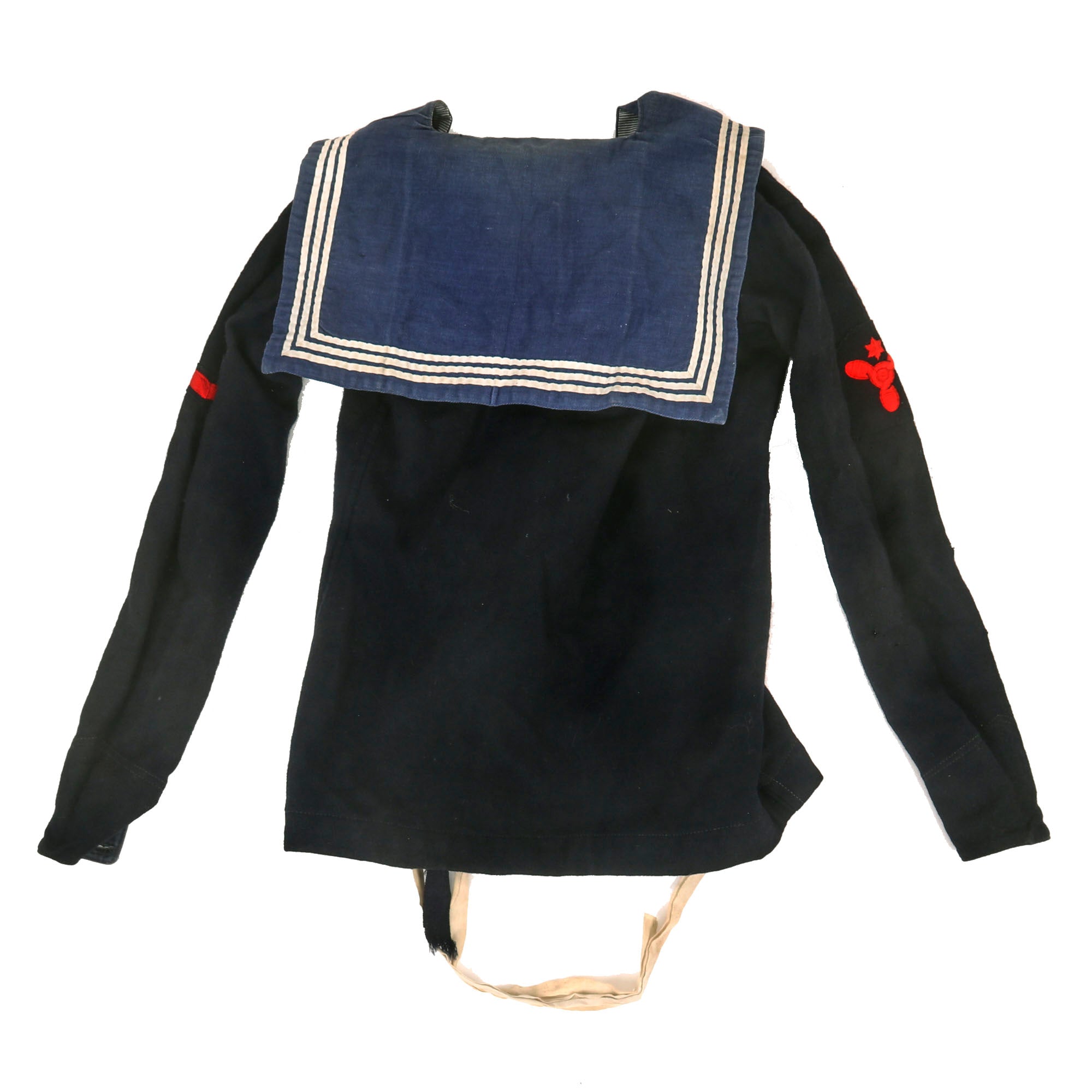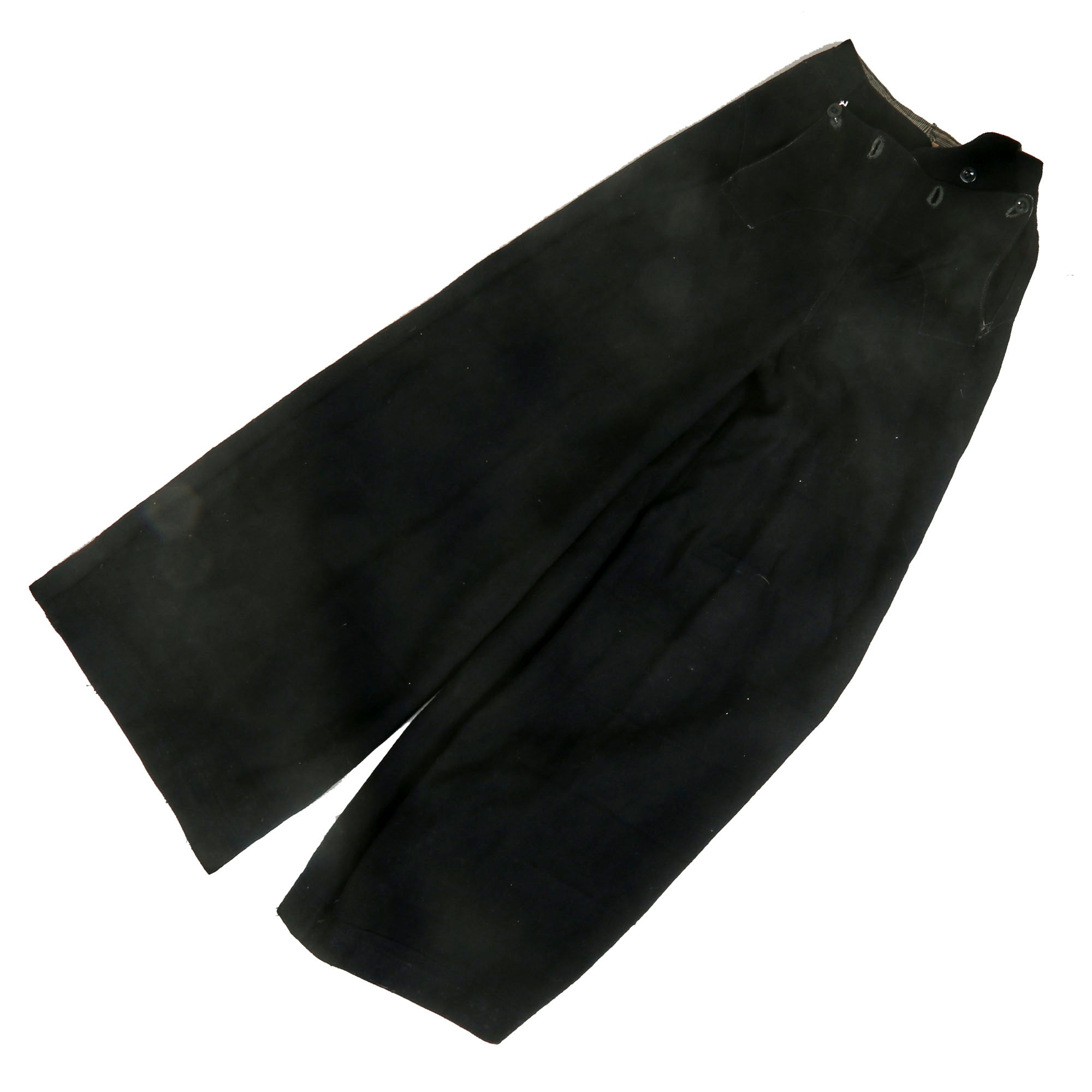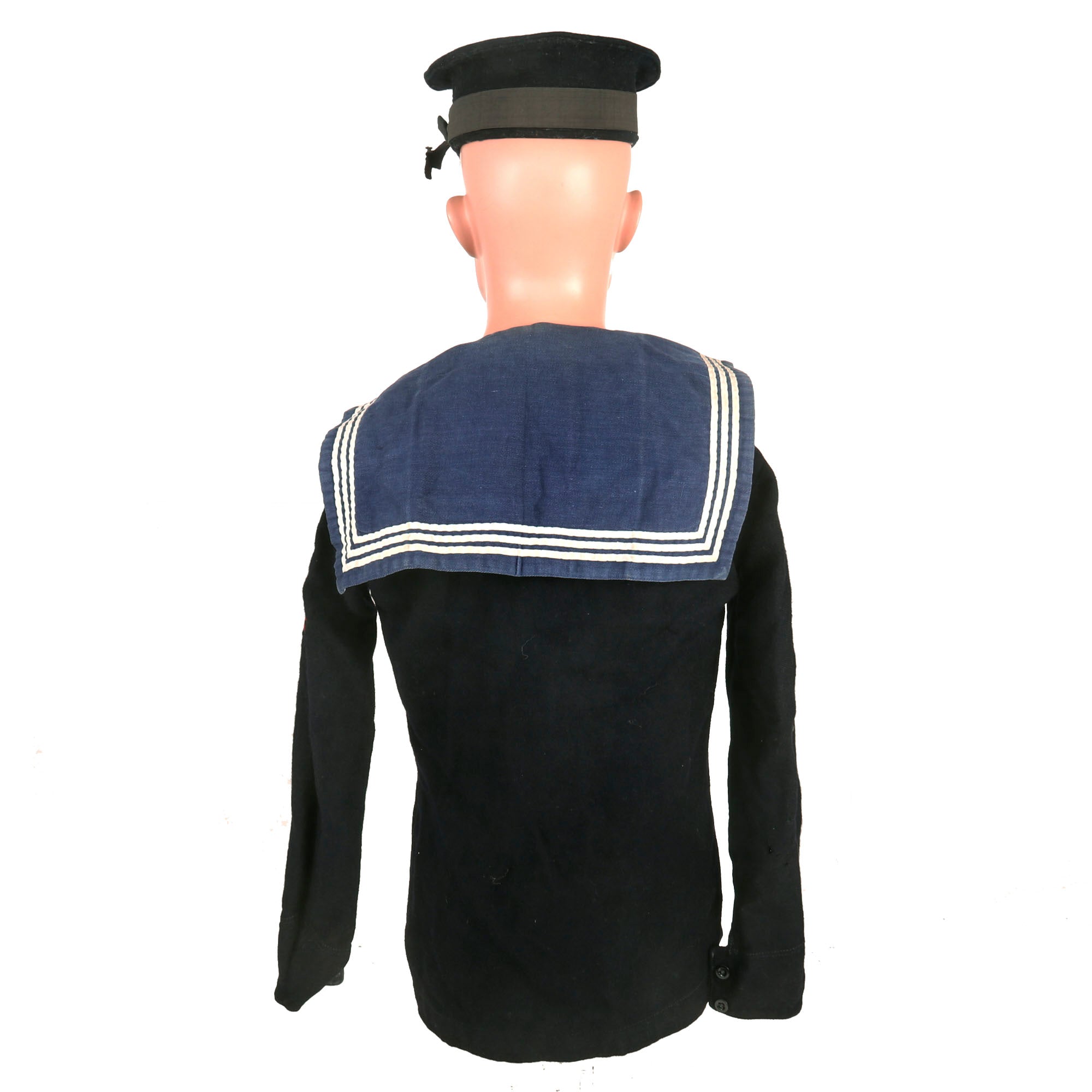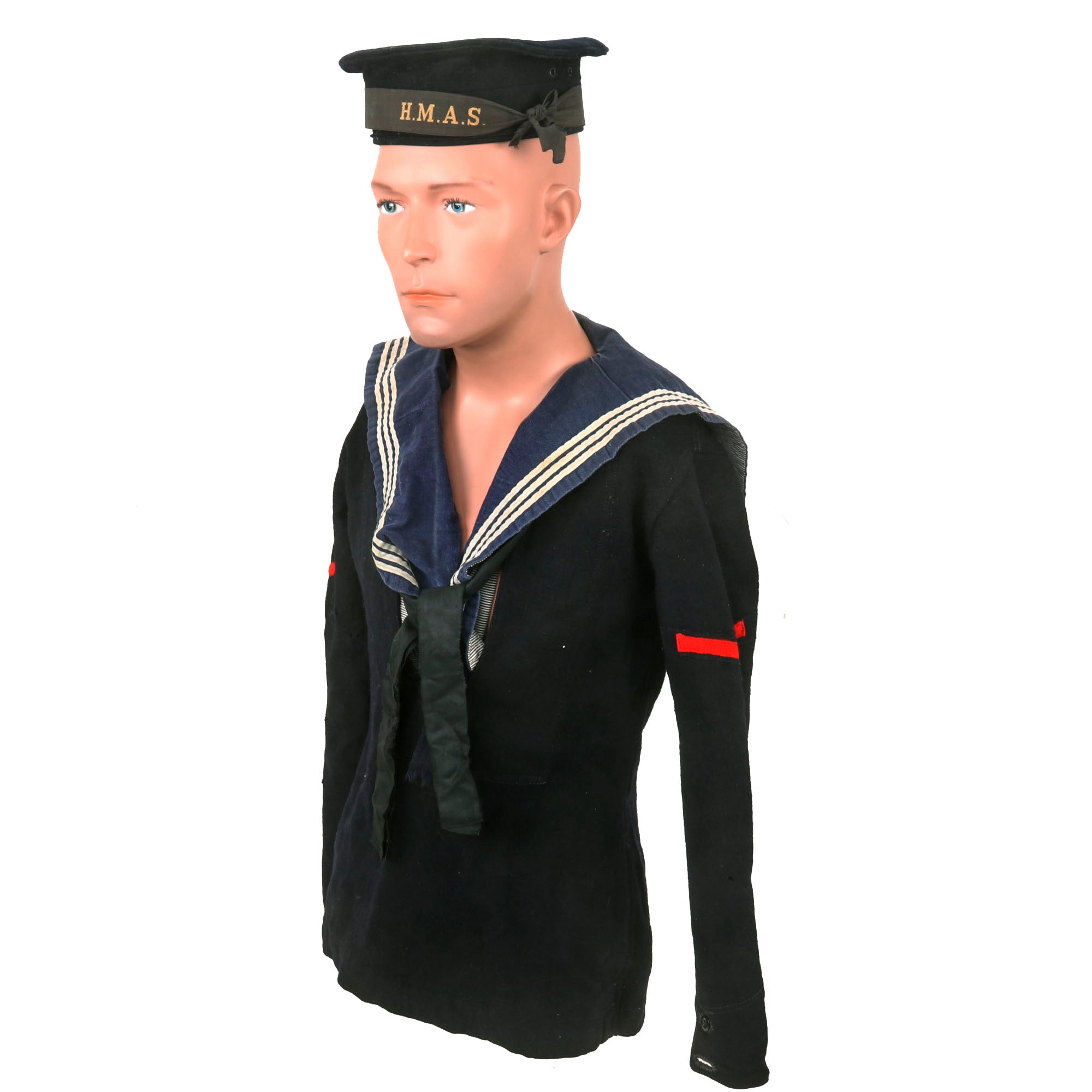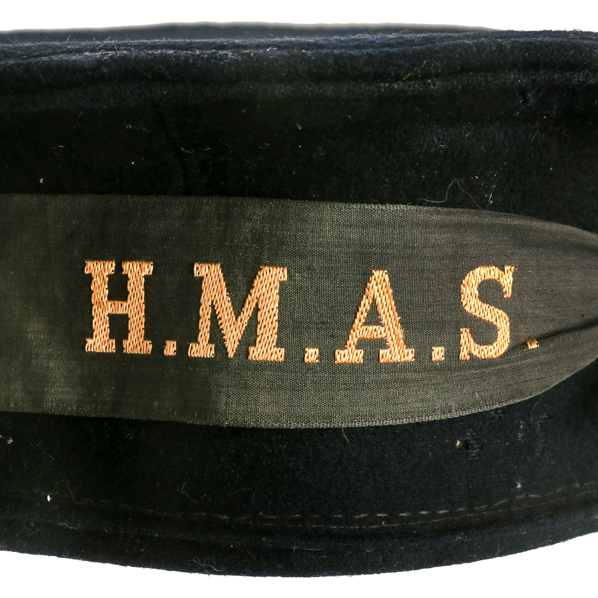 Original Items: Only One Set Available. This is a wonderful uniform that belonged to a member of the Royal Australian Navy (RAN) during the Second World War. The uniform consists of a blue hat, affectionately known as a "duck cap", and a black silk ribbon encircling its base. The ribbon served to identify the name of the ship to which the wearer was assigned. It was a common practice for RAN personnel to wear such ribbons to show their affiliation with a particular vessel. However, during the latter part of the war, many ribbons bore only the letters "HMAS" or "RAN" for security reasons, as seen on this example.