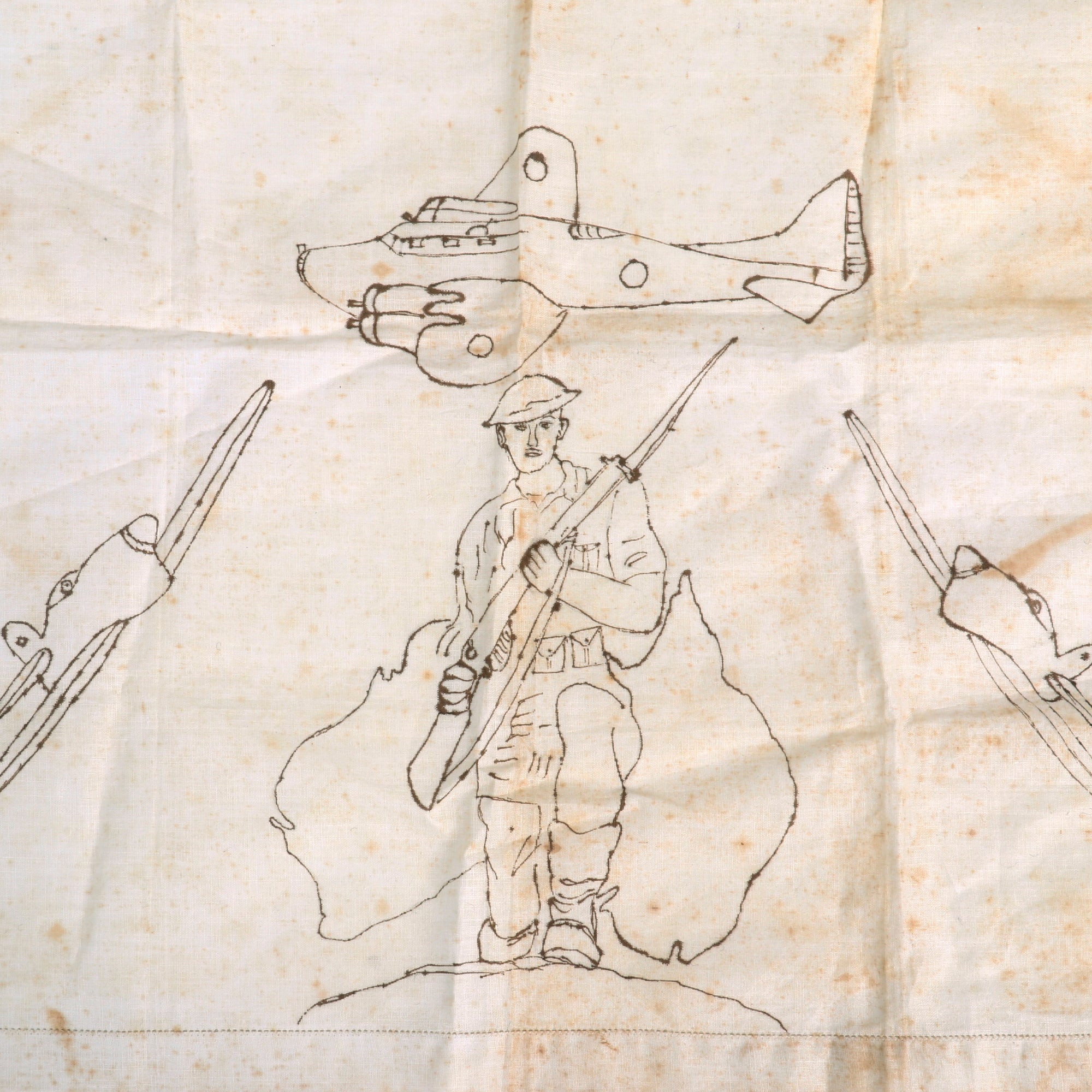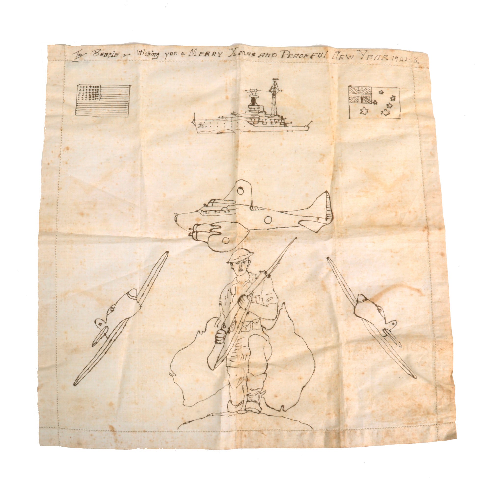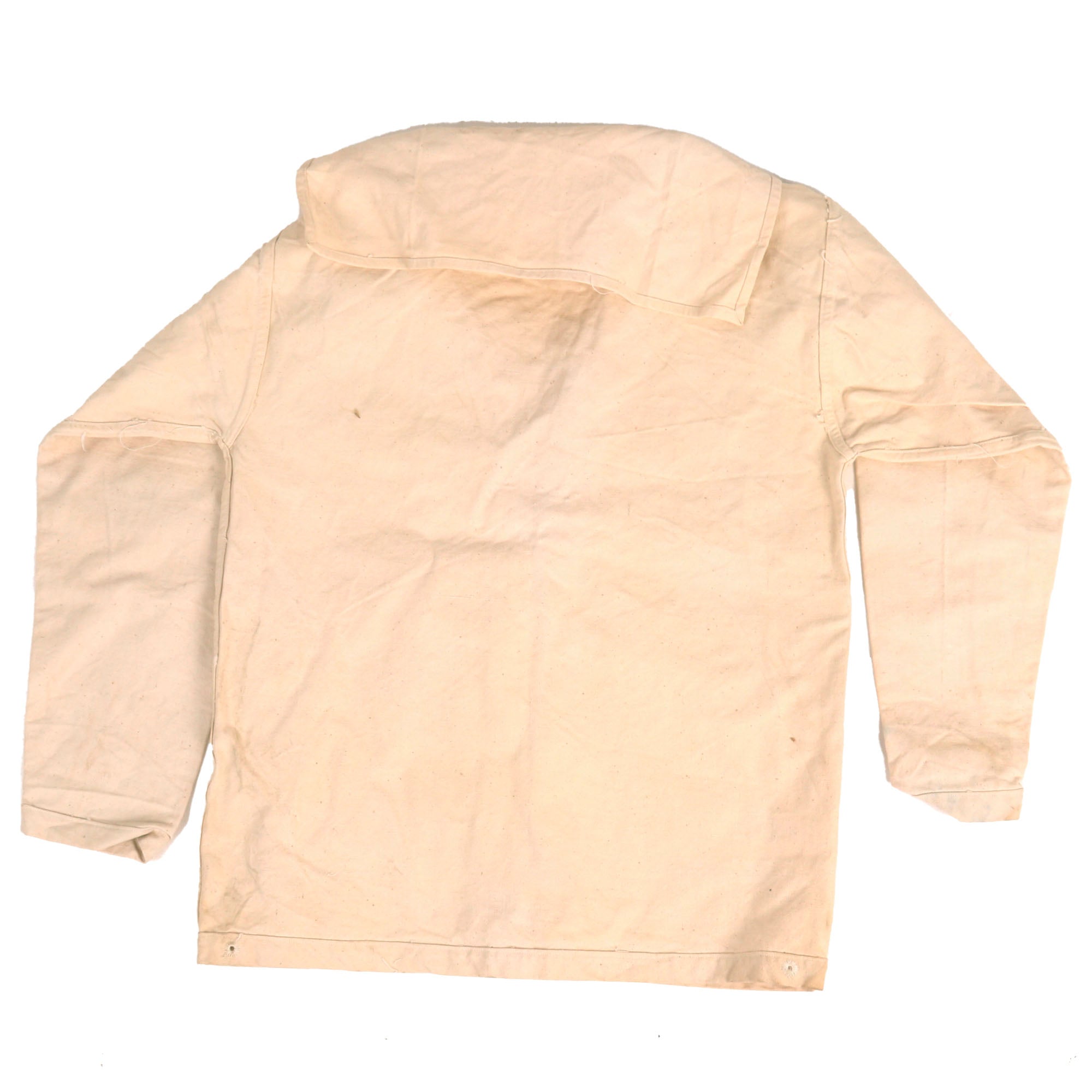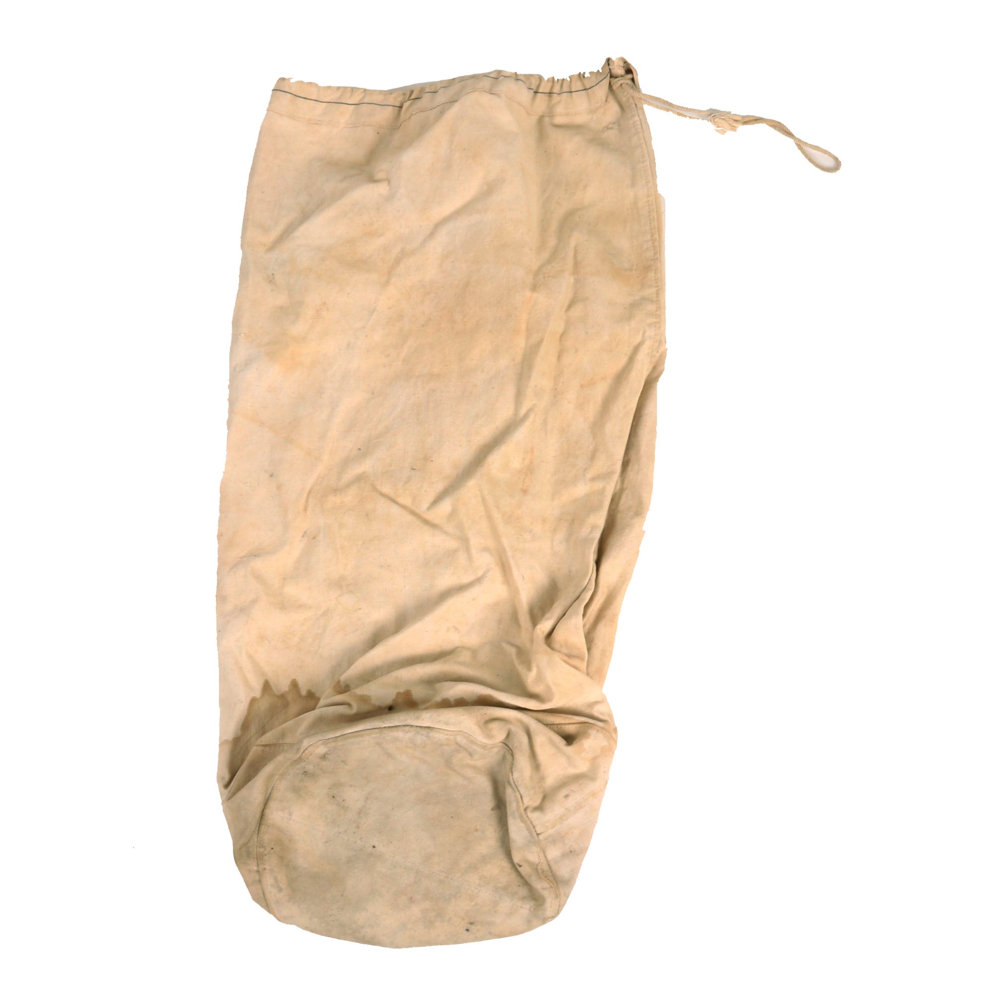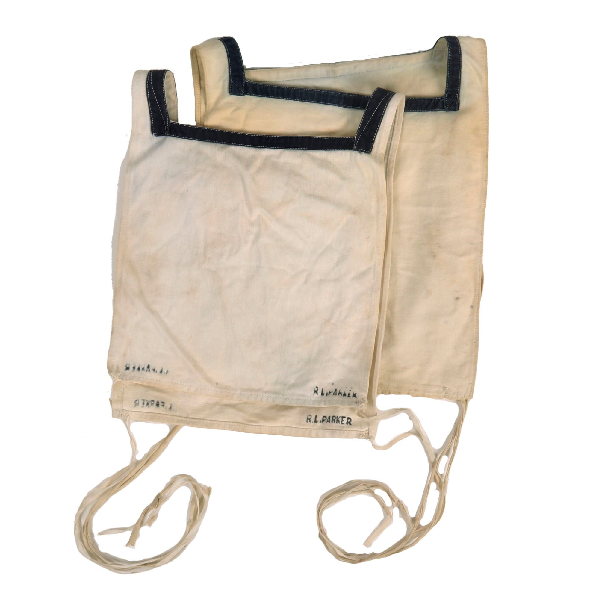 This uniform set is a complete package that includes a "jumper" with a scarf and specialty patches, trousers, a "Donald Duck" Cap with HMAS tally, a white sea bag, a white jumper, and "bring back" items. Every item in the set is in wonderful condition, but it is worth noting that some moth nips and staining, especially on the white articles of clothing, may be present. Despite this, there is no significant damage to the uniform set, although it does appear to have been used during the war. As a result, minor imperfections such as discoloration, fading, or wear and tear are expected.