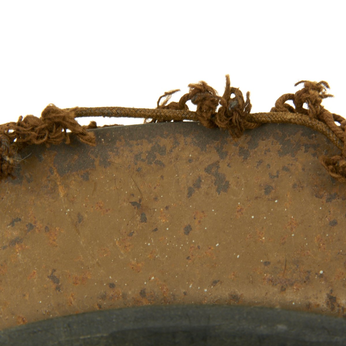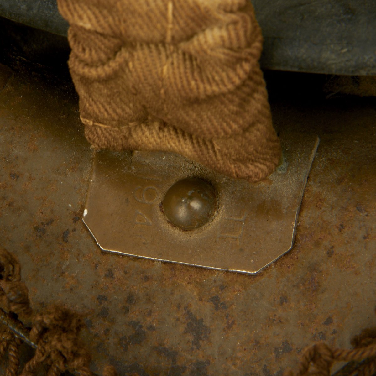 CS. stands for Commonwealth Steel Company in Australia, who in conjunction with Lysaghts began production in 1939. The chin strap lugs in Australian helmets are where the date was located, as the number by the manufacturer is the serial number. This example is dated 1940 on both chin strap lugs. The paint appears to be in very good condition, and is the original sand textured Australian Army Khaki-Green No.3, with a number 4 painted on the front. Shell is overall in great shape with no major issues. There is no rim reinforcement, as there was no machinery in Australia available to bend the manganese steel strip. The original liner is also in excellent condition and reads: