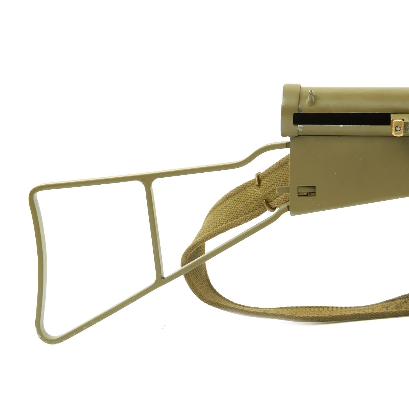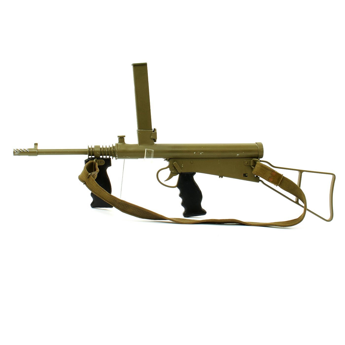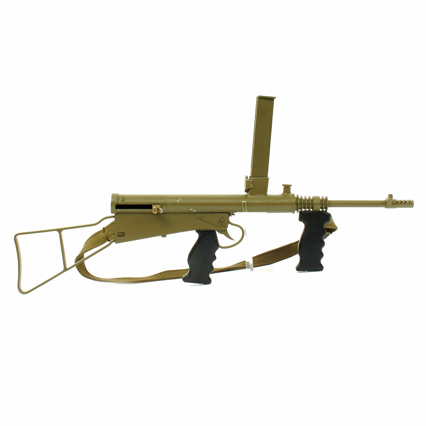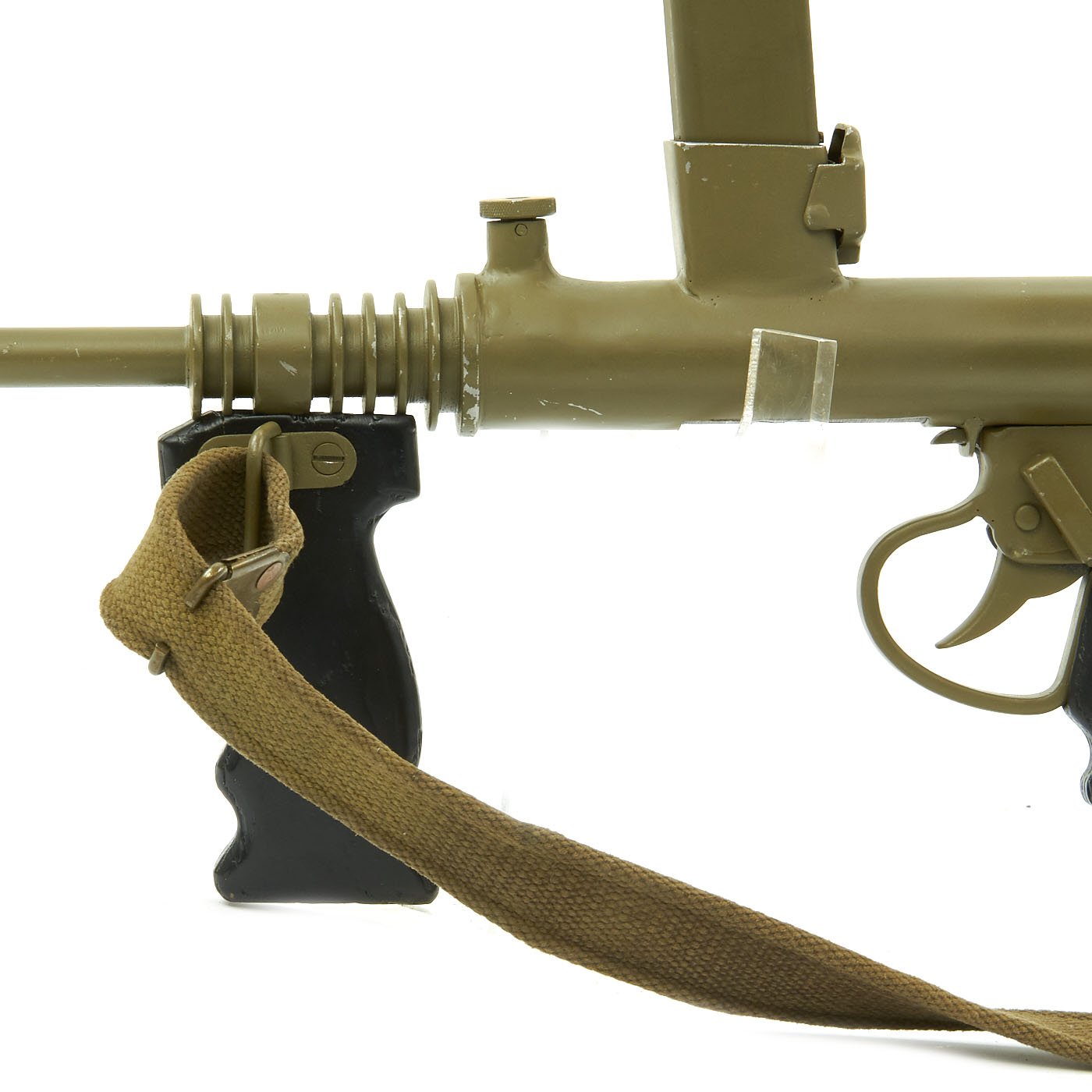 Features all original 1942 produced parts including removable skeletal loop style butt stock (later productions used a large wood butt stock), bakelite grips, rare 9mm Owen magazine (where permitted), and BATF compliant non-firing receiver. This example has been painted a very nice olive green color, which gives it a very striking look. Ready to add to your collection!