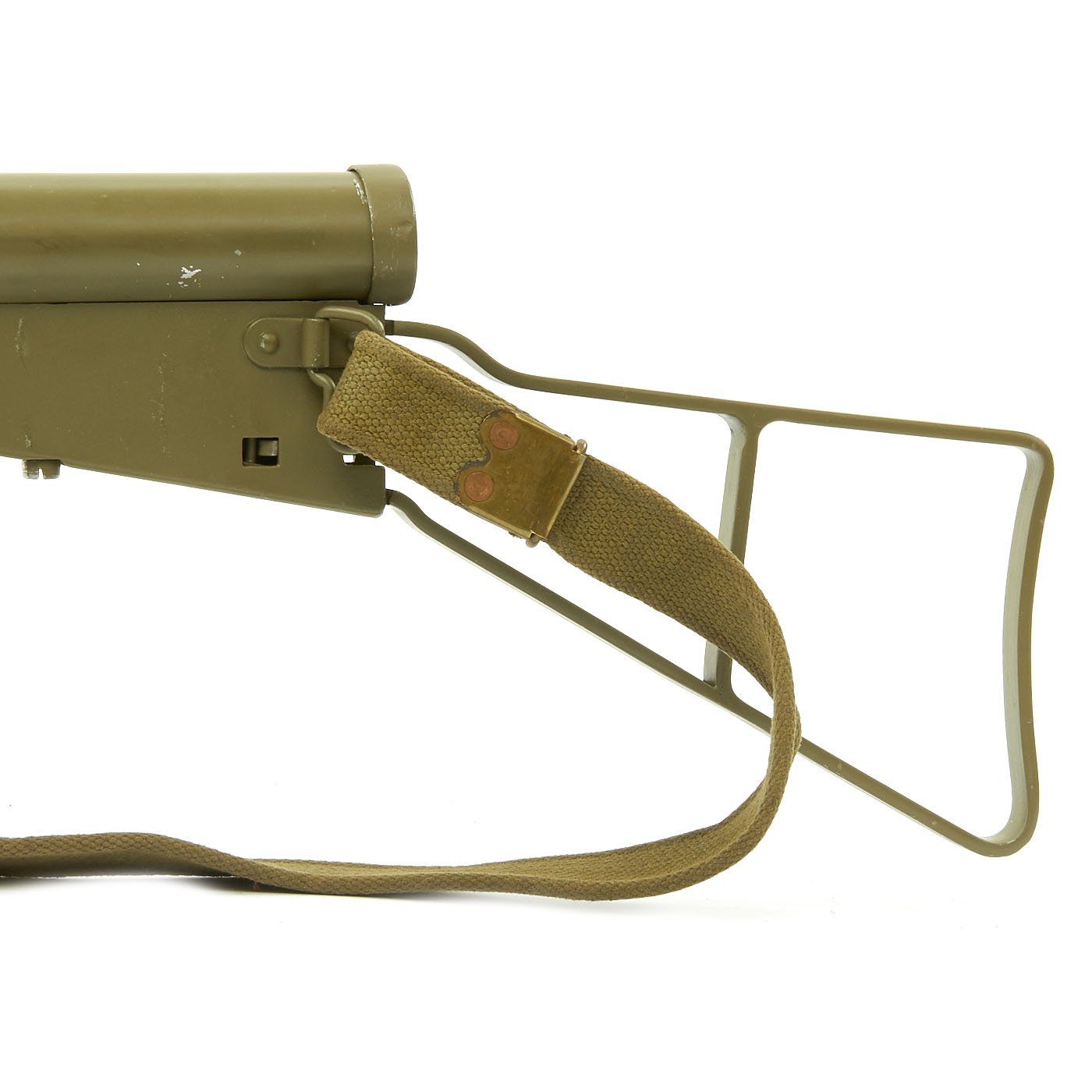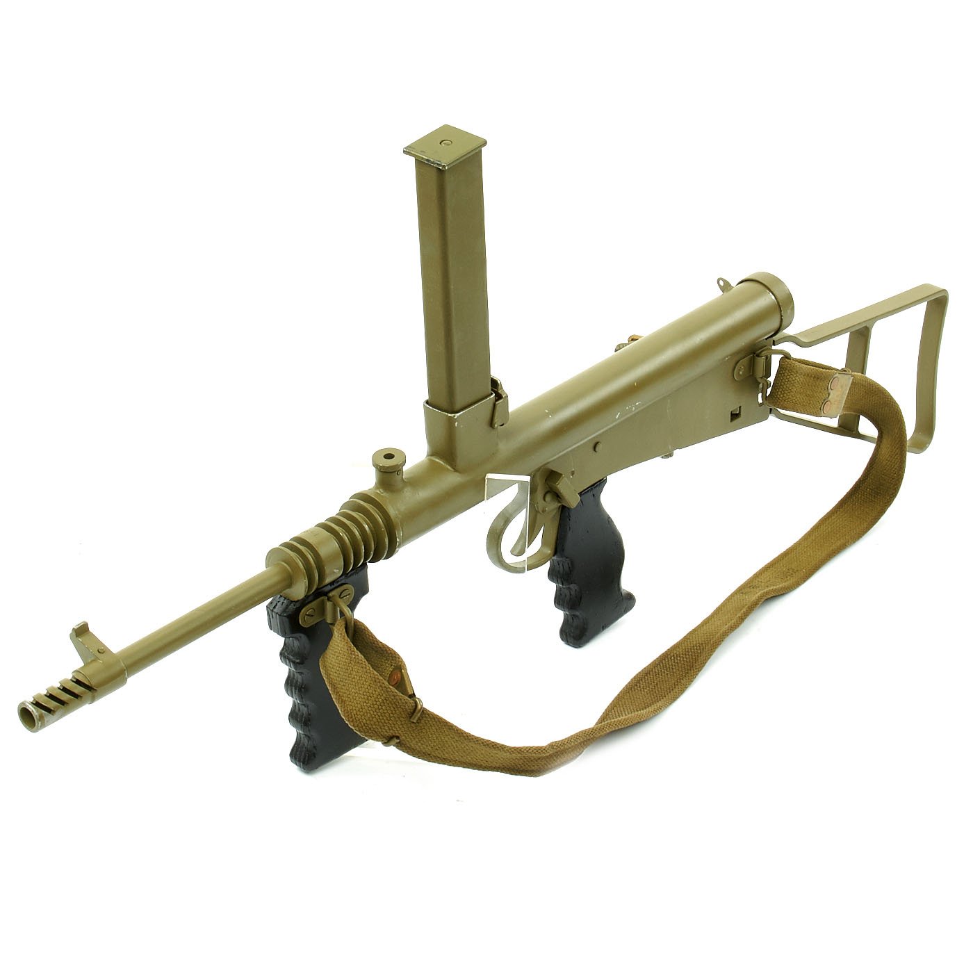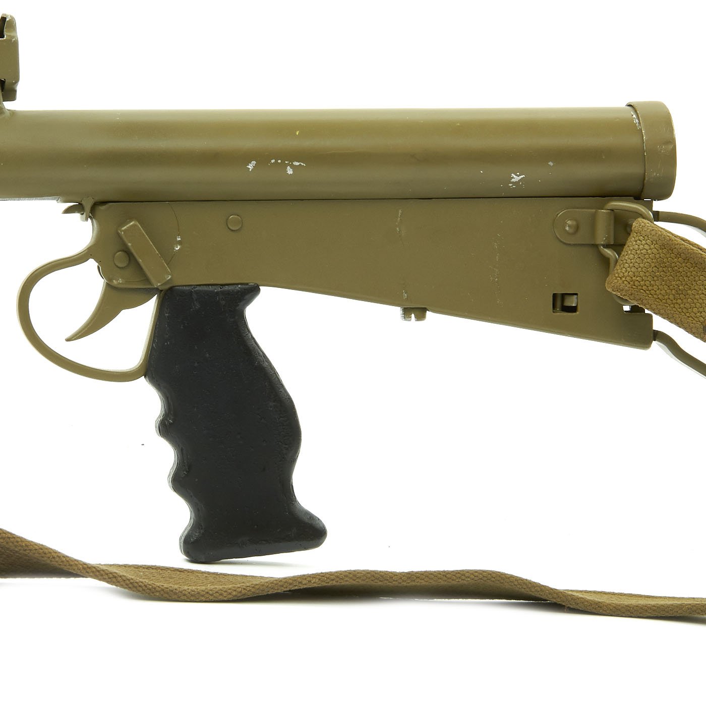 Features all original 1942 produced parts including removable skeletal loop style butt stock (later productions used a large wood butt stock), bakelite grips, rare 9mm Owen magazine (where permitted), and BATF compliant non-firing receiver. This example has been painted a very nice olive green color, which gives it a very striking look. Ready to add to your collection!