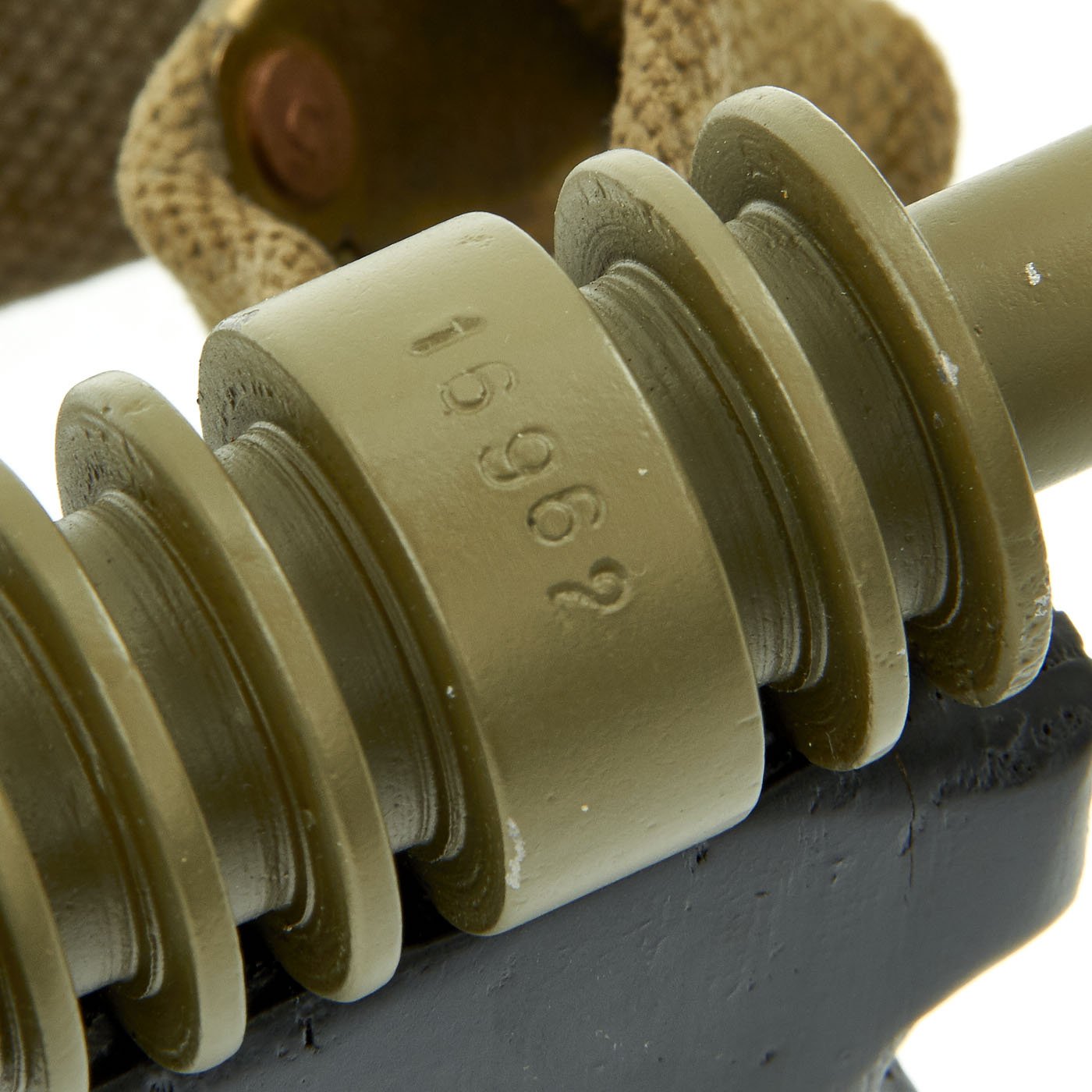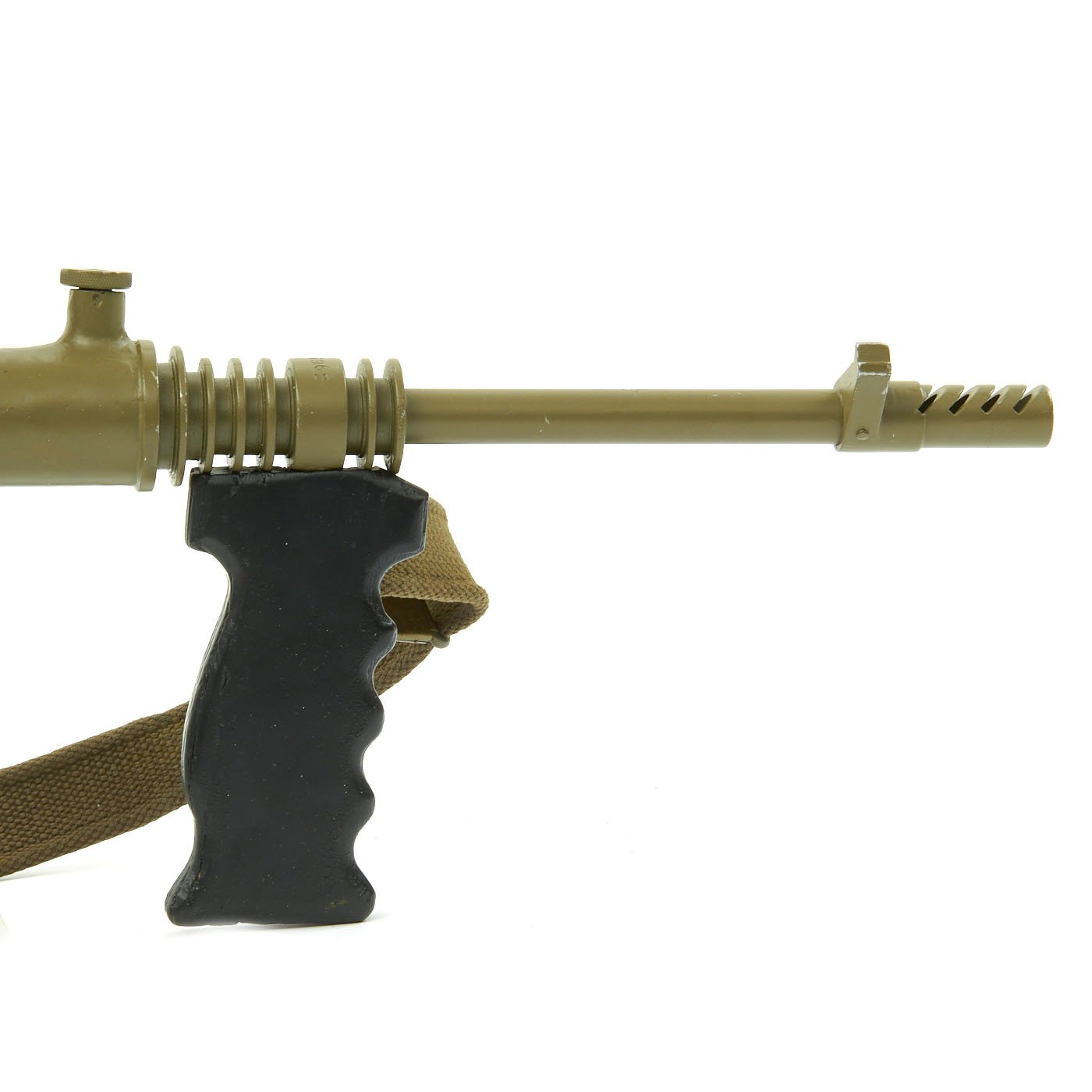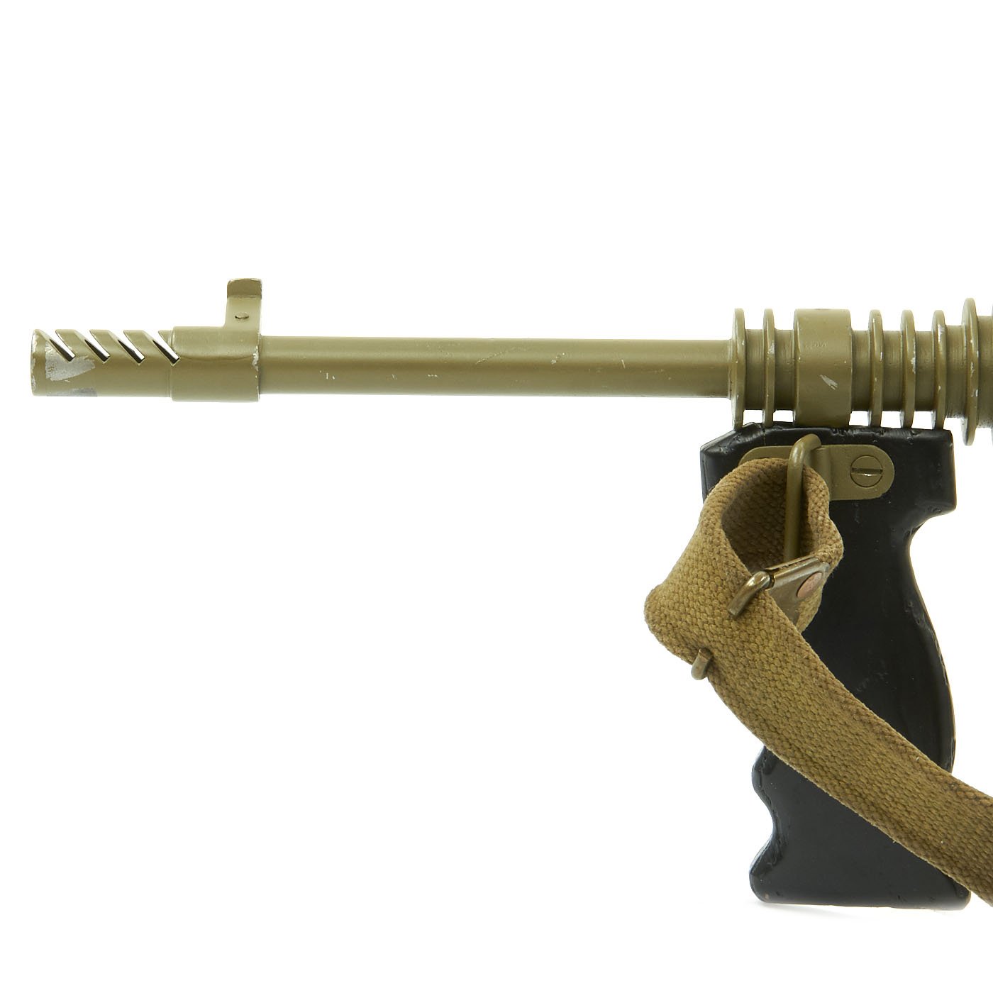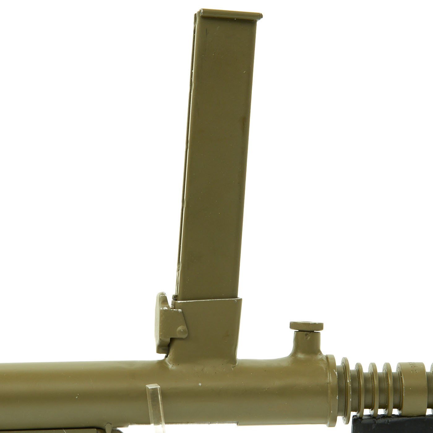 Features all original 1942 produced parts including removable skeletal loop style butt stock (later productions used a large wood butt stock), bakelite grips, rare 9mm Owen magazine (where permitted), and BATF compliant non-firing receiver. This example has been painted a very nice olive green color, which gives it a very striking look. Ready to add to your collection!