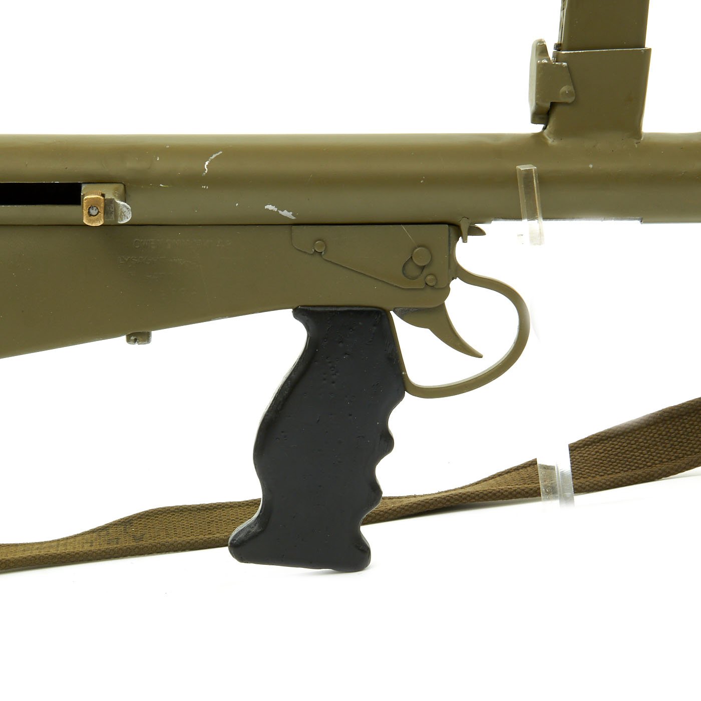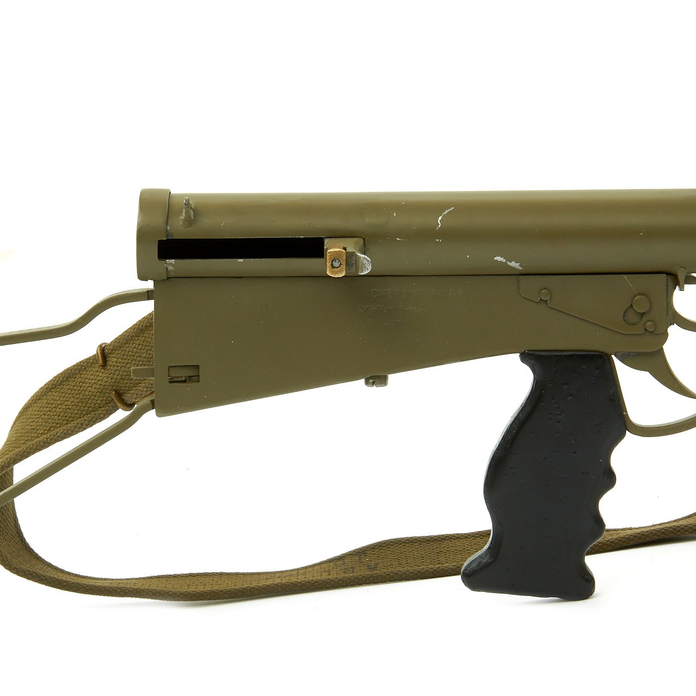 Original Item: Only One Available. This is an incredibly rare magnificent non-firing display gun built from 1942 dated Owen Gun parts and reassembled with a beautiful non-firing BATF compliant non-gun receiver. Every part on this display gun is original WWII manufacture other than the receiver, which has been completely replaced except for the very front with the magazine well and barrel latch.