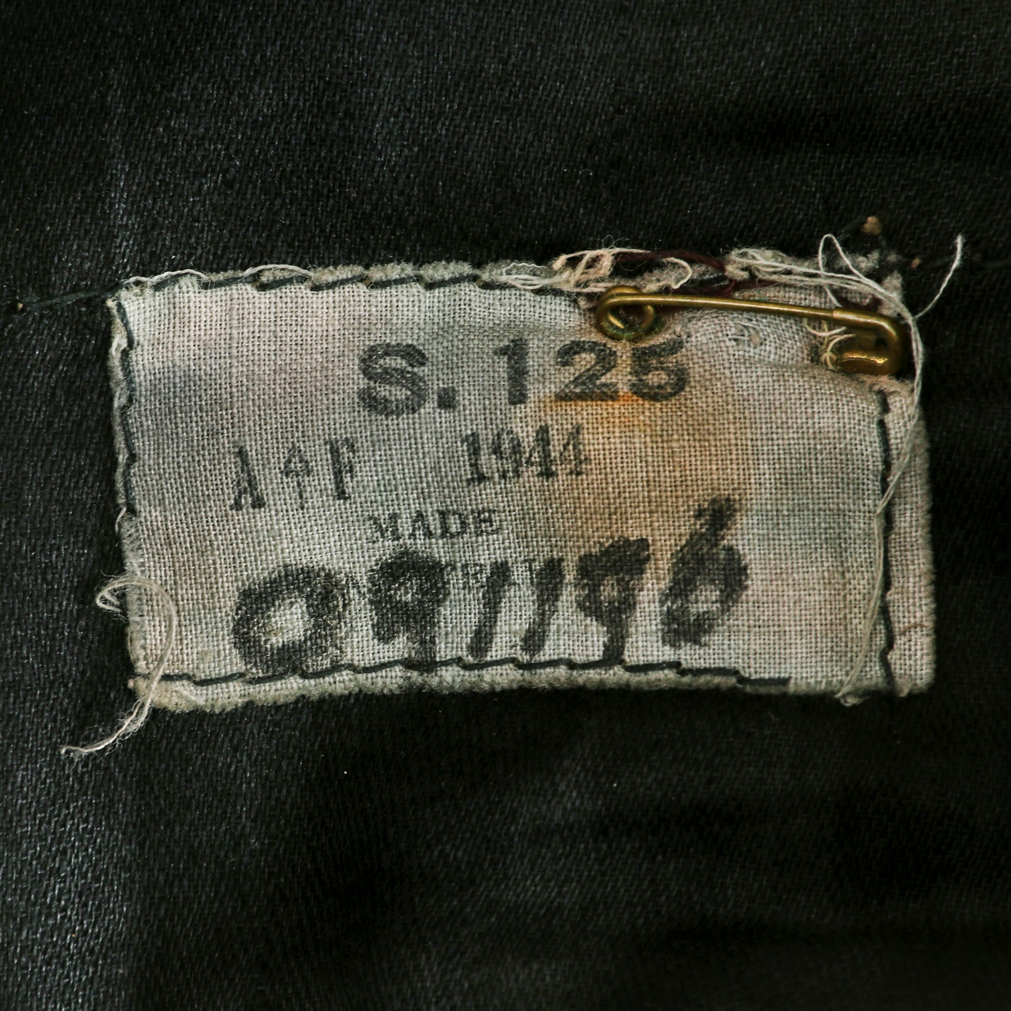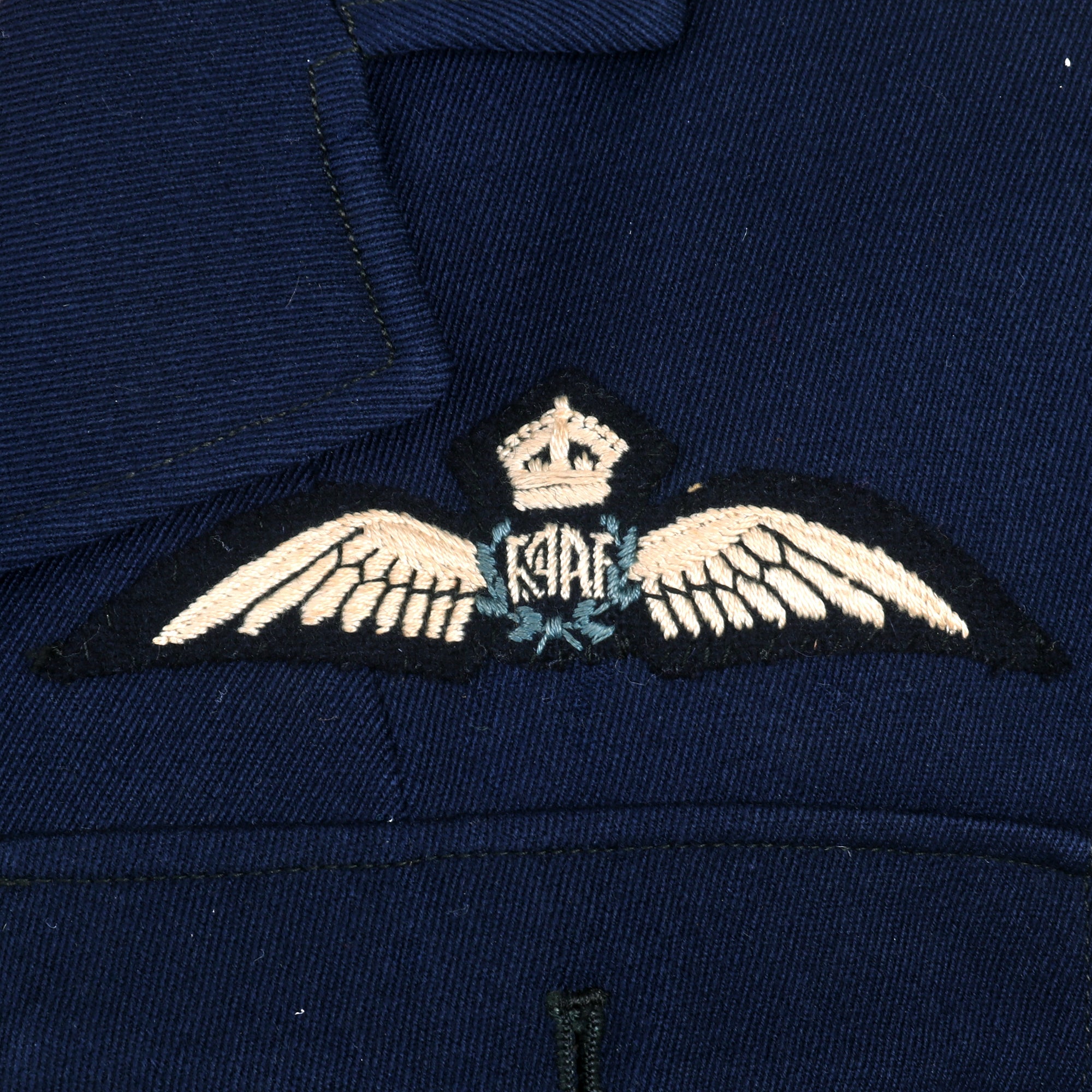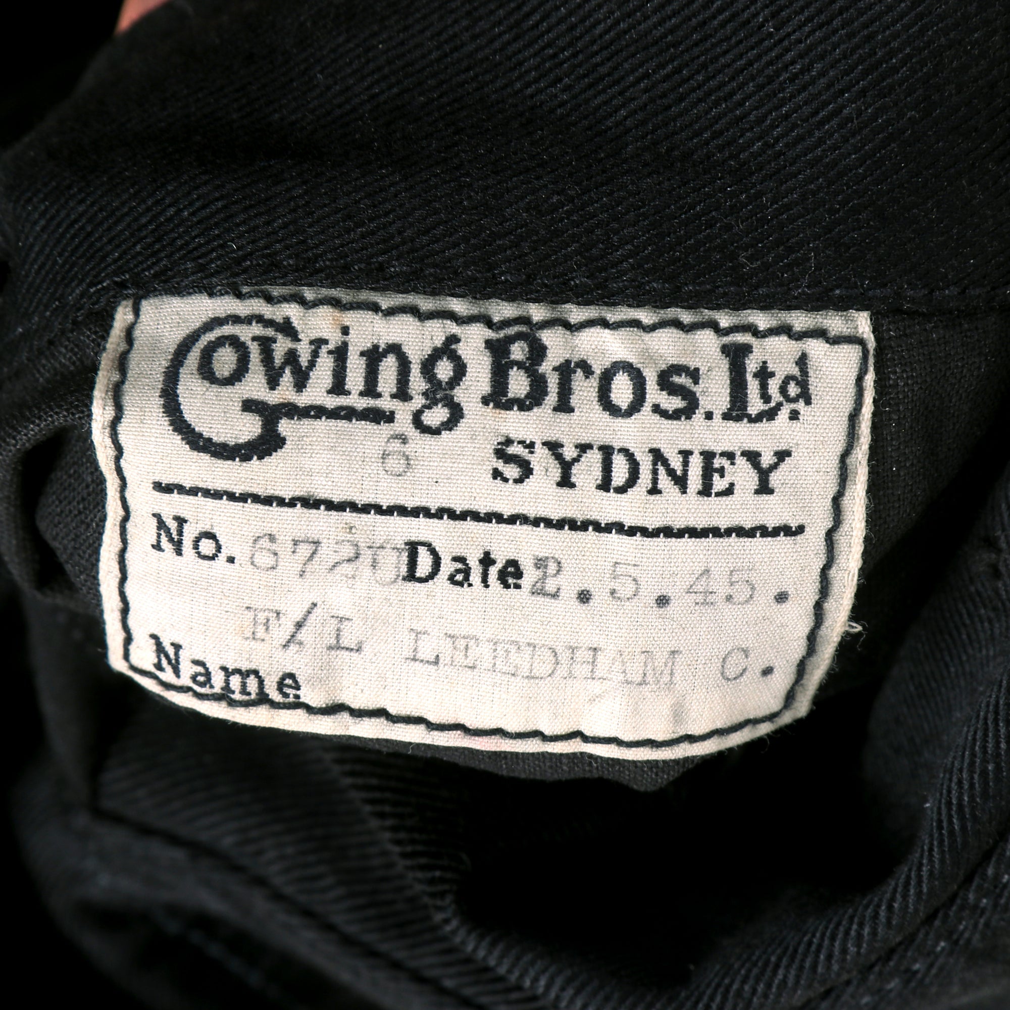 ● Royal Australian Air Force Officer’s dress uniform jacket & trousers with cuff ranks for a Flight Lieutenant and a set of RAAF Pilot’s wings above the left breast pocket. There is a nametag on the interior for Flight Lieutenant Leedham C., dated 2.5.45. The uniform was made by Gowing Bros. Ltd. in Sydney, Australia. The cuffs both have ranks for Flight Lieutenant with the Crown and eagle insignia above both cuffs. The trousers have a tag reading Size 10 AF Made in Australia. Both the jacket and trousers are in fair shape with some damage on the back of the jacket.