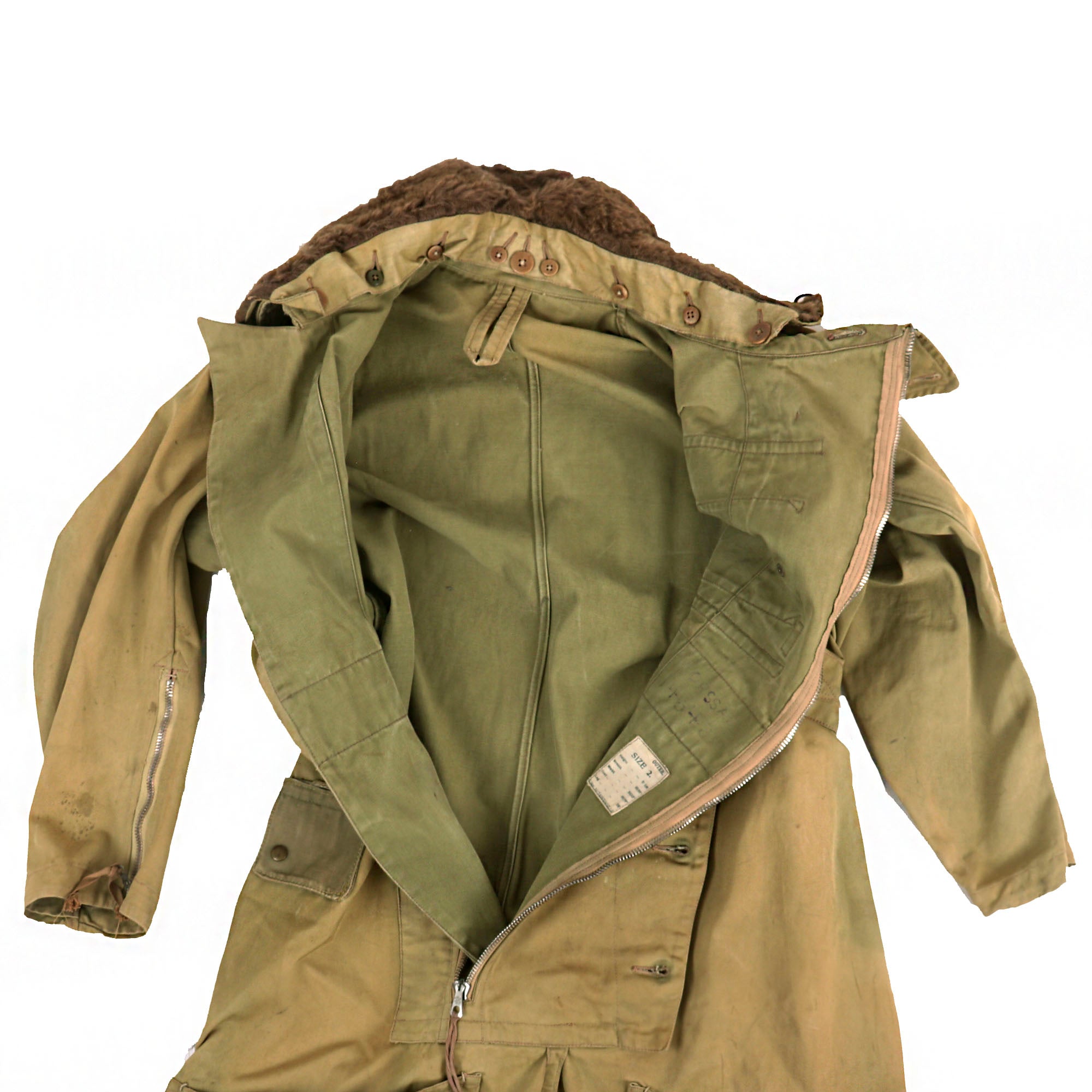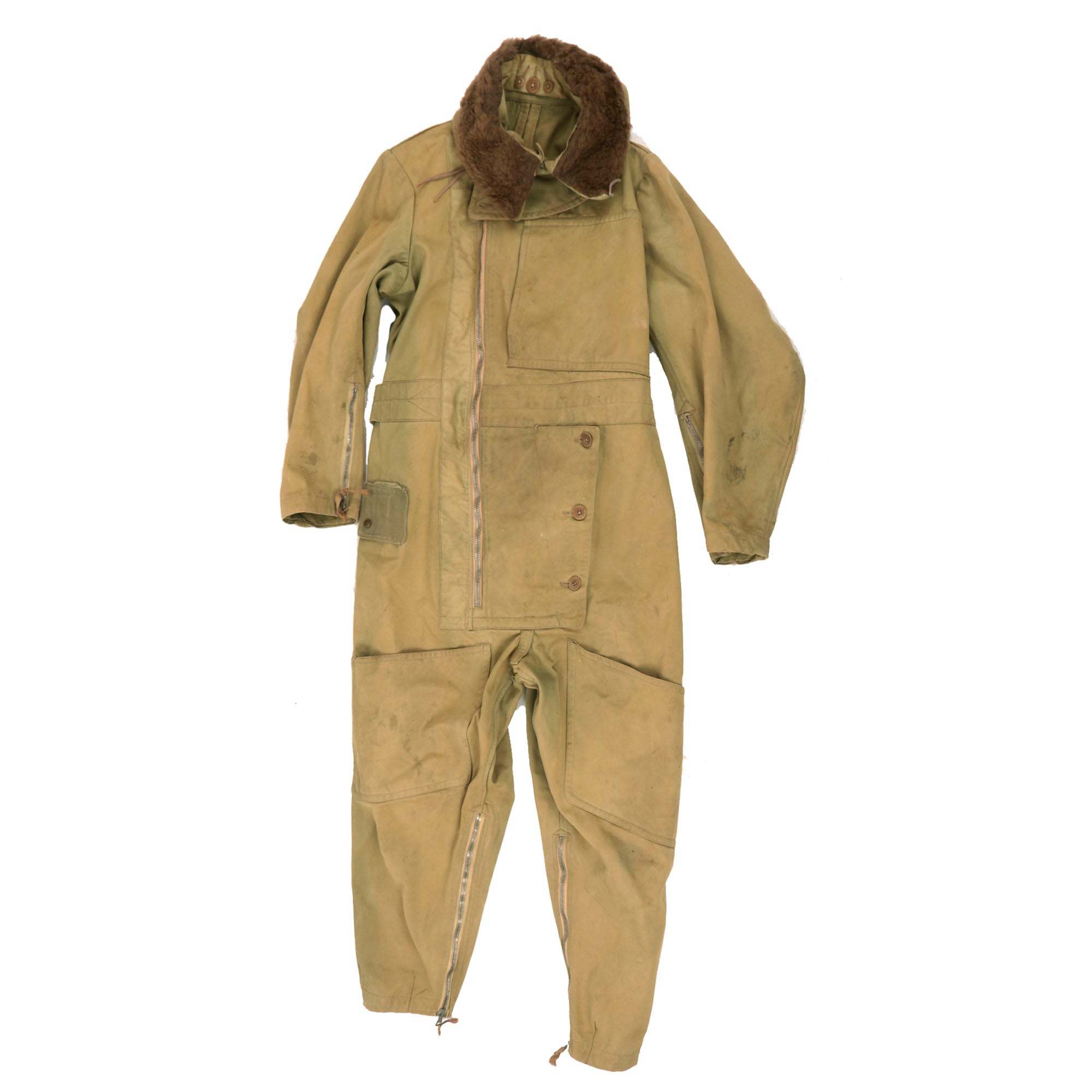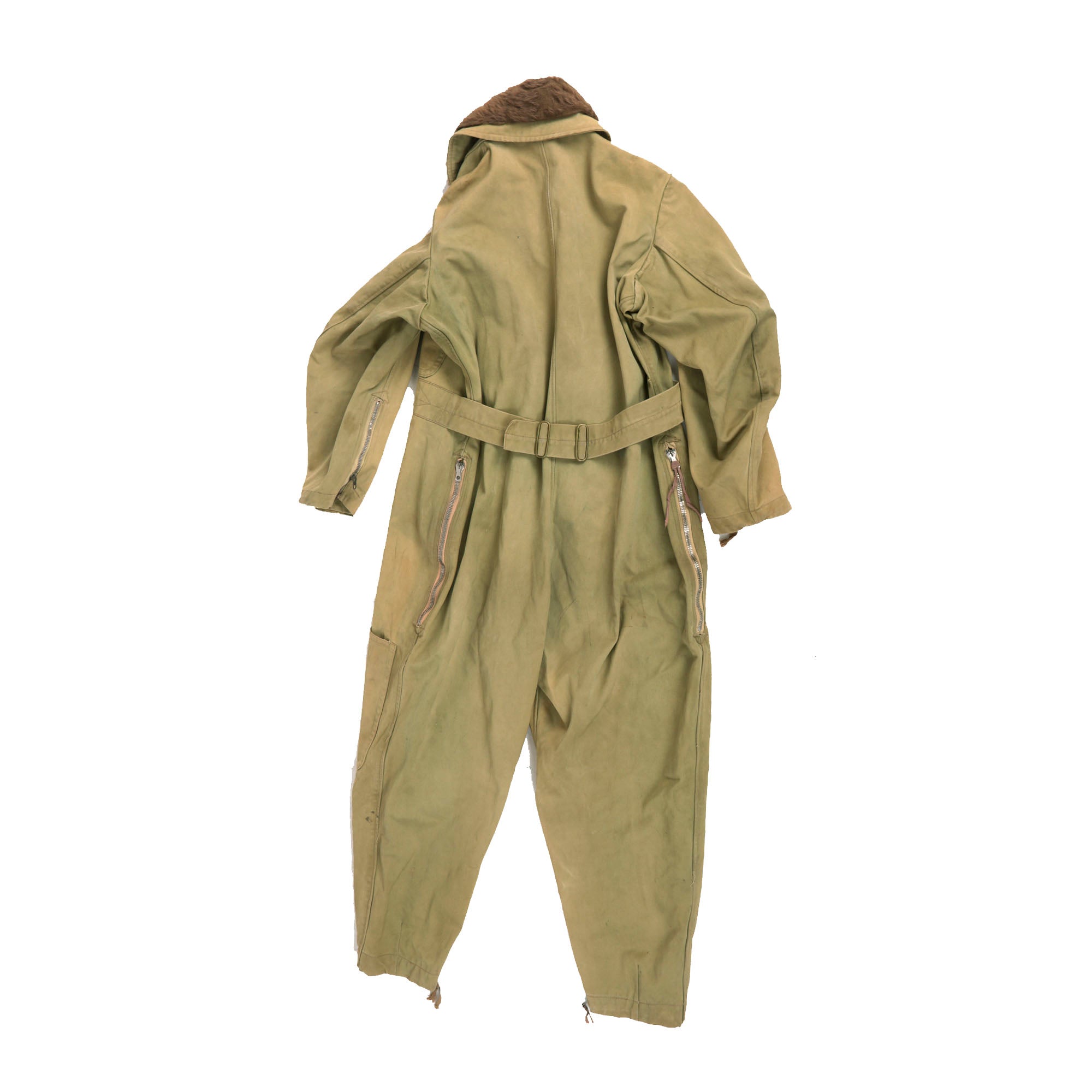 ● An Australian Air Force Flight Suit made in England. There is a tailor’s tag with the sizes of the suit Outer Size 2. Height 5’⅚”. Breast 33/35”. Waist 30/32”. Seat 35/38”. Leg 28”. The flight suit is in great shape with all its zippers retained, reading DOT MADE IN ENGLAND. The fur collar retains about 80% of its fur. The belt is fully retained.