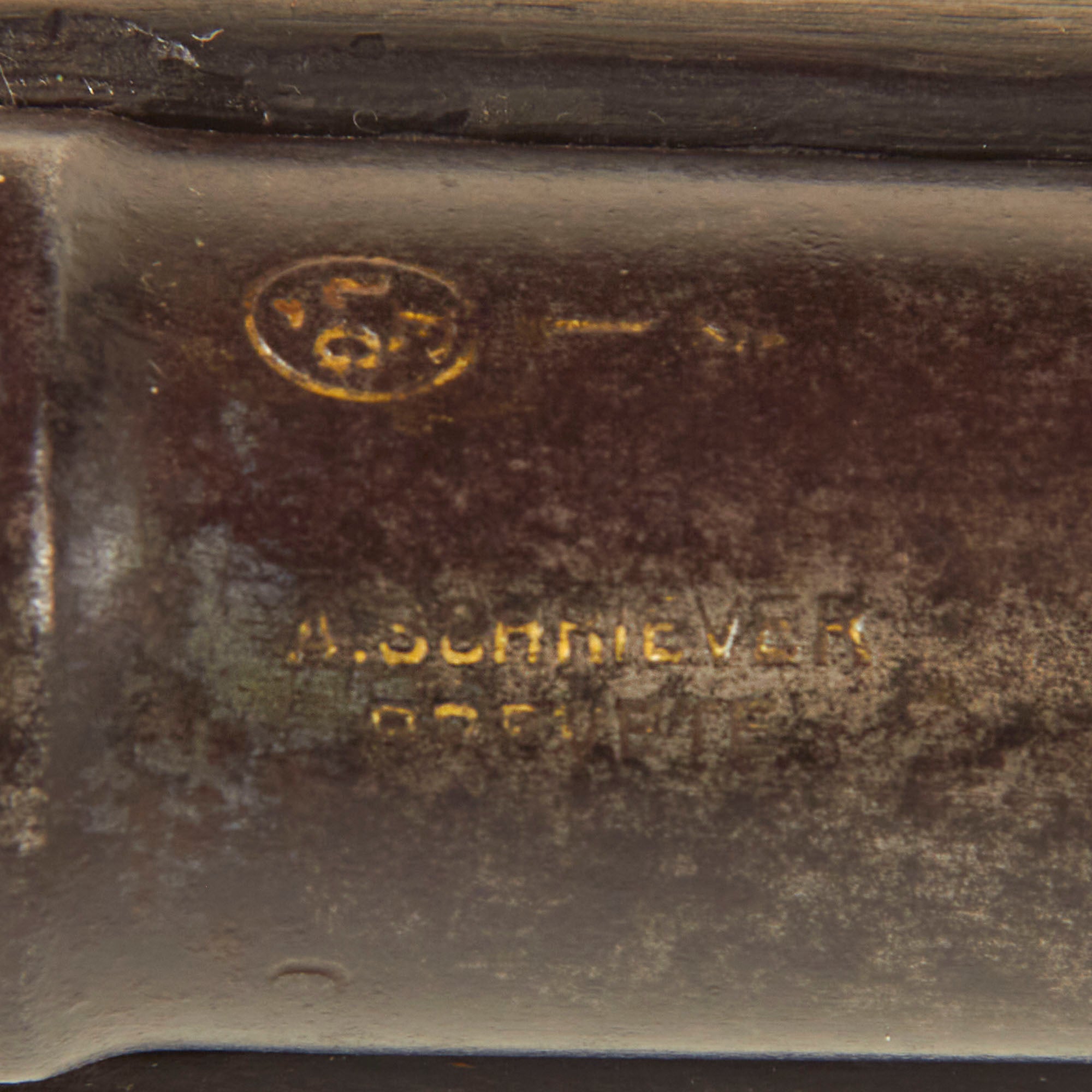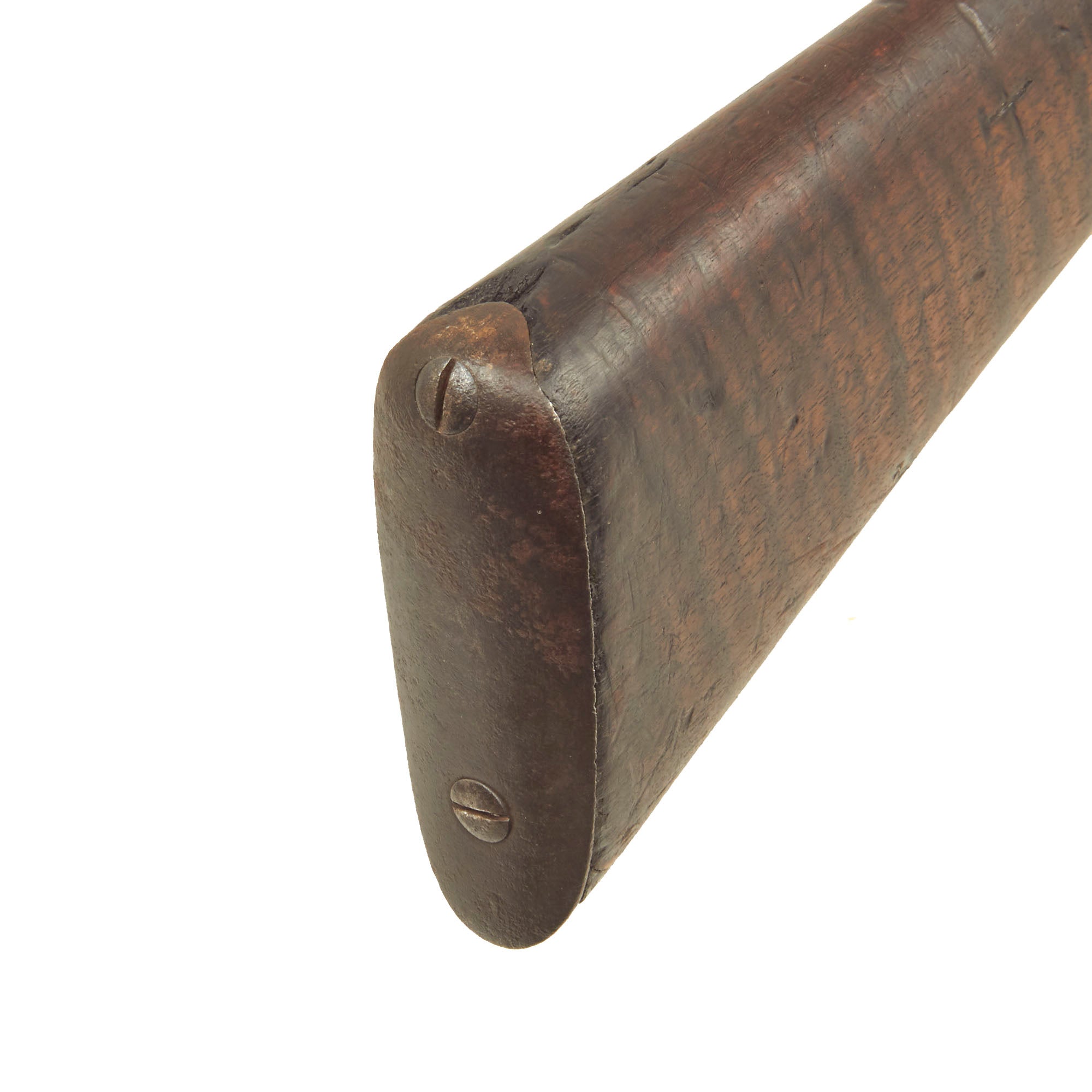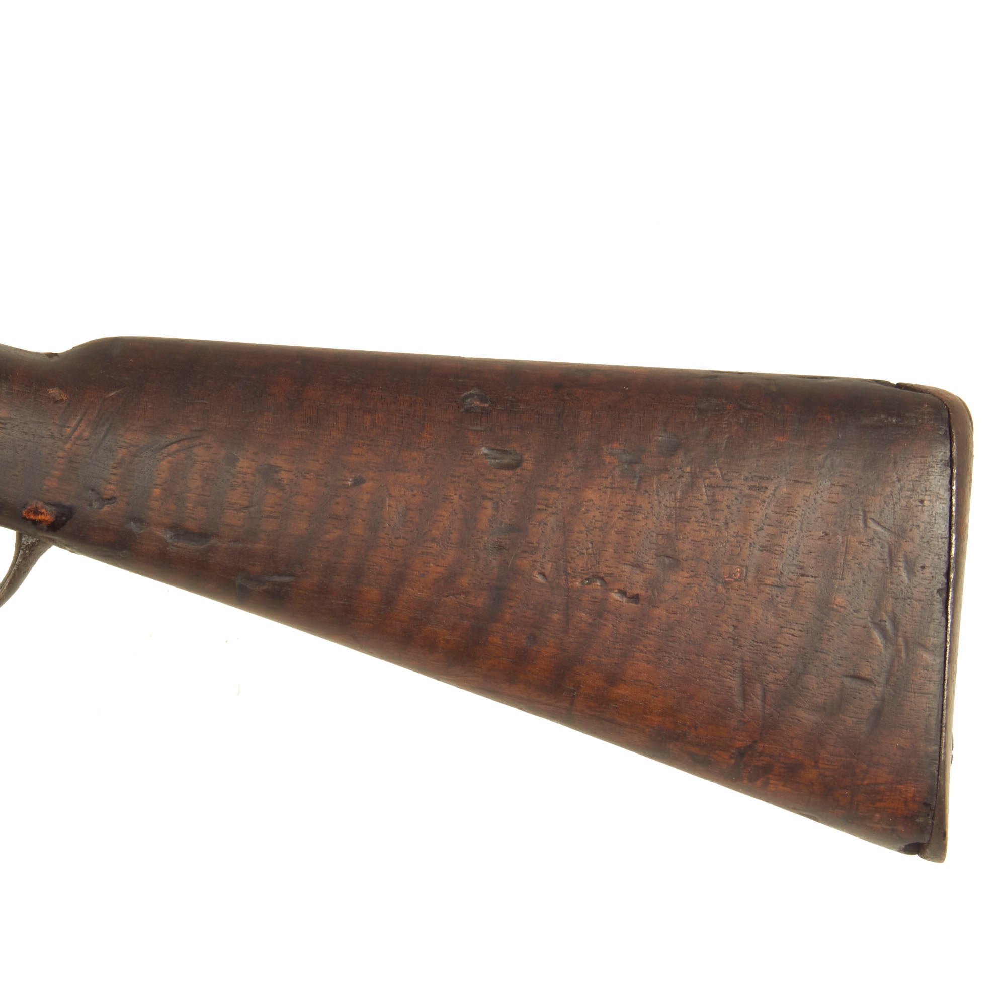 After the conversion, the rifle looks to have seen long service, and the exterior metalwork shows a well aged and peppery patina overall. The woodwork is relatively dark in color, showing dents and scratches from long service, though the butt stock does have some great "tiger flame" figuring in it. The action cycles correctly, though we have not tested it with any type of dummy cartridges. The bore still shows clear rifling, but also wear and some oxidation, particularly near the muzzle, where there is a lot of wear.