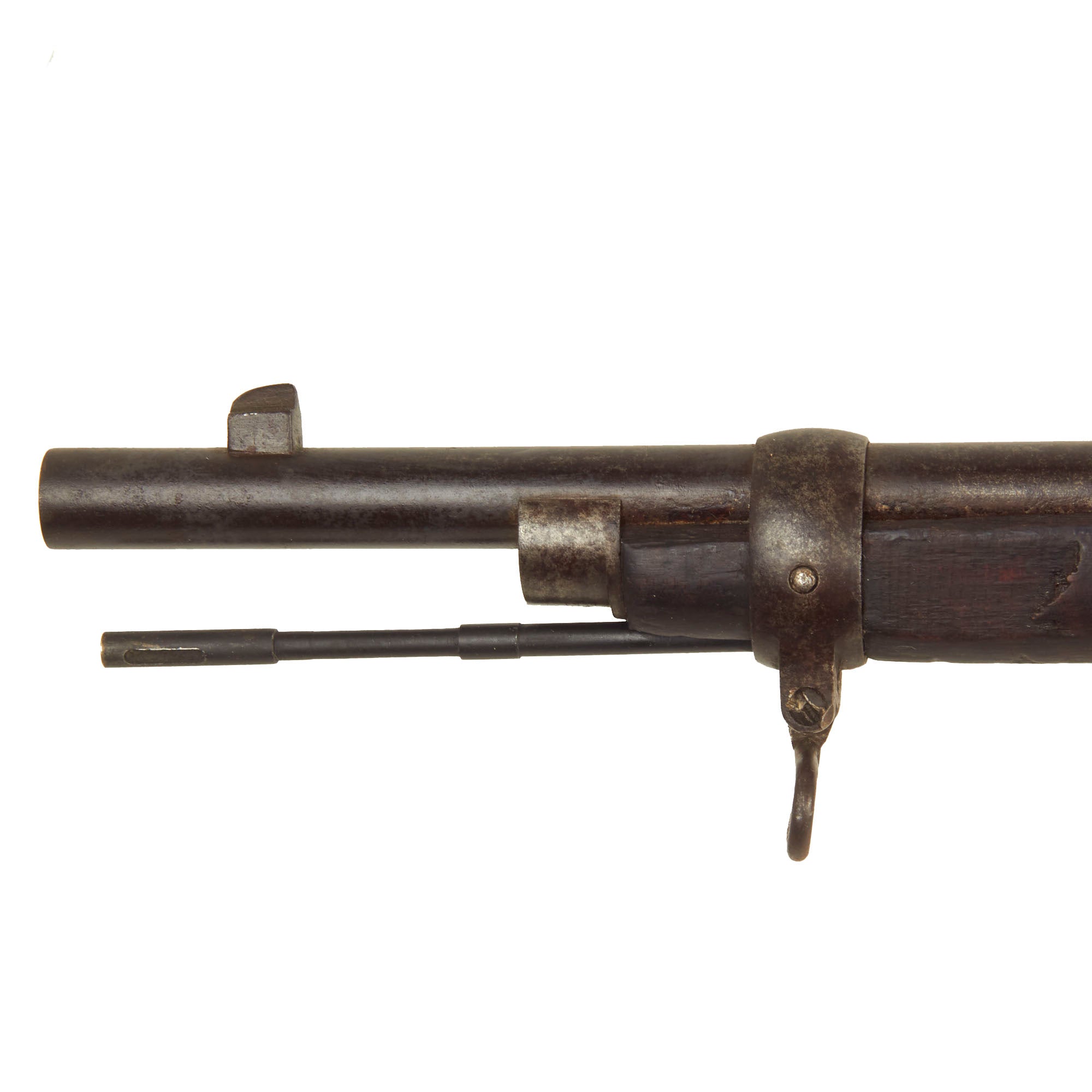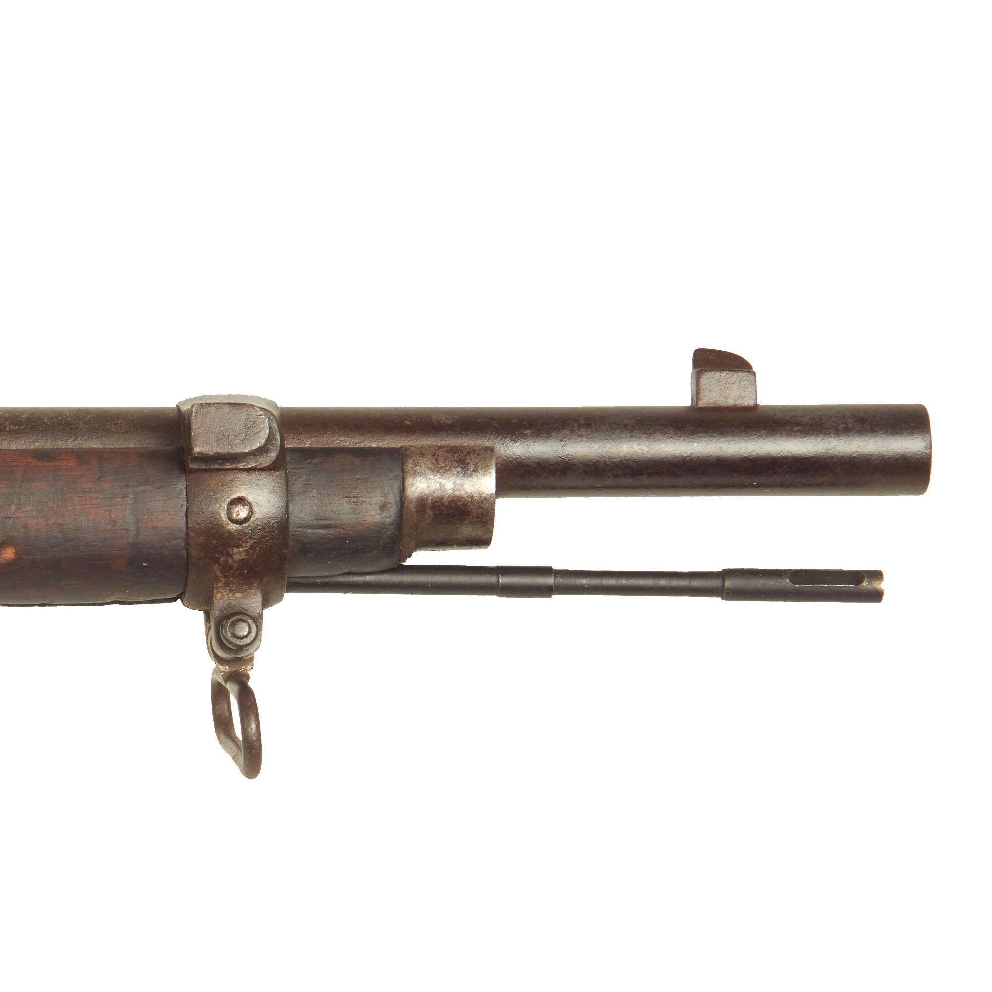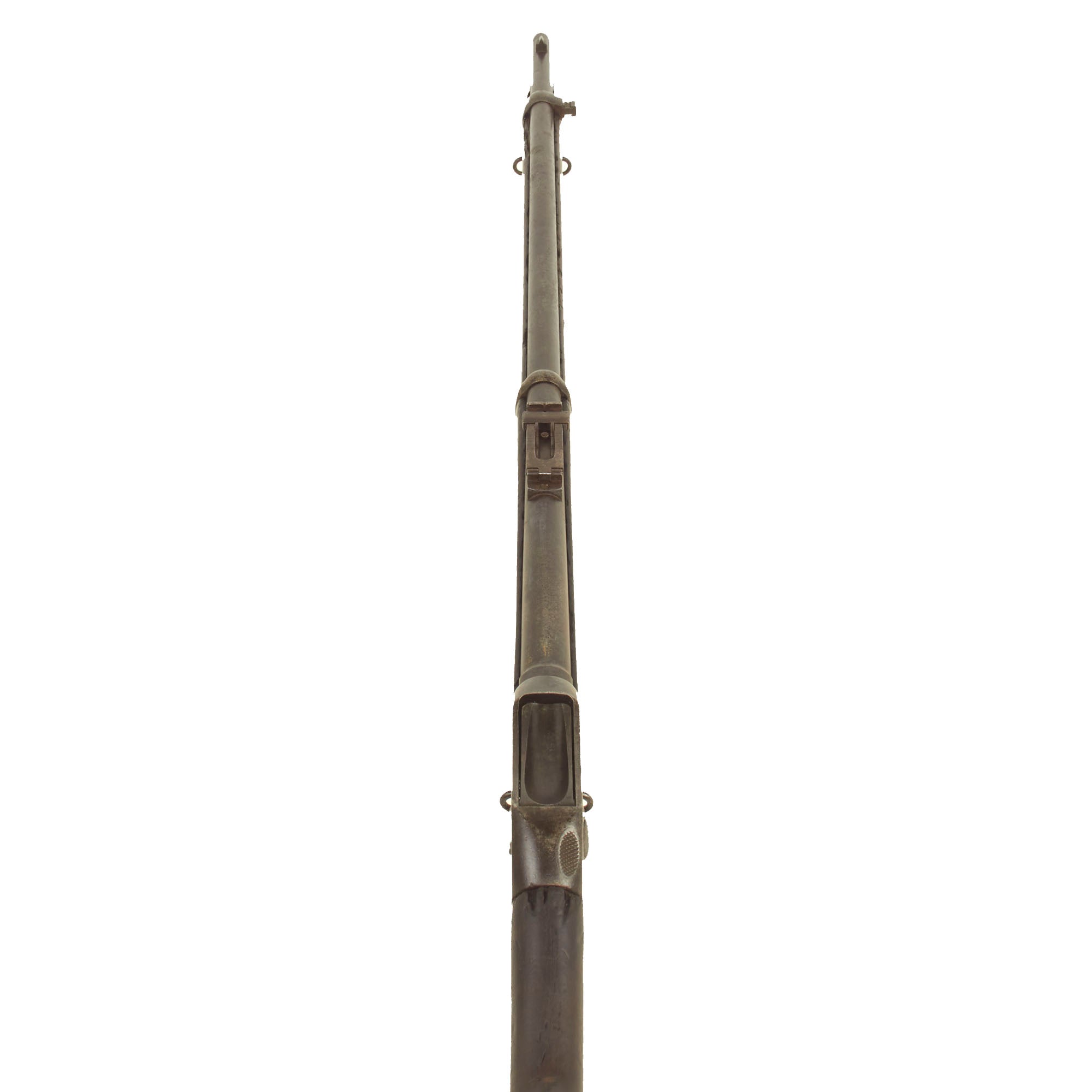 After the conversion, the rifle looks to have seen long service, and the exterior metalwork shows a well aged and peppery patina overall. The woodwork is relatively dark in color, showing dents and scratches from long service, though the butt stock does have some great "tiger flame" figuring in it. The action cycles correctly, though we have not tested it with any type of dummy cartridges. The bore still shows clear rifling, but also wear and some oxidation, particularly near the muzzle, where there is a lot of wear.