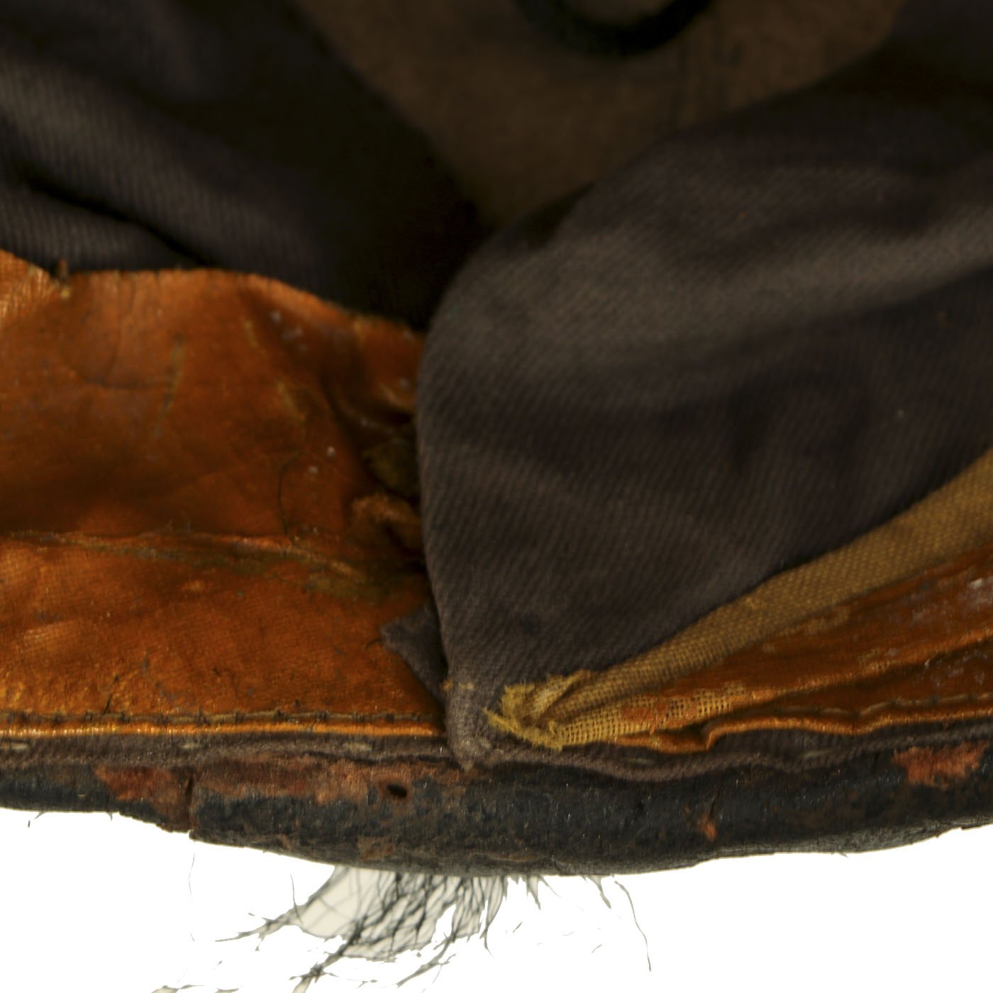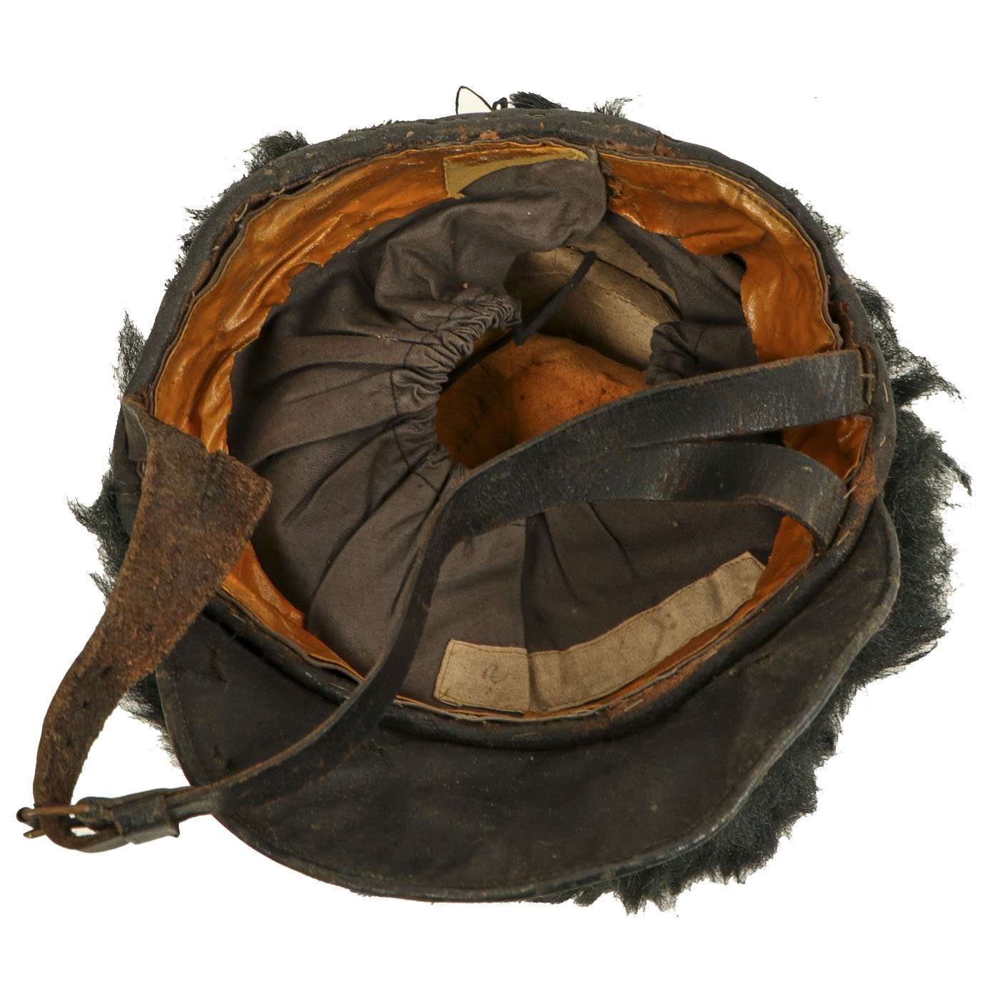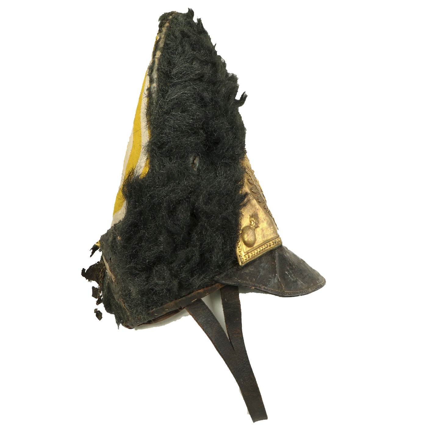 - Original Item: Only One Available. A black bearskin mitre style cap with brass frontplate bearing the Hapsburg double headed eagle flanked by grenades; back lined in yellow wool piped with grey wool tape; black leather chinstrap; pasteboard-reinforced interior with tan leather sweatband and brown cotton lining. Bearskin with losses to fur; leather scuffed and flaking; sweatband with tears and staining, leather brim shows crazing.