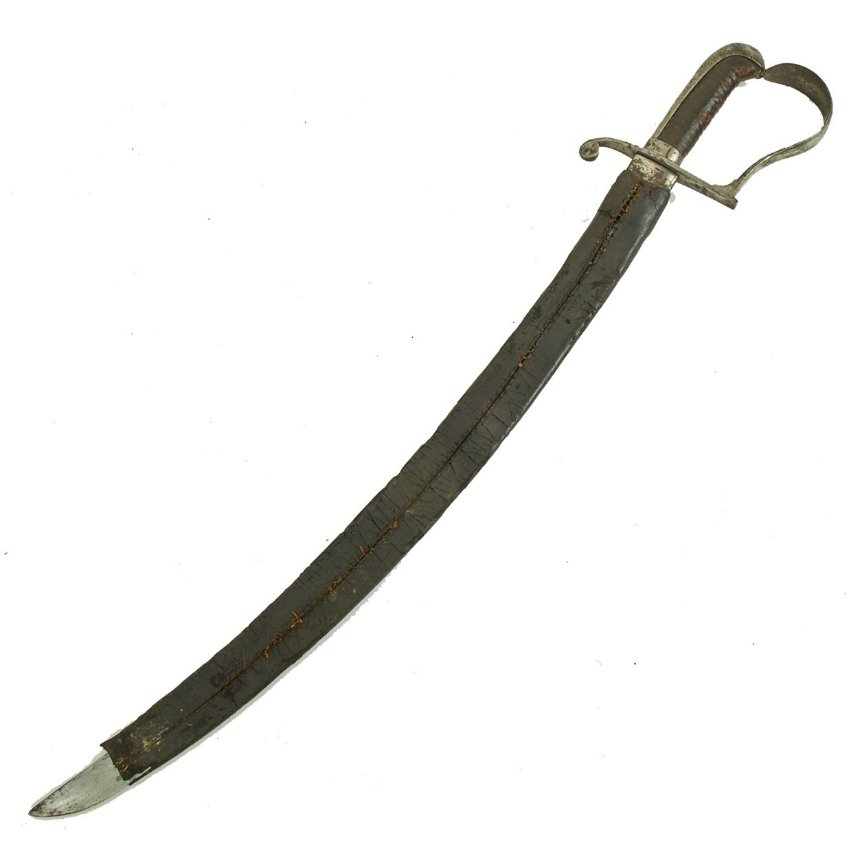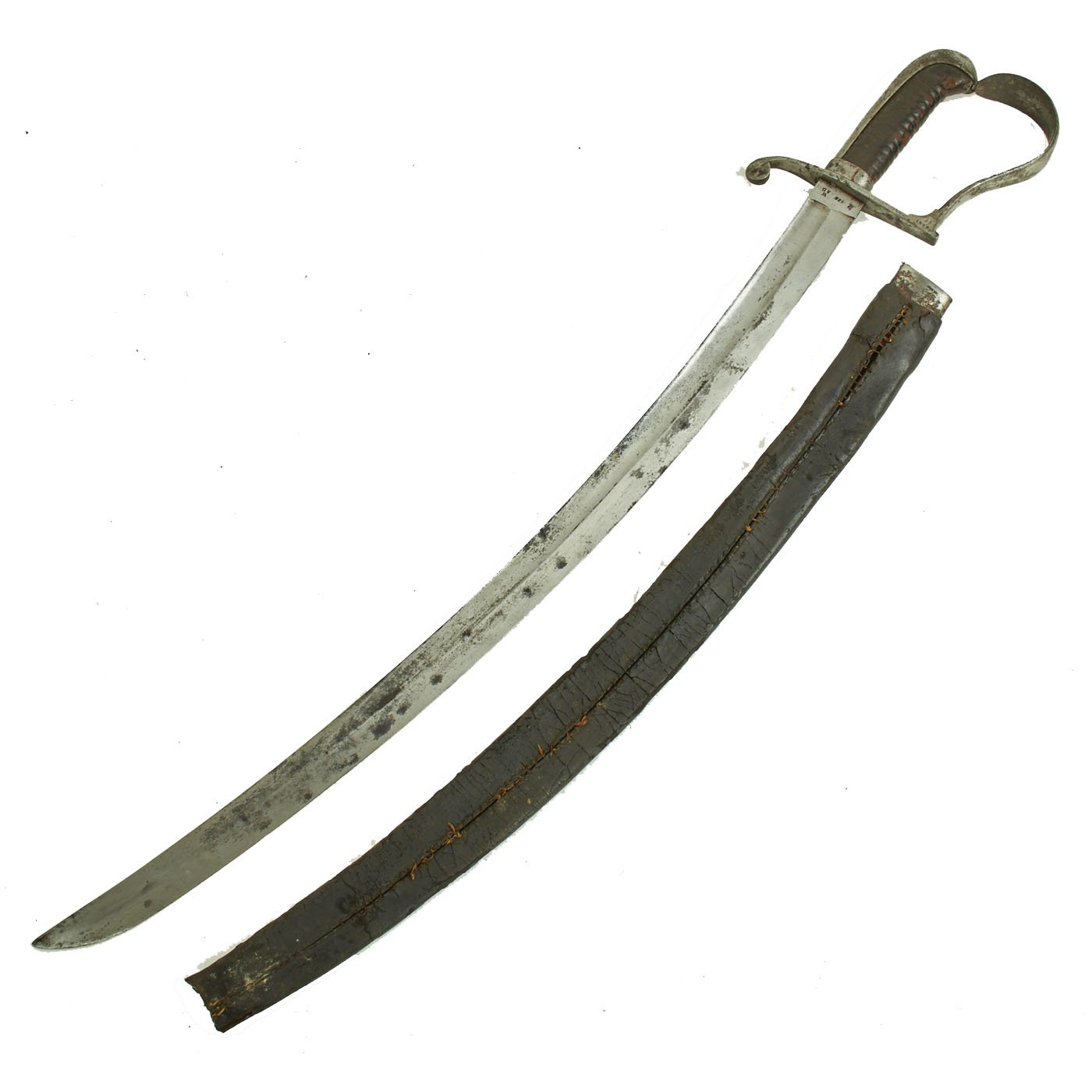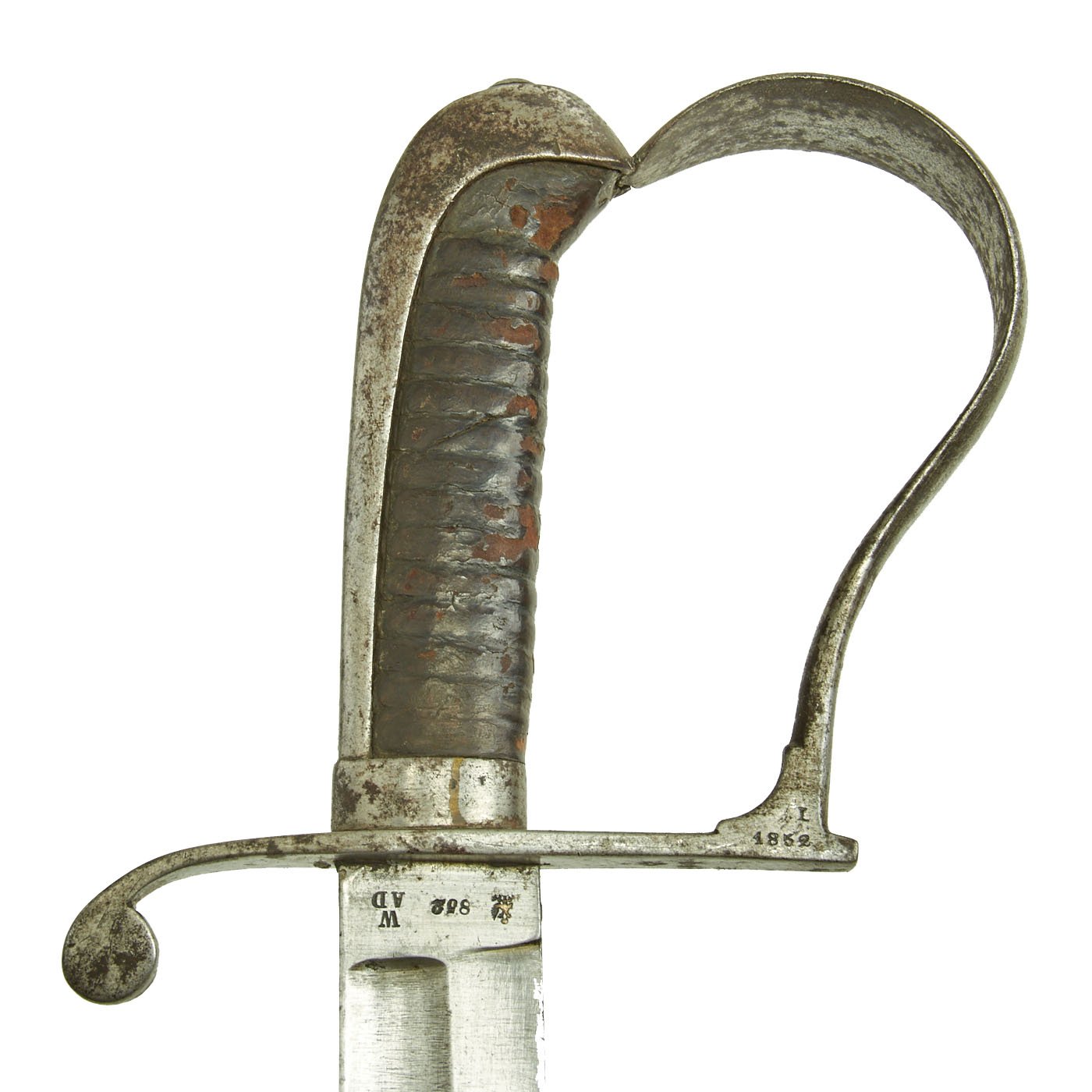 The sword is the classic naval cutlass style, with a broad curved blade with a single fuller, and a simple "P" shaped guard surrounding a leather wrapped wooden grip. It looks like originally it was wire wrapped, but the wrapping has unfortunately degraded. The hilt in general has an overall oxidized patina, but no major rust, and looks great. There appear to be some markings stamped into one side of the cross guard, but they are illegible. The other side is marked 1852.