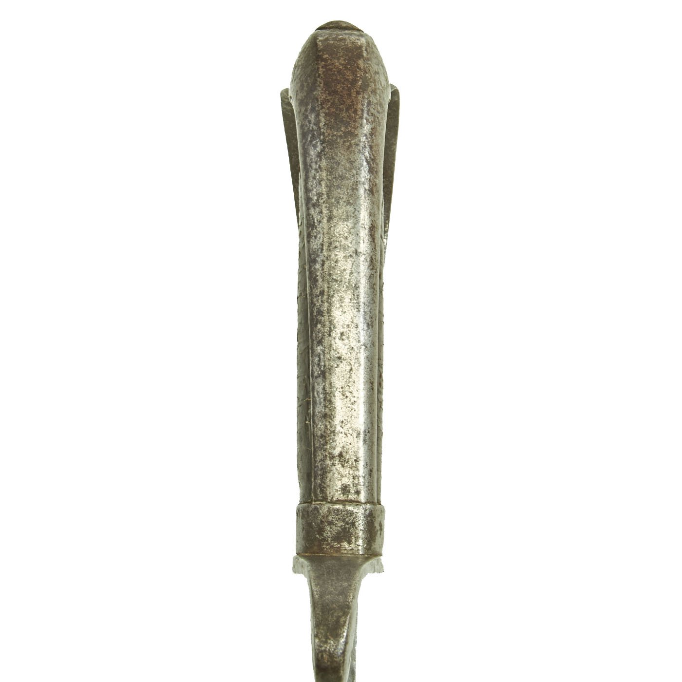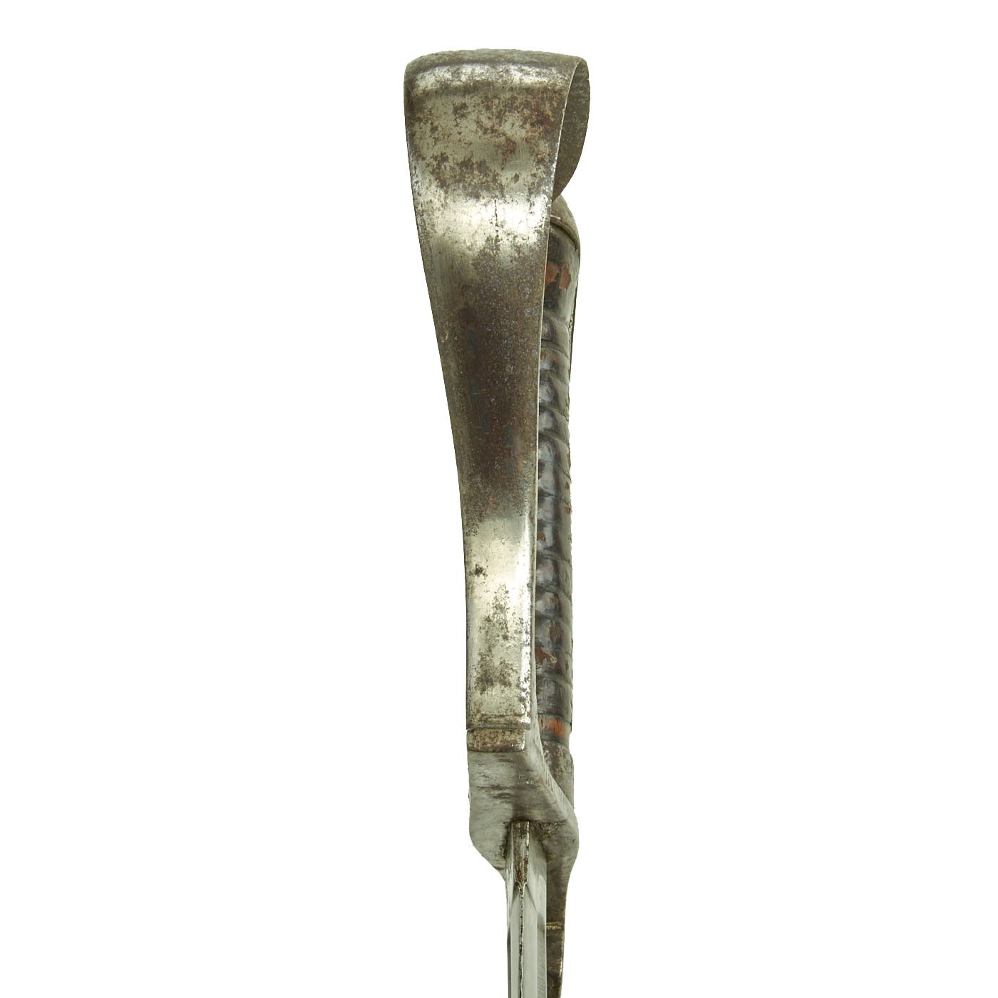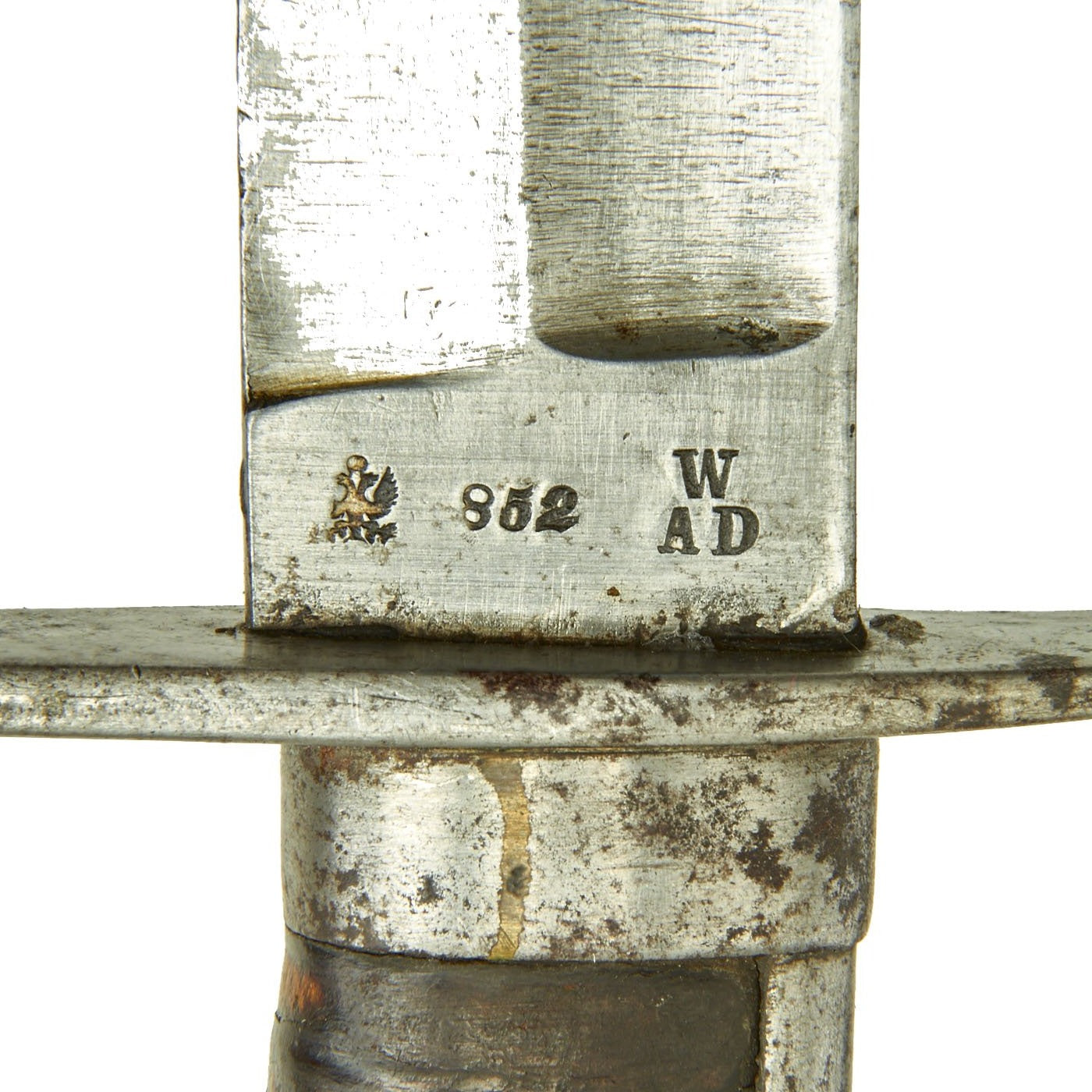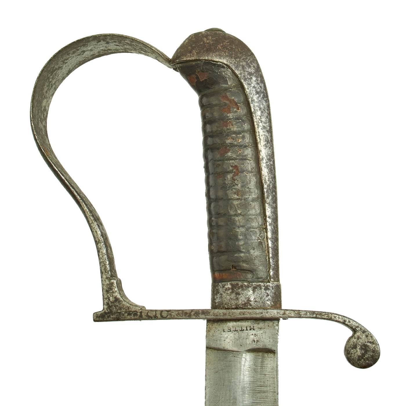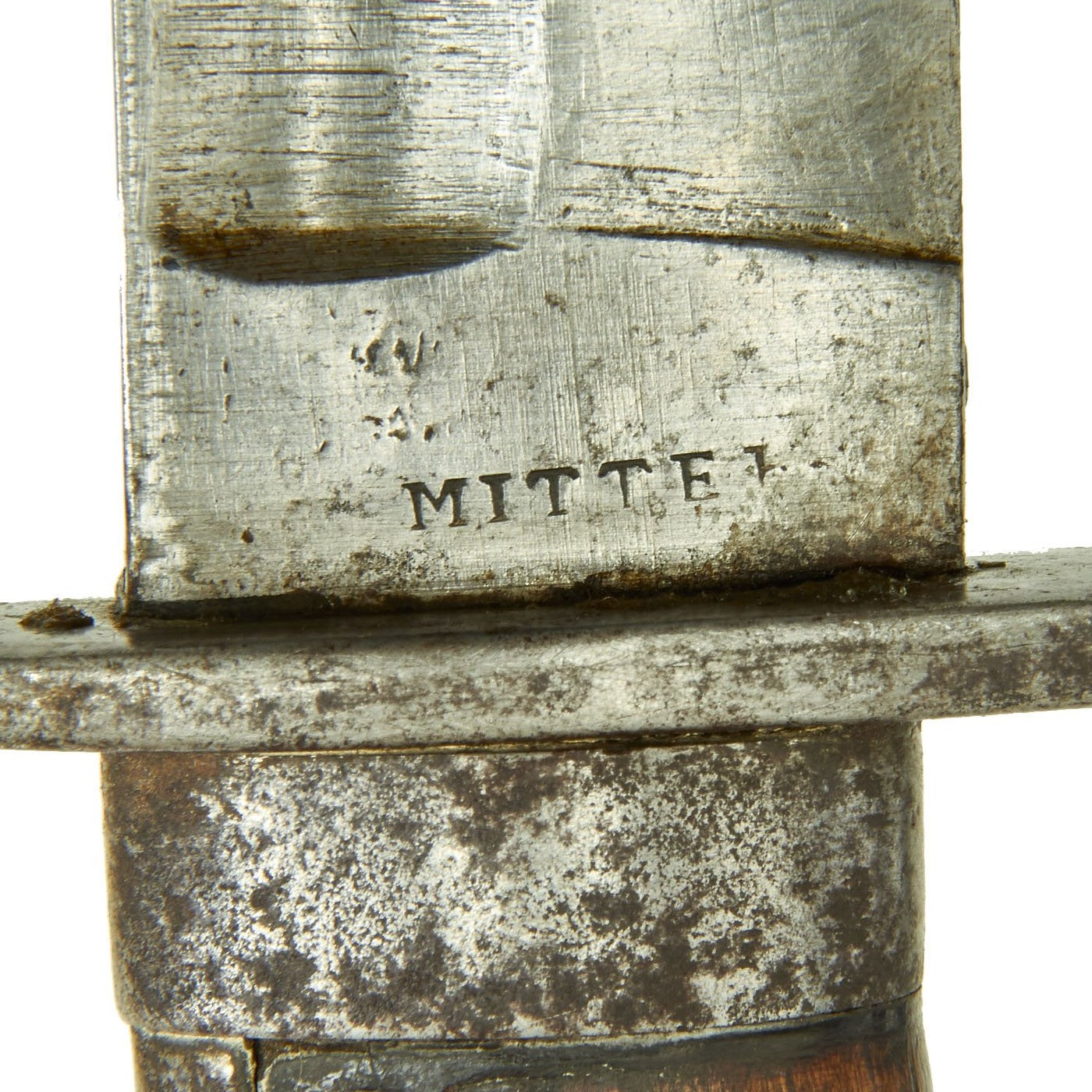 The blade ricasso is marked MITTEL, which may be part of the maker name, as it translates to "middle". The reverse ricasso is marked with the Austrian Double Headed Eagle, which is struck partially, next to an 852 date and W / A D. Blade condition is quite nice, with only light areas of staining.