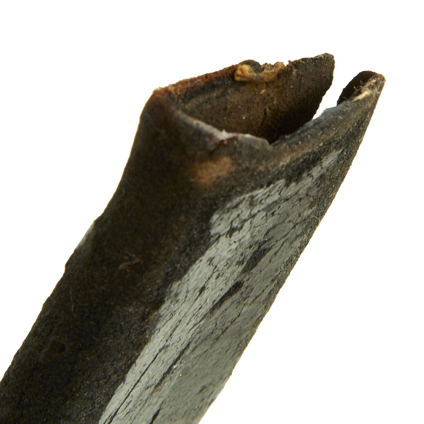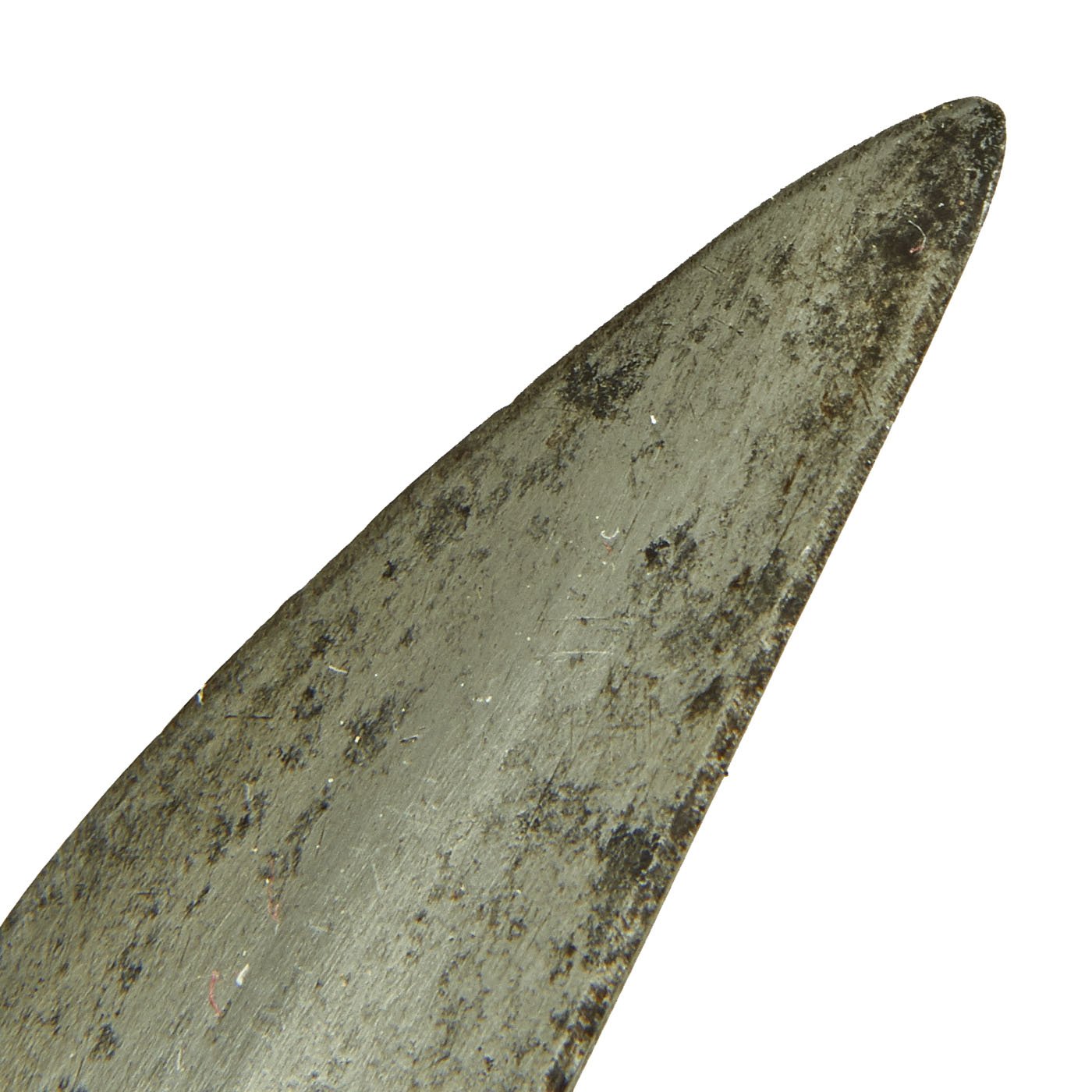 The leather scabbard has unfortunately not fared as well, and is missing the last 5 inches or so . It is stitched around a metal throat at the top, which has a heart-shaped frog button.