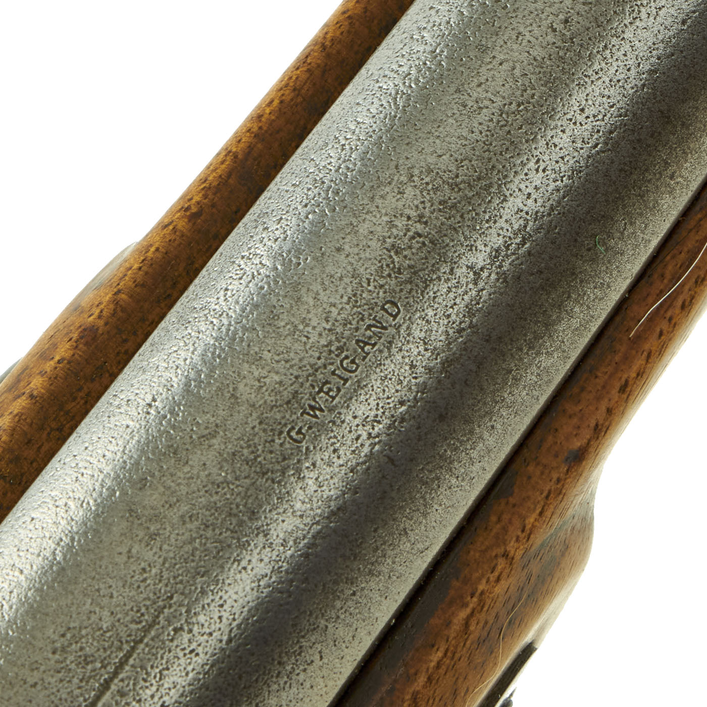 The top of the barrel is faintly marked G. WEIGAND, a known contractor for these pistols, as well as Lorenz rifles. There are also some markings on the breech of the barrel, including a script L, a J in a circle, and an Eagle over W. The number 55 is stamped on the nose cap, the side plate, and on the butt cap.