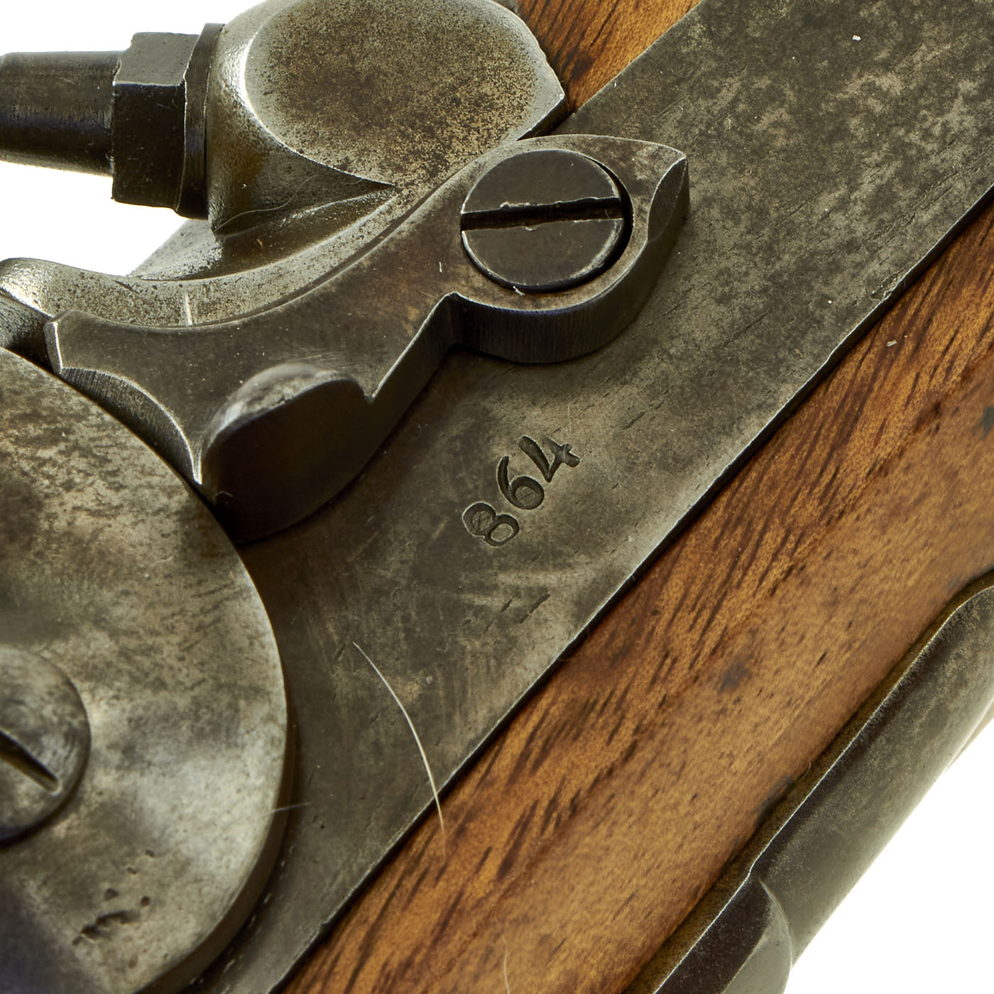 Condition is very good, with a lovely polished patina on the metalwork, with no major rust or pitting. There is not much powder burn visible, and the bore of the pistol is in great condition, showing a bright finish and not much wear to the four groove rifling. The lock functions perfectly, holding at half cock and firing at full, with a fully working hammer safety.