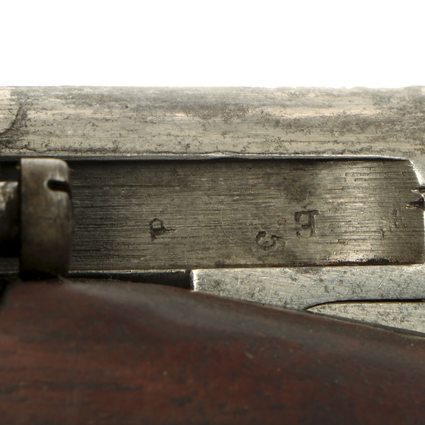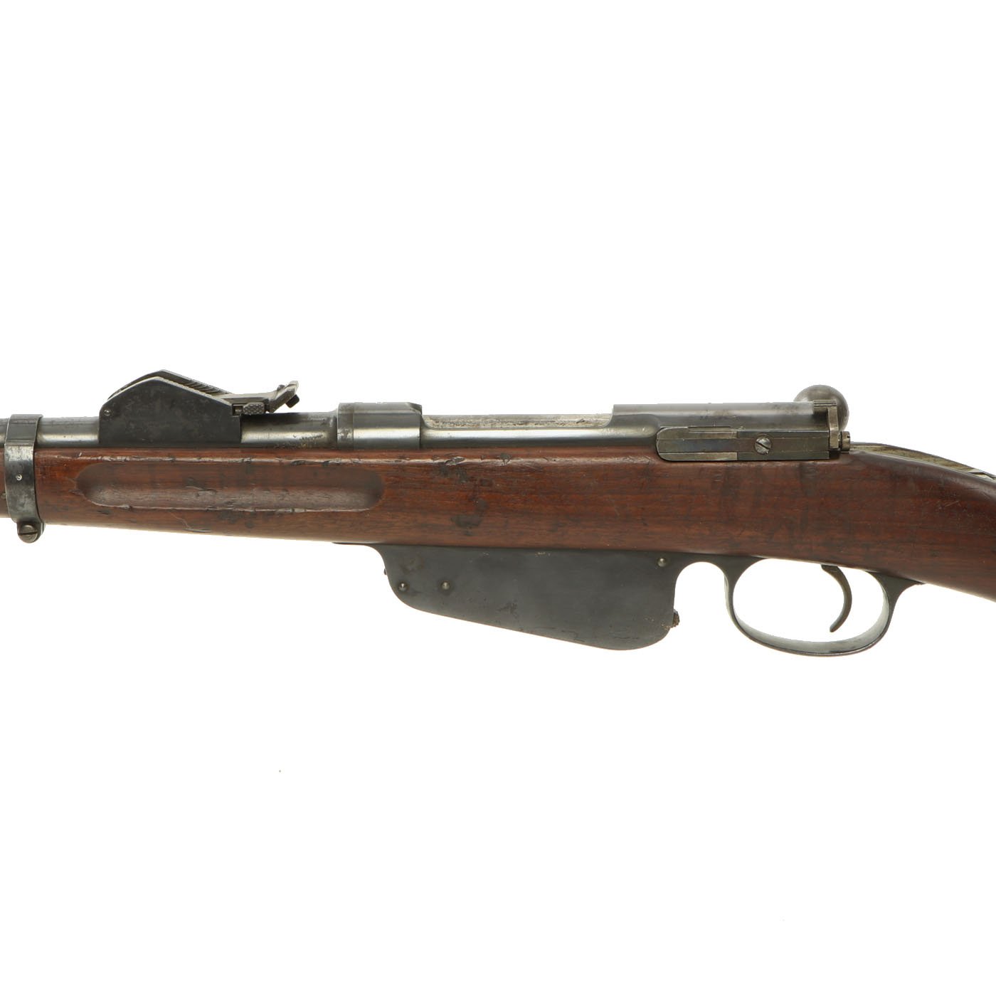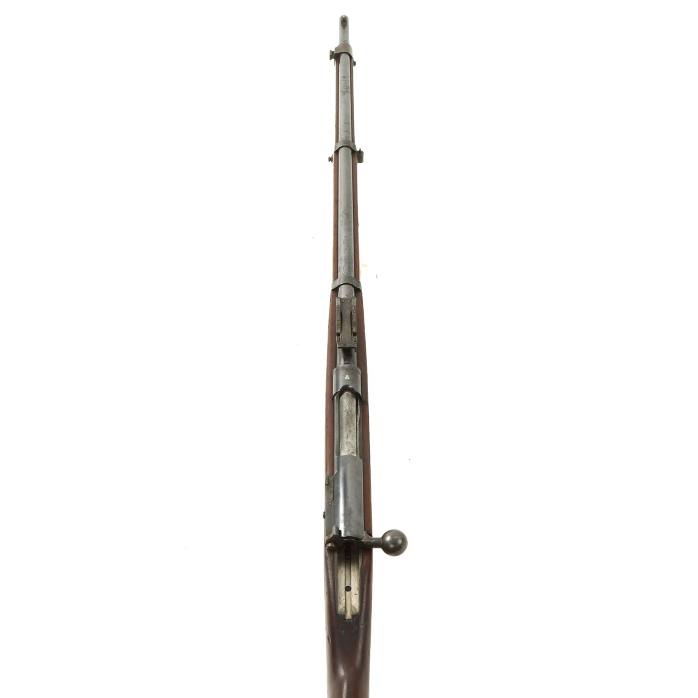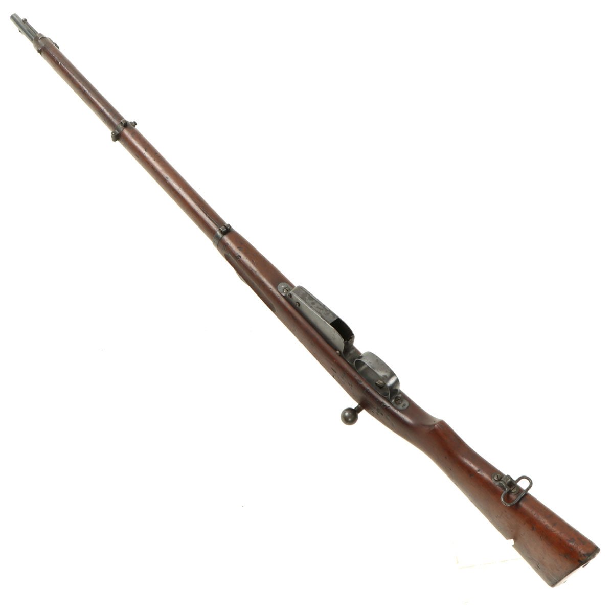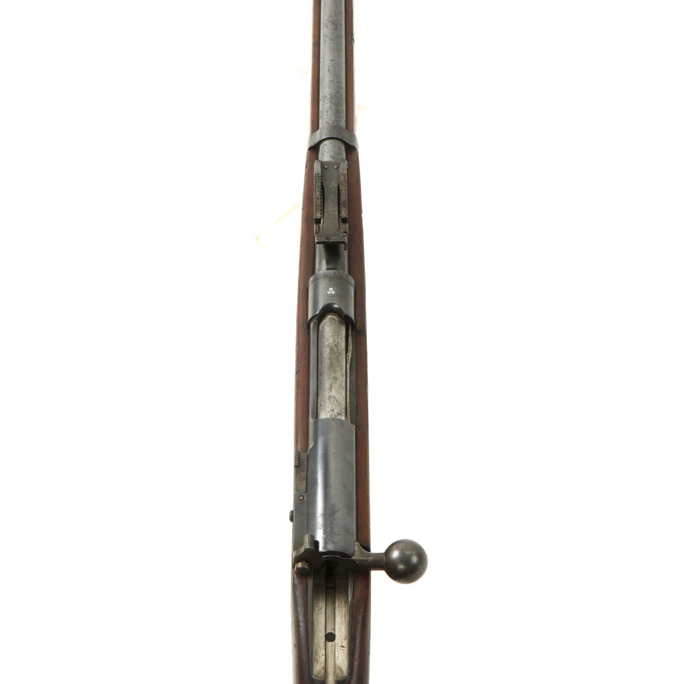 This example is definitely in 8mm, though unfortunately we are not able to tell if it is an M1888 or M1888/90. It is marked Œ / W G over the chamber, indicating it was manufactured by Österreichische Waffenfabriksgesellschaft, (ŒWG, Austrian Arms-Manufacturing Company), a legendary factory with a long history. This is the only marking on the rifle except for some proof marks.