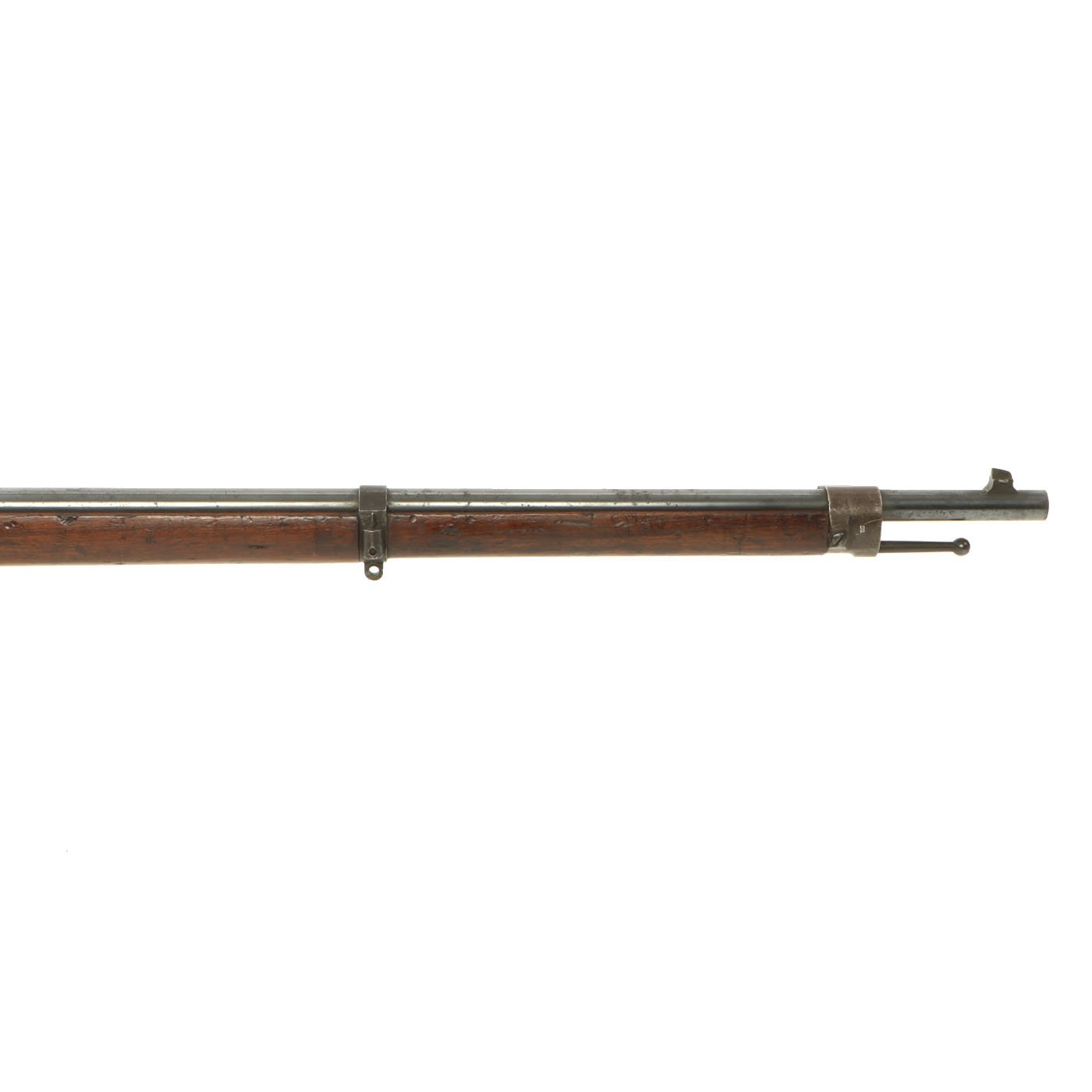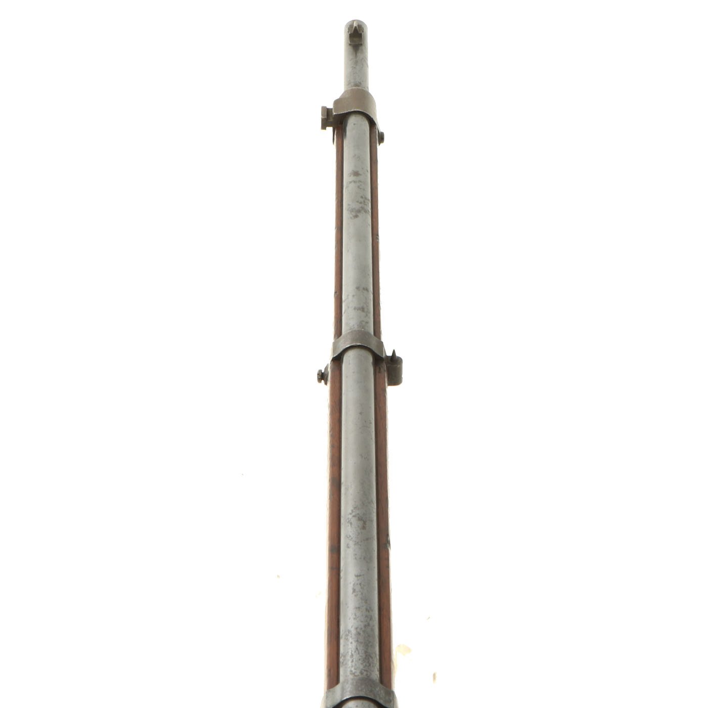 Another very interesting feature of the rifle is the dual sighting system. The short-range front sight is a conventional barleycorn (tapered) blade. The rear sight is of an interesting but common 19th-Century design called a quadrant sight. The left ramp is graduated from 00 to 1700 meters and is used in conjunction with the V notch in the top of the sight leaf. The right ramp is graduated from 1800 to 2500 meters for the long-range or volley sight system. This system consists of a tapered-post front sight, mounted on the right side of the middle barrel band, and a very ingenious slide-out V notch on the rear sight leaf.