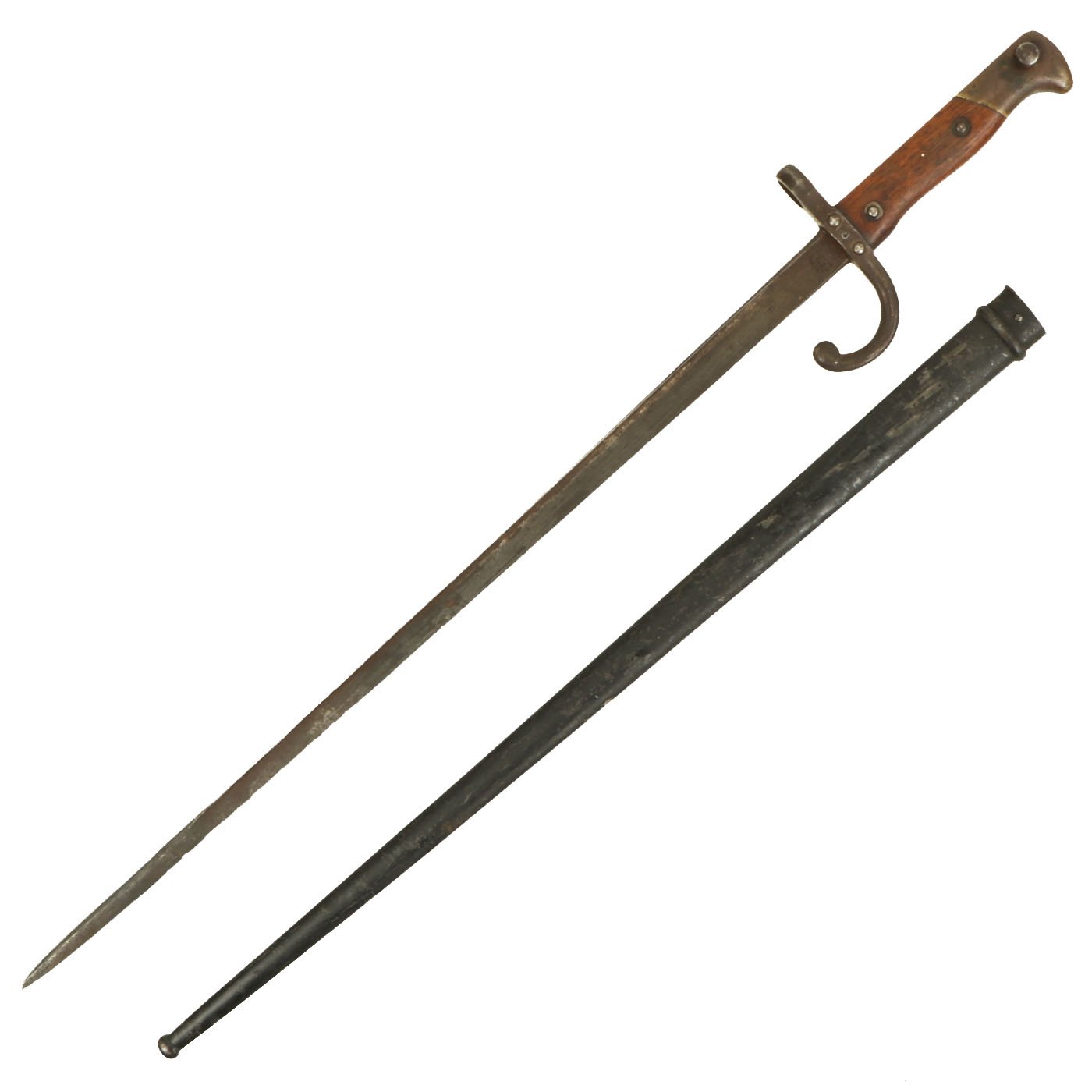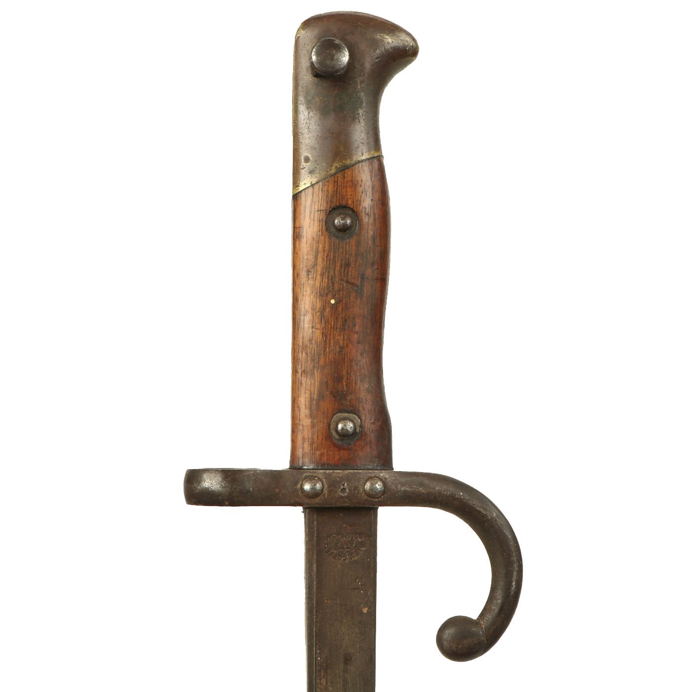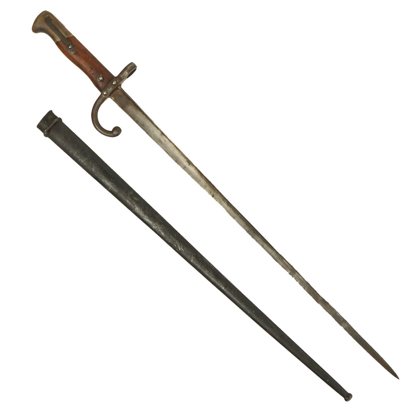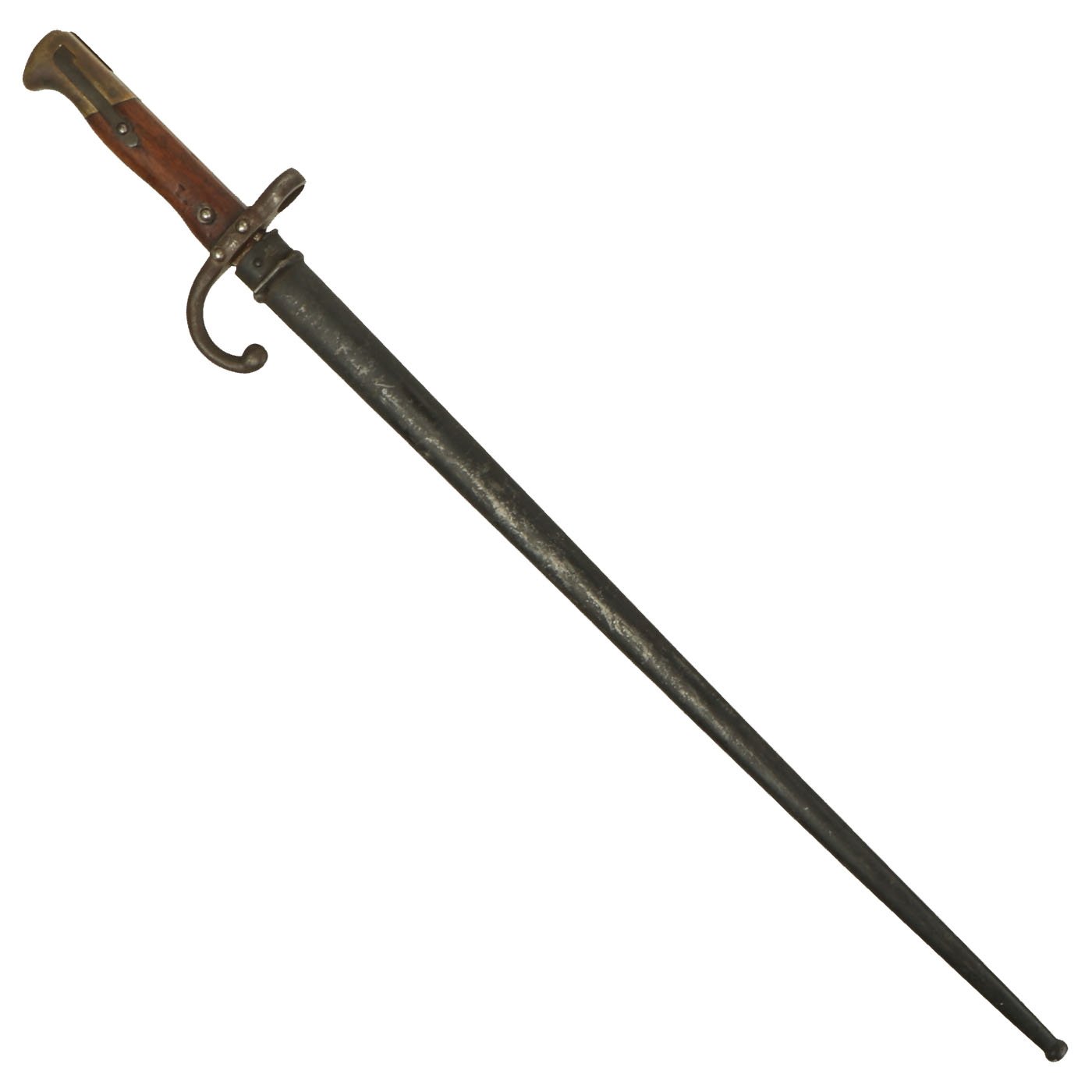 Original Item. Only one Available. These are extremely scarce and hard to find! This rare bayonet has a 20 1/2" T-Backed blade, with an overall length of 26 1/4”. Overall it is very much in the style of the French 1874 Gras bayonet, except that it features a long 5" STRAIGHT back grip, instead of the offset design. The bayonet comes complete with its original steel scabbard.