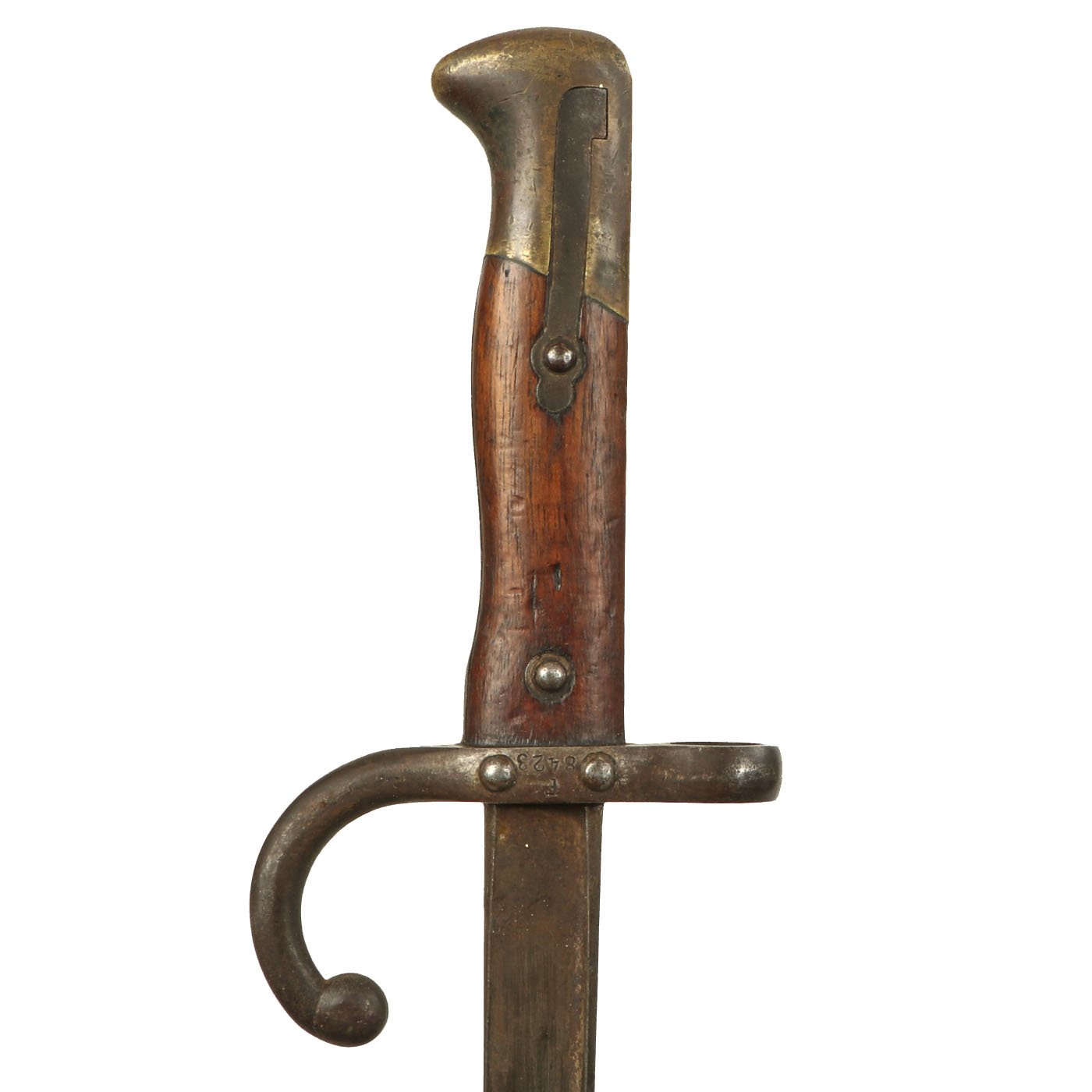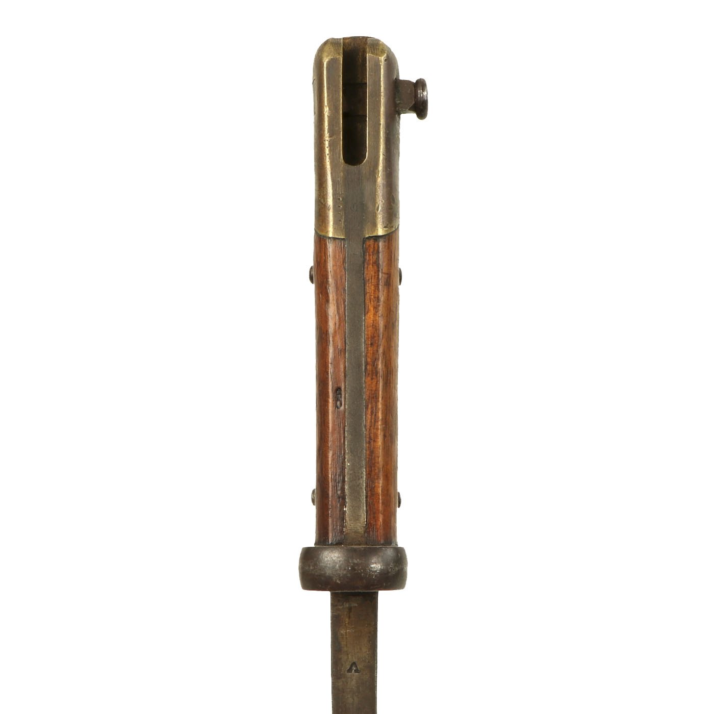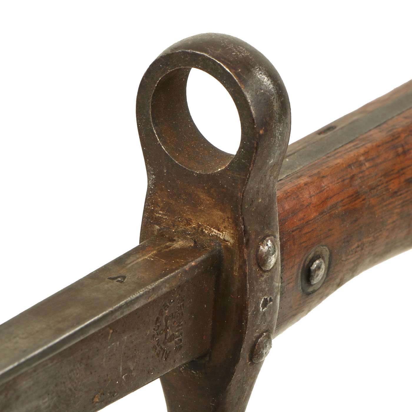 Original Item. Only one Available. These are extremely scarce and hard to find! This rare bayonet has a 20 1/2" T-Backed blade, with an overall length of 26 1/4”. Overall it is very much in the style of the French 1874 Gras bayonet, except that it features a long 5" STRAIGHT back grip, instead of the offset design. The bayonet comes complete with its original steel scabbard.