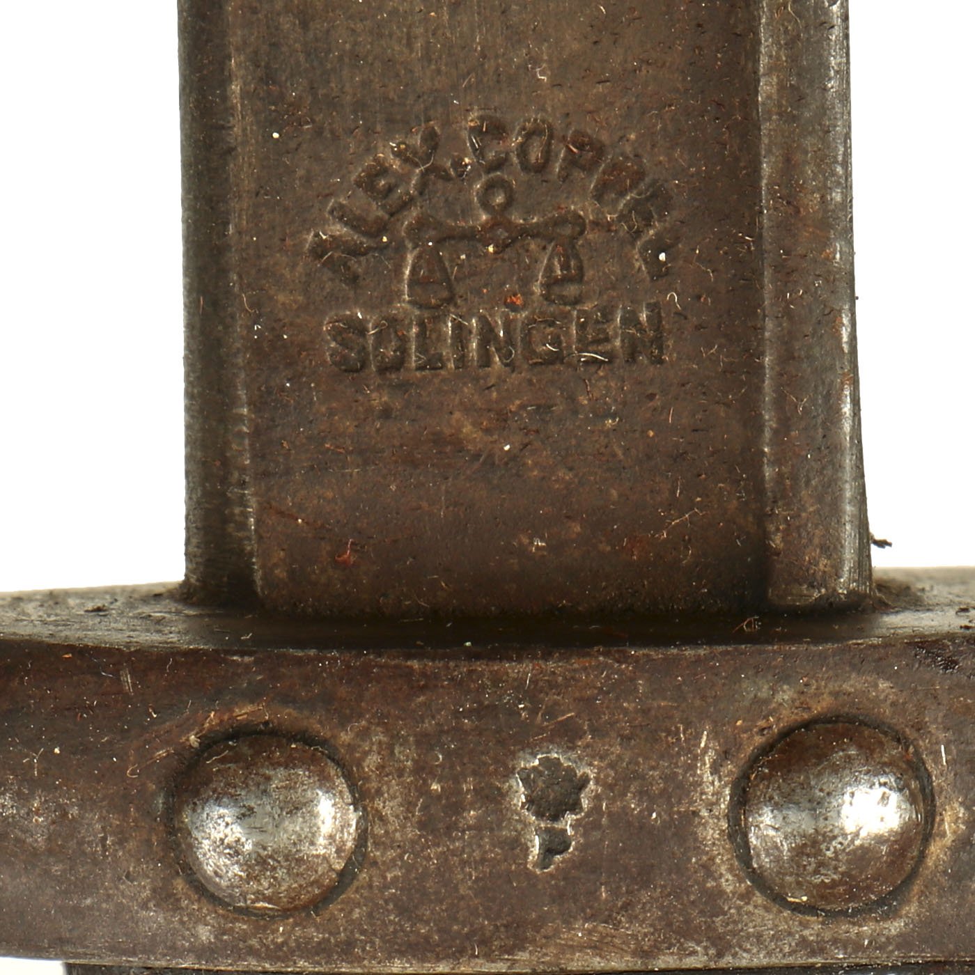 The blade ricasso is maker marked ALEX. COPPEL / SOLINGEN, around the trademark "Scales" logo, indicating manufacture by Alexander Coppel & Co. located in the legendary "City of Blades", Solingen. This company made large amounts of export bayonets during the 19th century, and also manufactured bayonets for many years and up through WWII under the name Alcoso. Sadly, as the Coppel family was Jewish, they saw their company stolen from them and "Aryanized" during WWII by the NSDAP. For more information please see J. Anthony Carter’s work GERMAN KNIFE AND SWORD MAKERS.