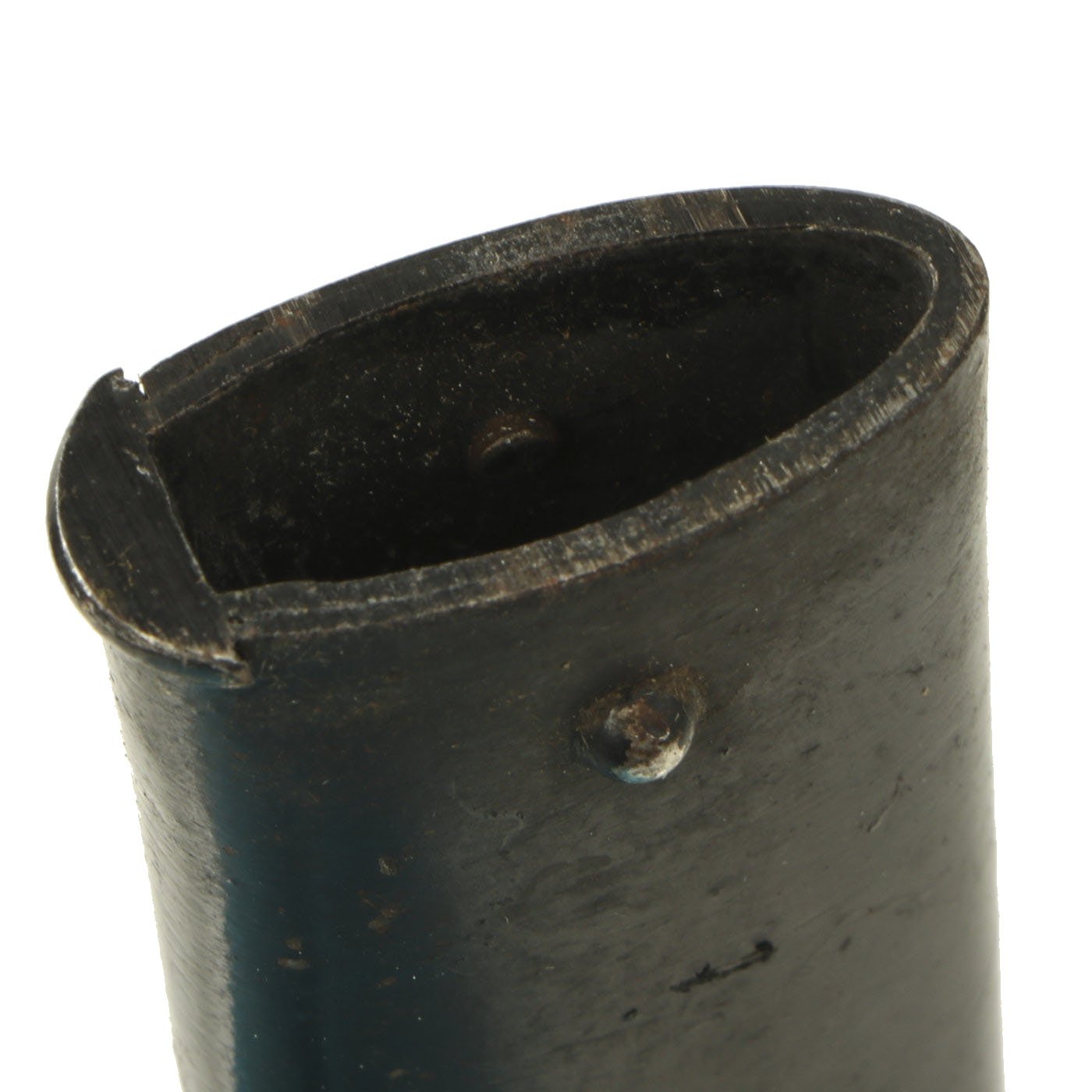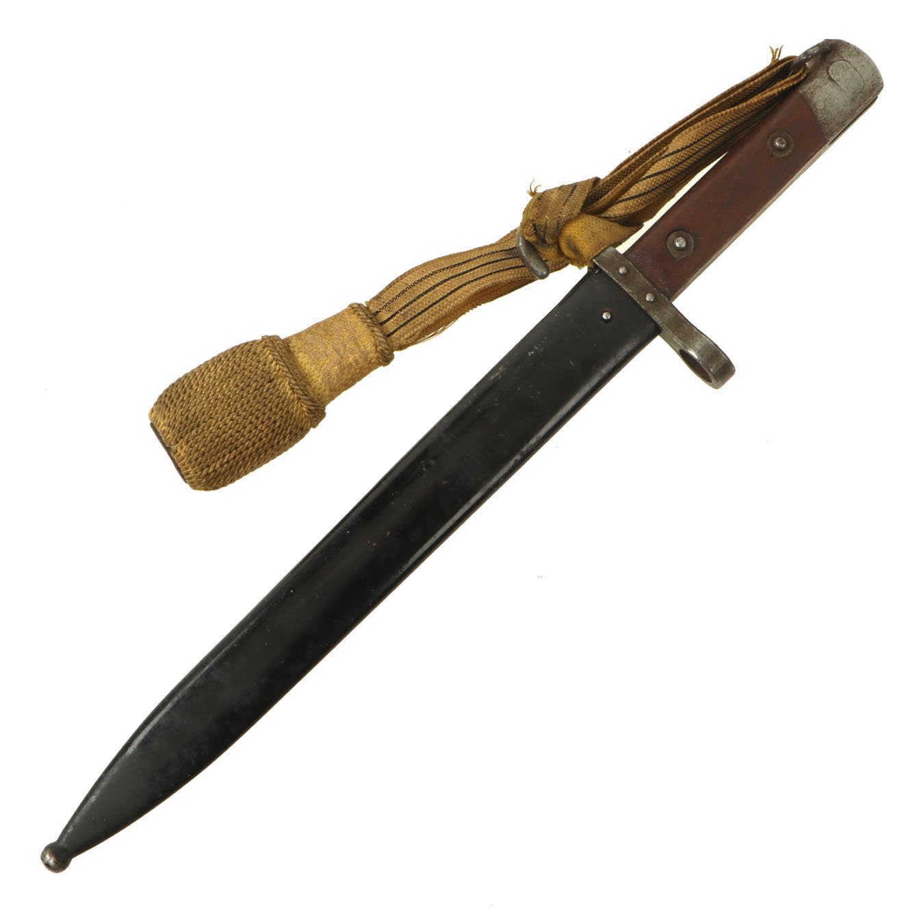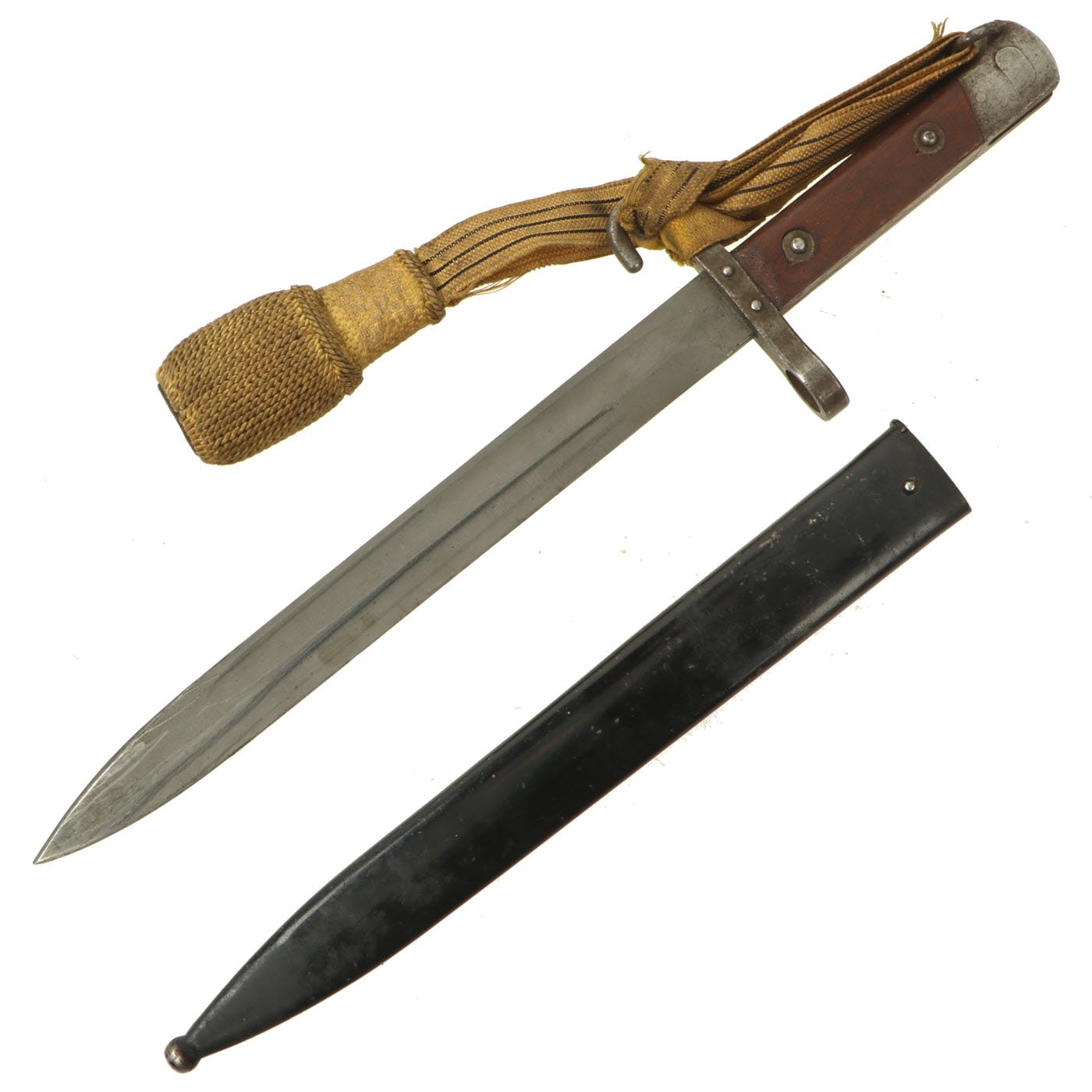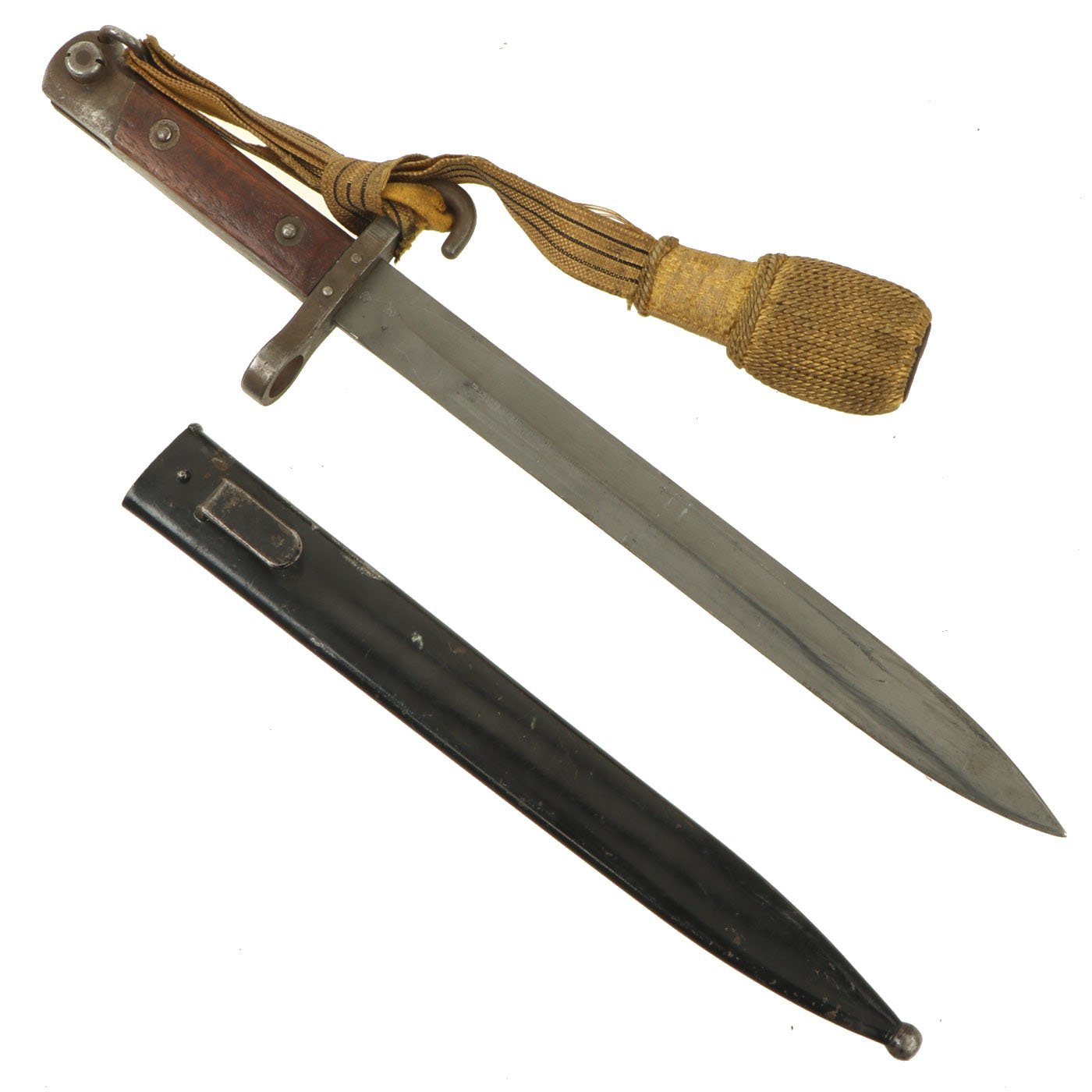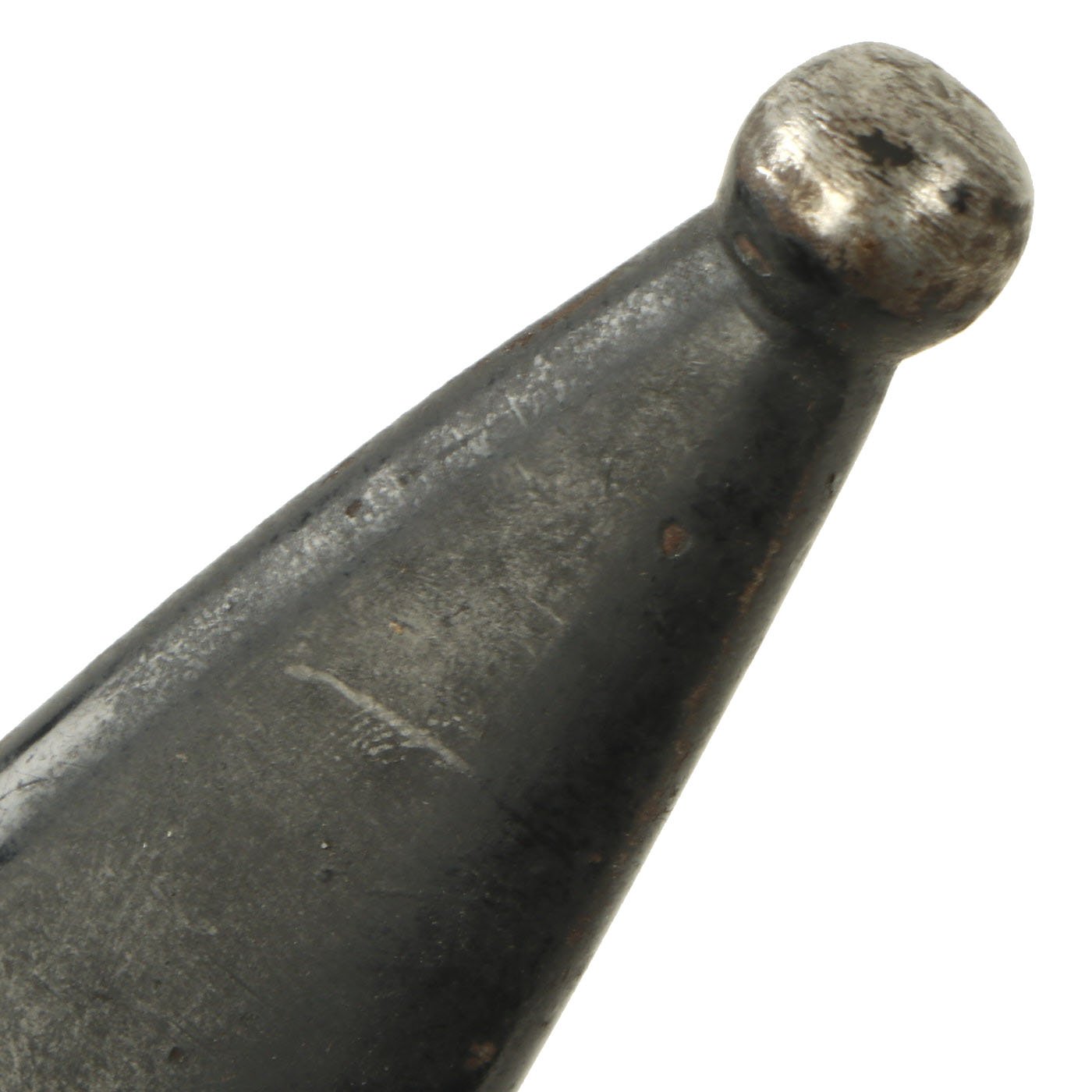 Condition of the bayonet is very good, though it was refinished at some point with what looks to be phosphate. The scabbard, originally blued, was painted during its service life, most likely due to finish loss.