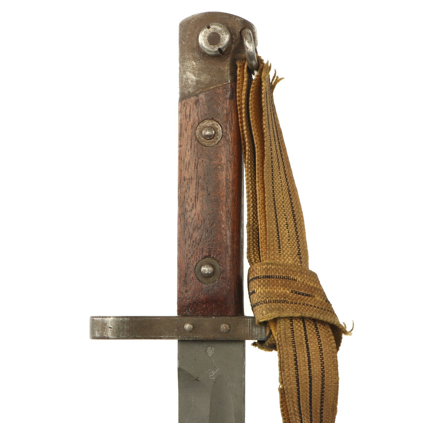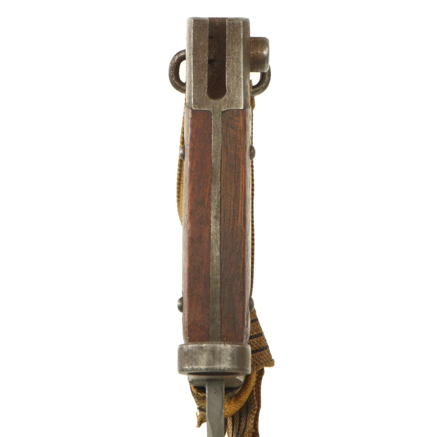 These normally have no quillon, and just a muzzle ring on the crossguard, but this is a rare version for NCOs, which has a hooked quillon and small swivel on the bottom. This was for attaching a Troddle knot to the bayonet, so that the NCO could easily be identified by the colorful knot on his bayonet. This was even more apparent when the bayonet was fixed onto the rifle. For more information please see Watts & White’s fine work The Bayonet Book, page 20, item 42.