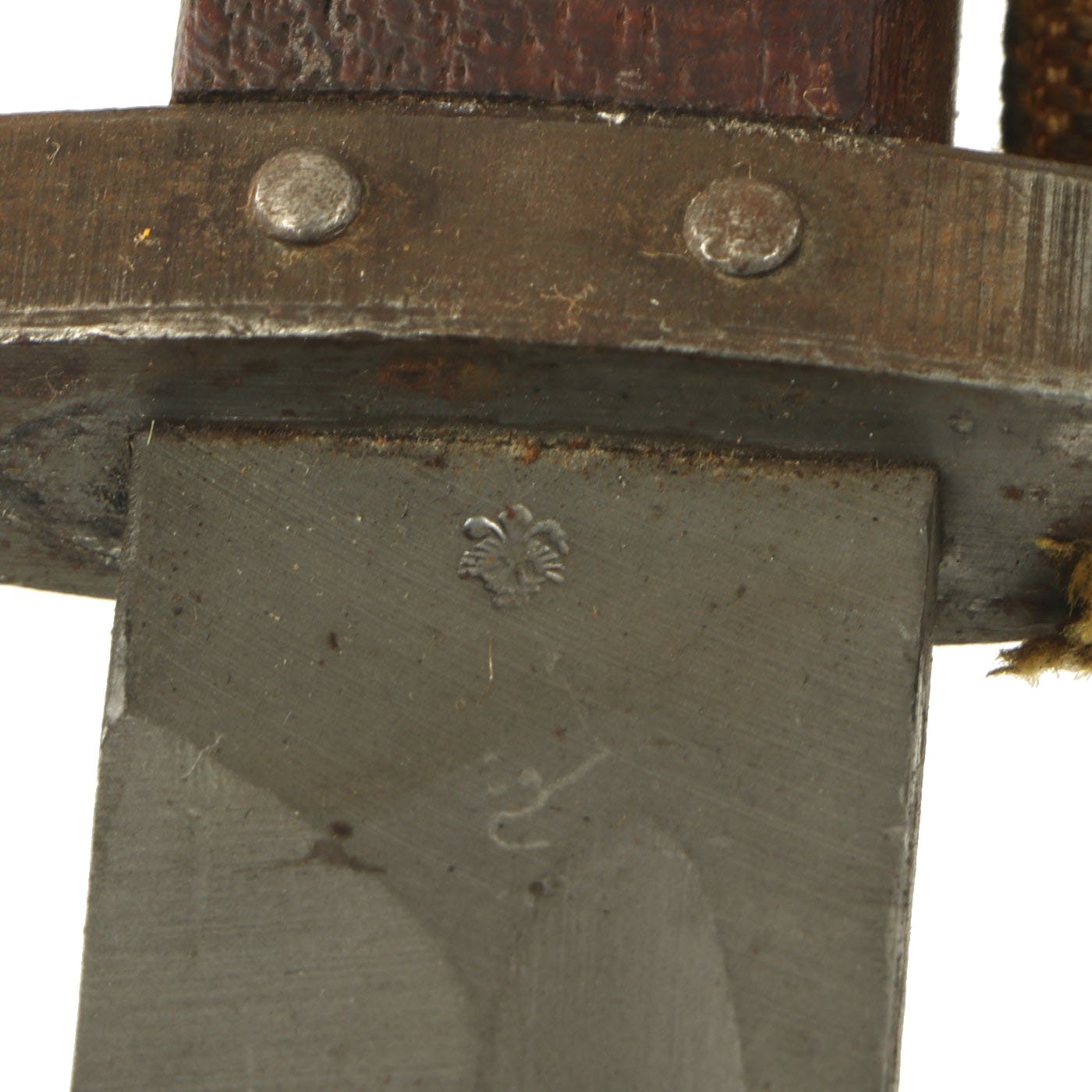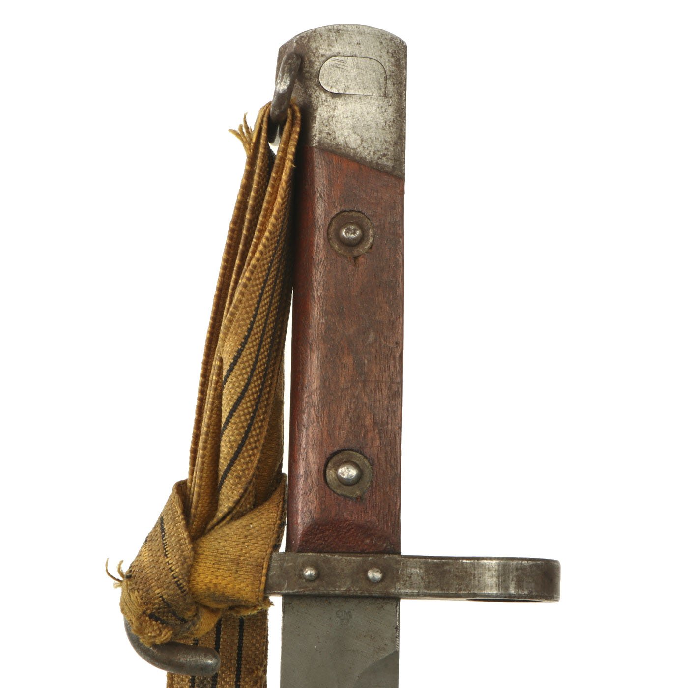 The bayonet and scabbard are both stamped with Œ over WG, the marking for Österreichische Waffenfabriksgesellschaft (Austrian Arms-Manufacturing Company), abbreviated as ŒWG. Steyr Mannlicher firearm production was a part of this company. The reverse ricasso of the bayonet has the Austrian Eagle proof mark.