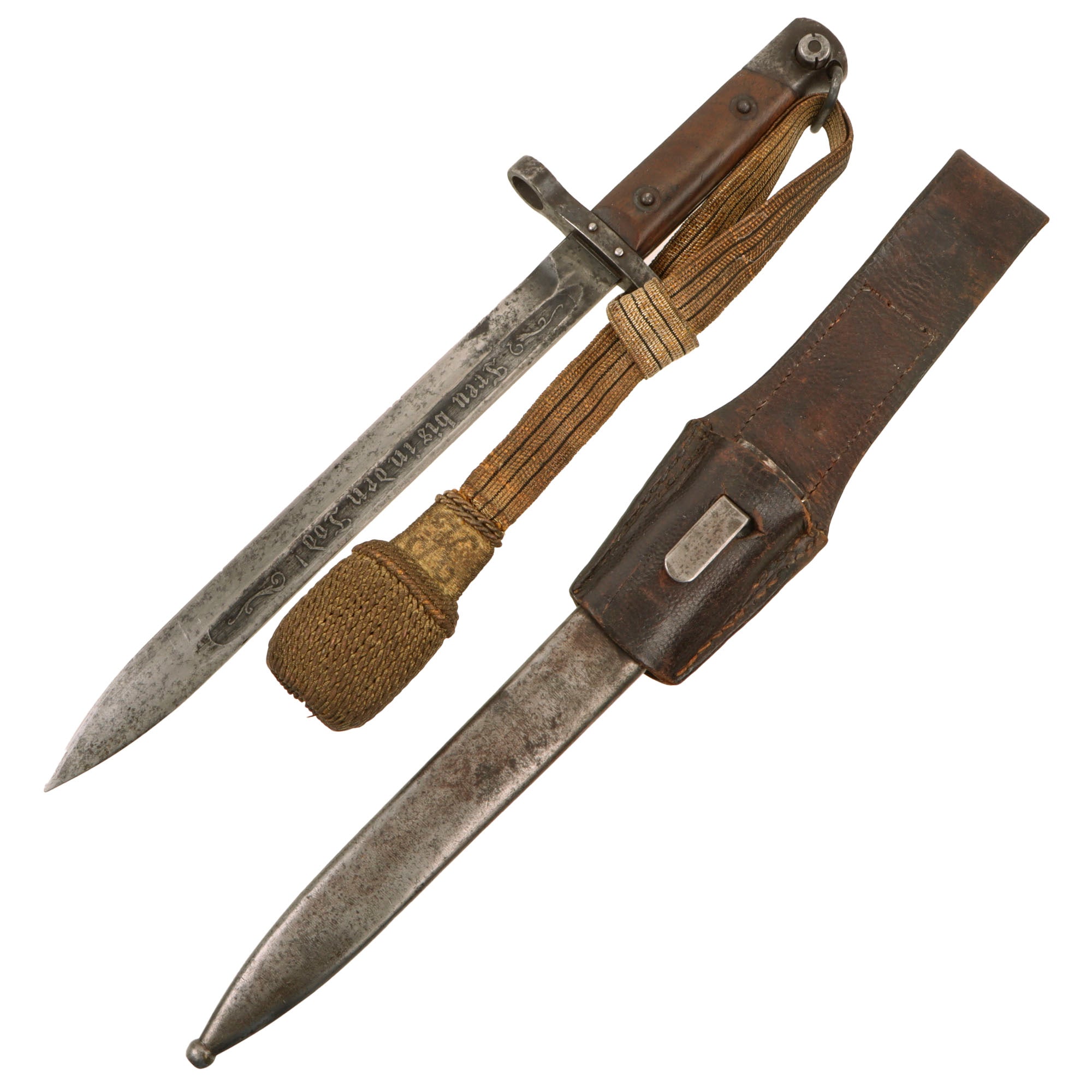 “This Austrian M.1895 NCO bayonet shows a uniform gray patina over the surface of its bright blade, crossguard and pommel. Its bird’s head pommel contains a functional round release button operated from the reverse, a pommel loop and a T-mortise. There are smooth dark brown wooden grips attached to the tang using two domed steel rivets and washers. The crossguard has a hooked quillon and is mounted to the tang using dome-headed rivets. The manufacturer’s mark of OWEG (Osterreichische Waffenfabriks-Gesellschaft, Steyr) is stamped into the obverse ricasso. An attractive gray patina covers the surface of the metal scabbard. Its flat frog stud is devoid of any markings. The knot attached to the swivel loop was manufactured using metallic thread and bears the “K” cypher for Austrian Kaiser Karl I. A brown leather frog belt is attached. Etched into the reverse blade is the inscription: True bis in den Tod! (Loyal until Death).”
