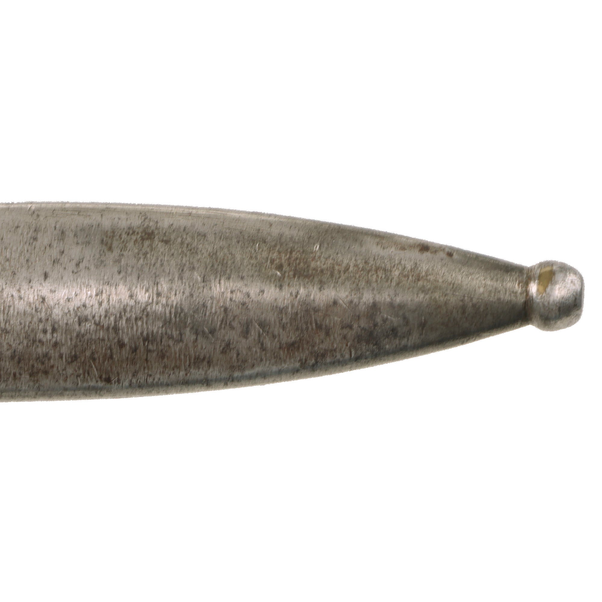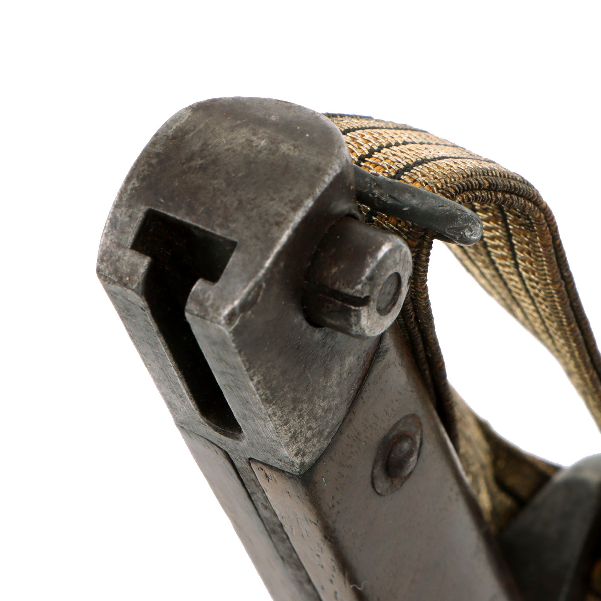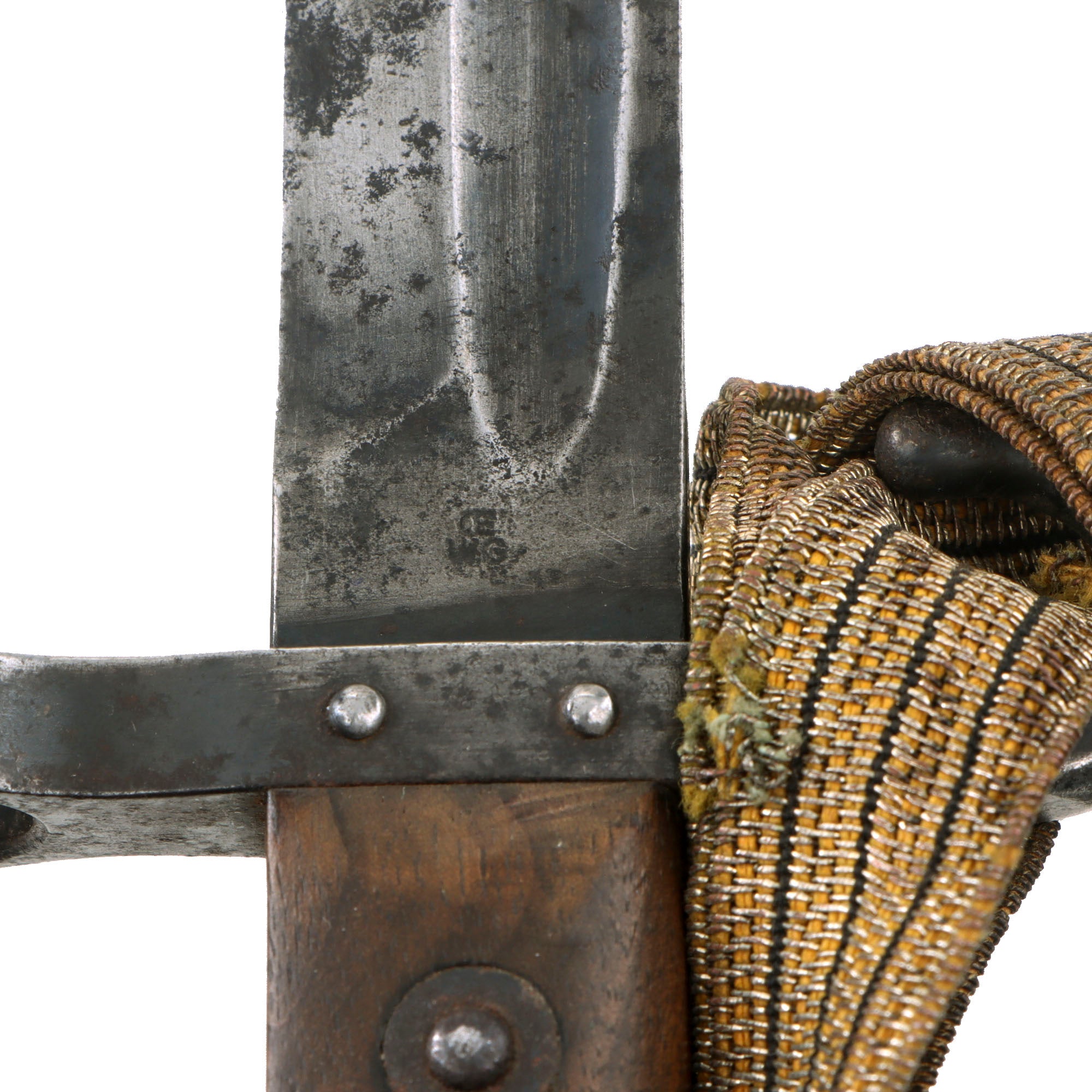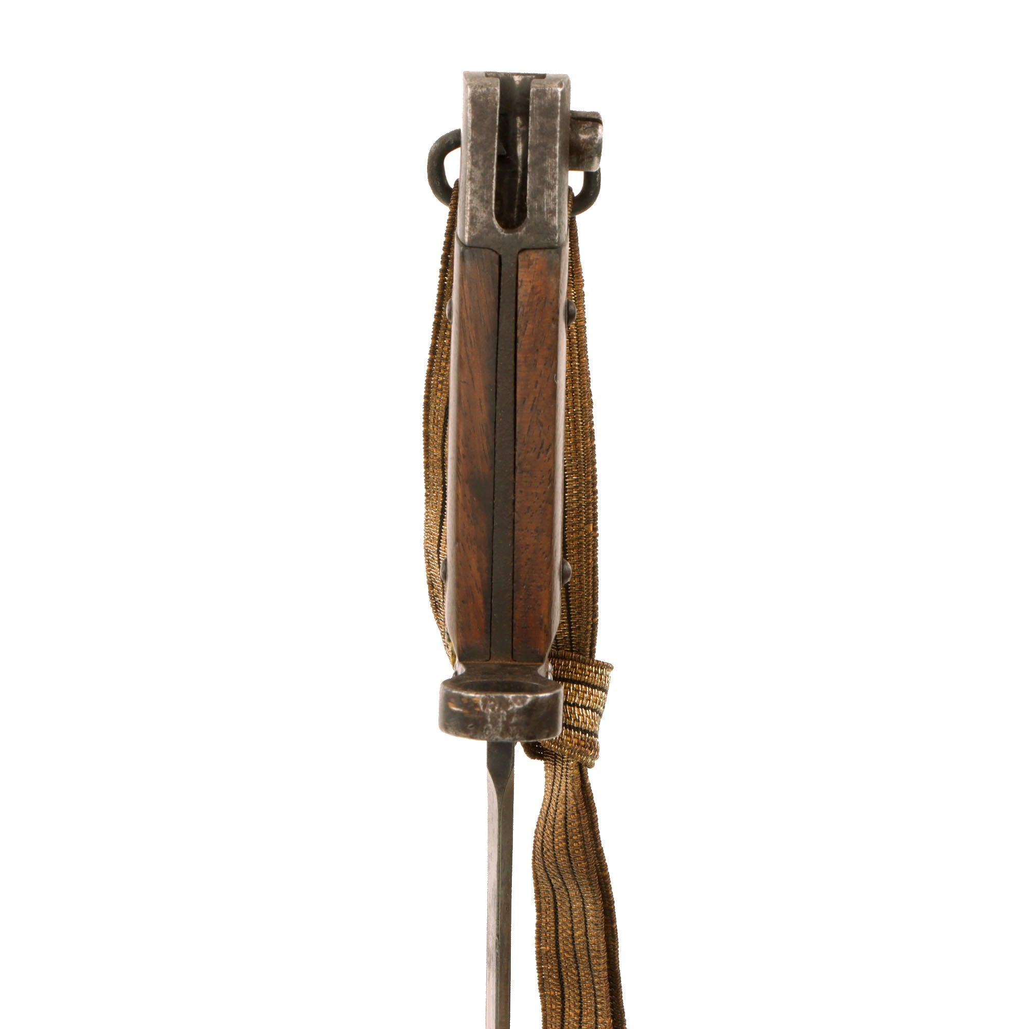 These normally have no quillon, and just a muzzle ring on the crossguard, but this is a rare version for NCOs, which has a hooked quillon and small swivel on the bottom. This was for attaching a Troddle knot to the bayonet, so that the NCO could easily be identified by the colorful knot on his bayonet. This was even more apparent when the bayonet was fixed onto the rifle. For more information please see Watts & White’s fine work The Bayonet Book, page 20, item 42.