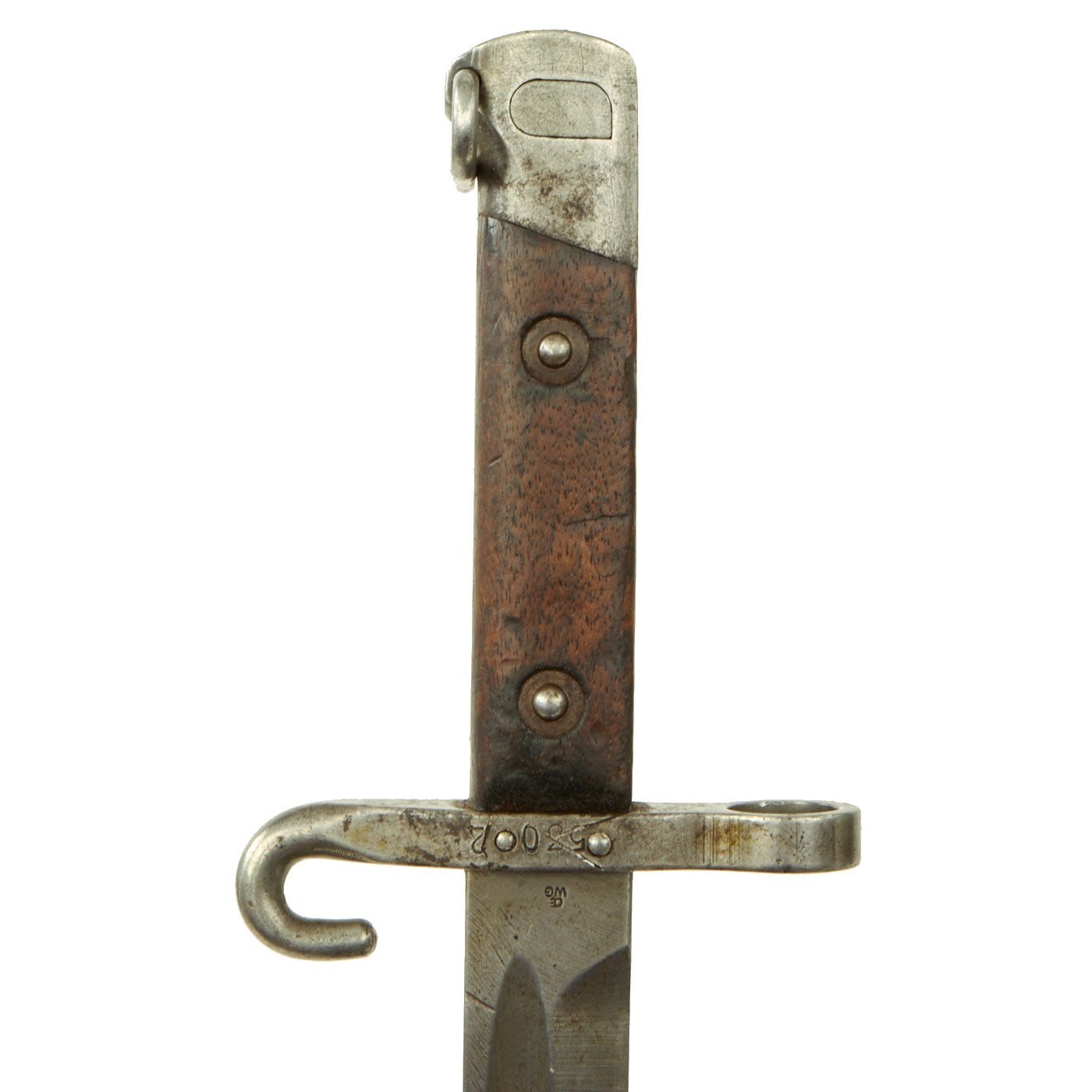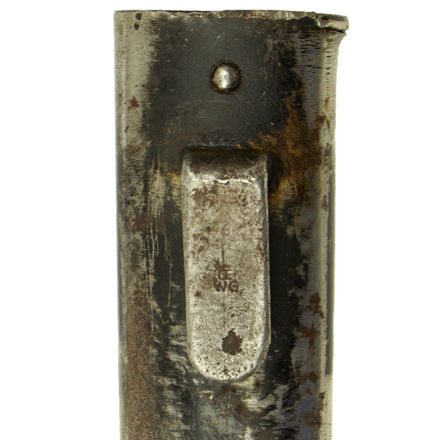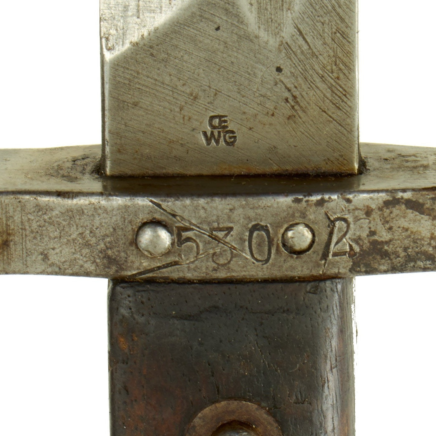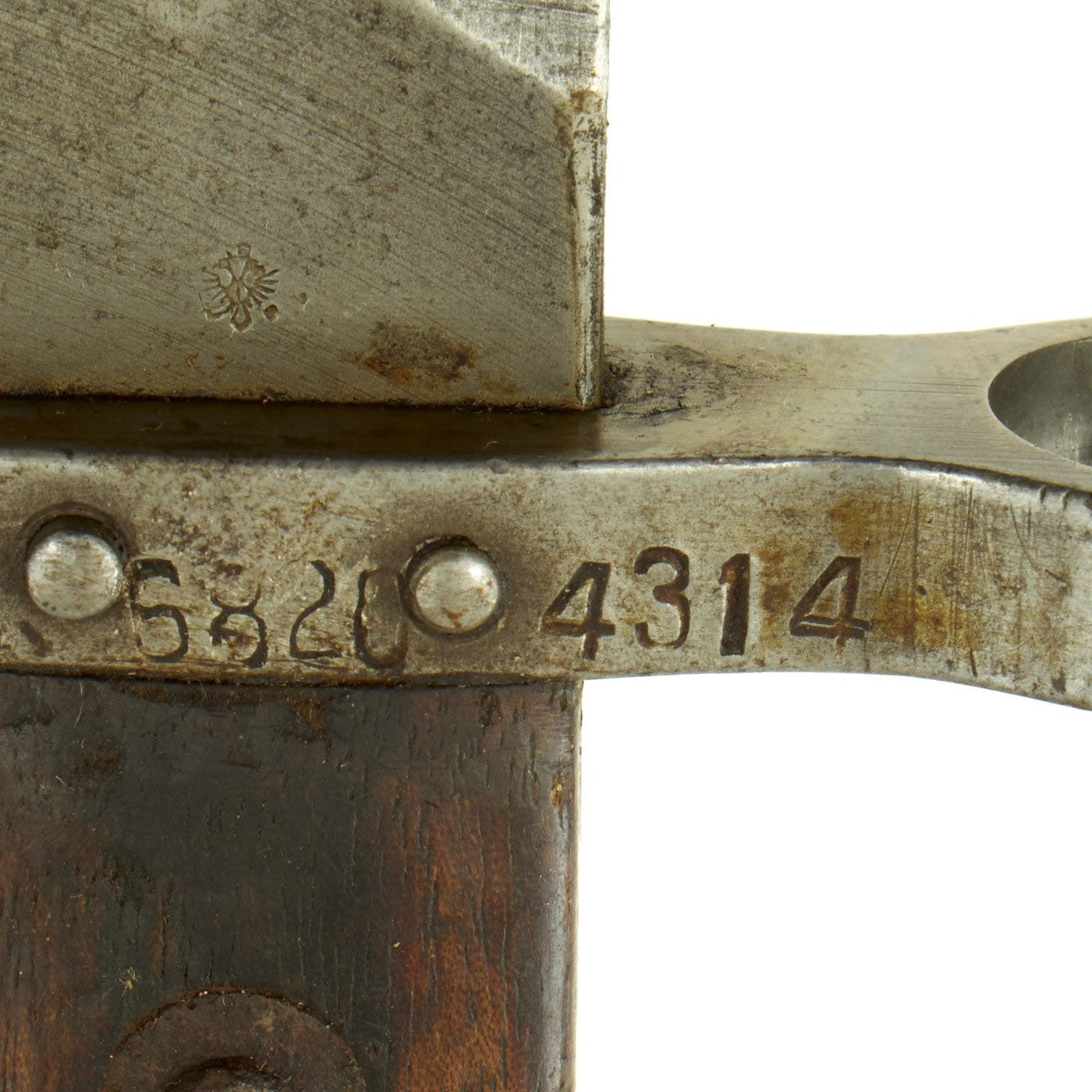 The bayonet and scabbard are both stamped with Œ over WG, the marking for Österreichische Waffenfabriksgesellschaft (Austrian Arms-Manufacturing Company), abbreviated as ŒWG. Steyr Mannlicher firearm production was a part of this company. The reverse ricasso of the bayonet has the Austrian Eagle proof mark.