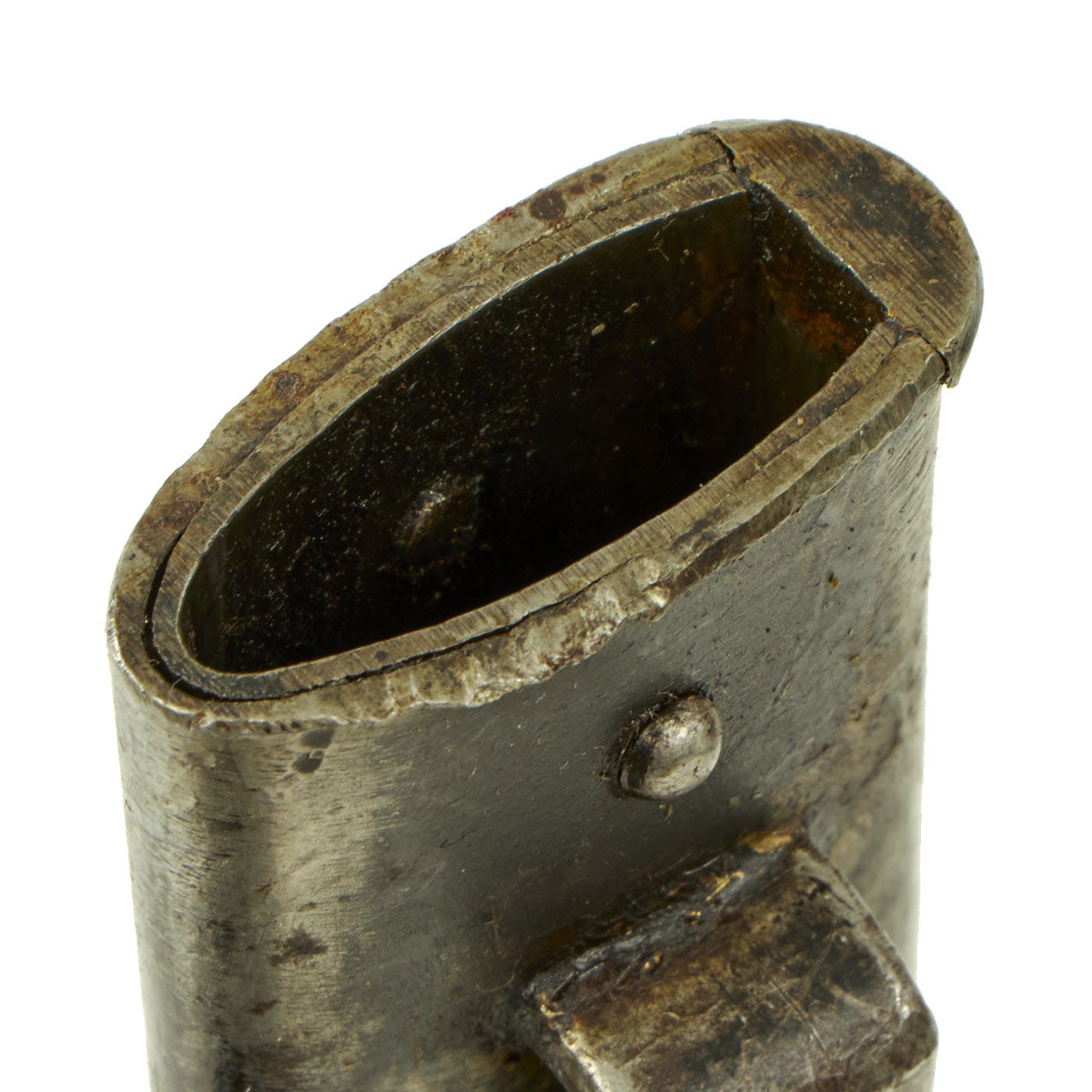 These normally have no quillon, and just a muzzle ring on the crossguard, but this is a rare version for NCOs, which has a hooked quillon and small swivel on the bottom. This was for attaching a Troddle knot to the bayonet, so that the NCO could easily be identified by the colorful knot on his bayonet. This was even more apparent when the bayonet was fixed onto the rifle. For more information please see Watts & White’s fine work The Bayonet Book, page 20, item 42.