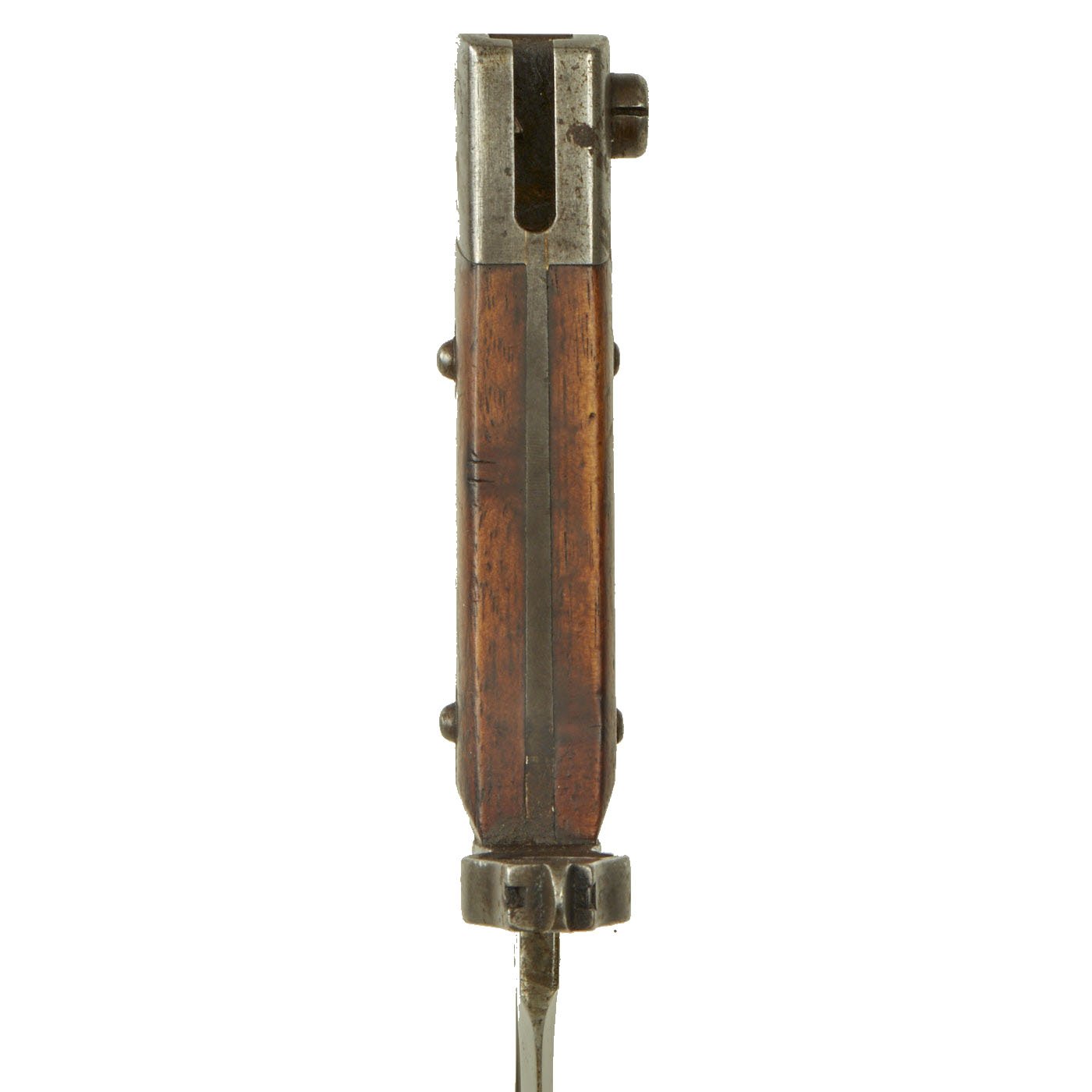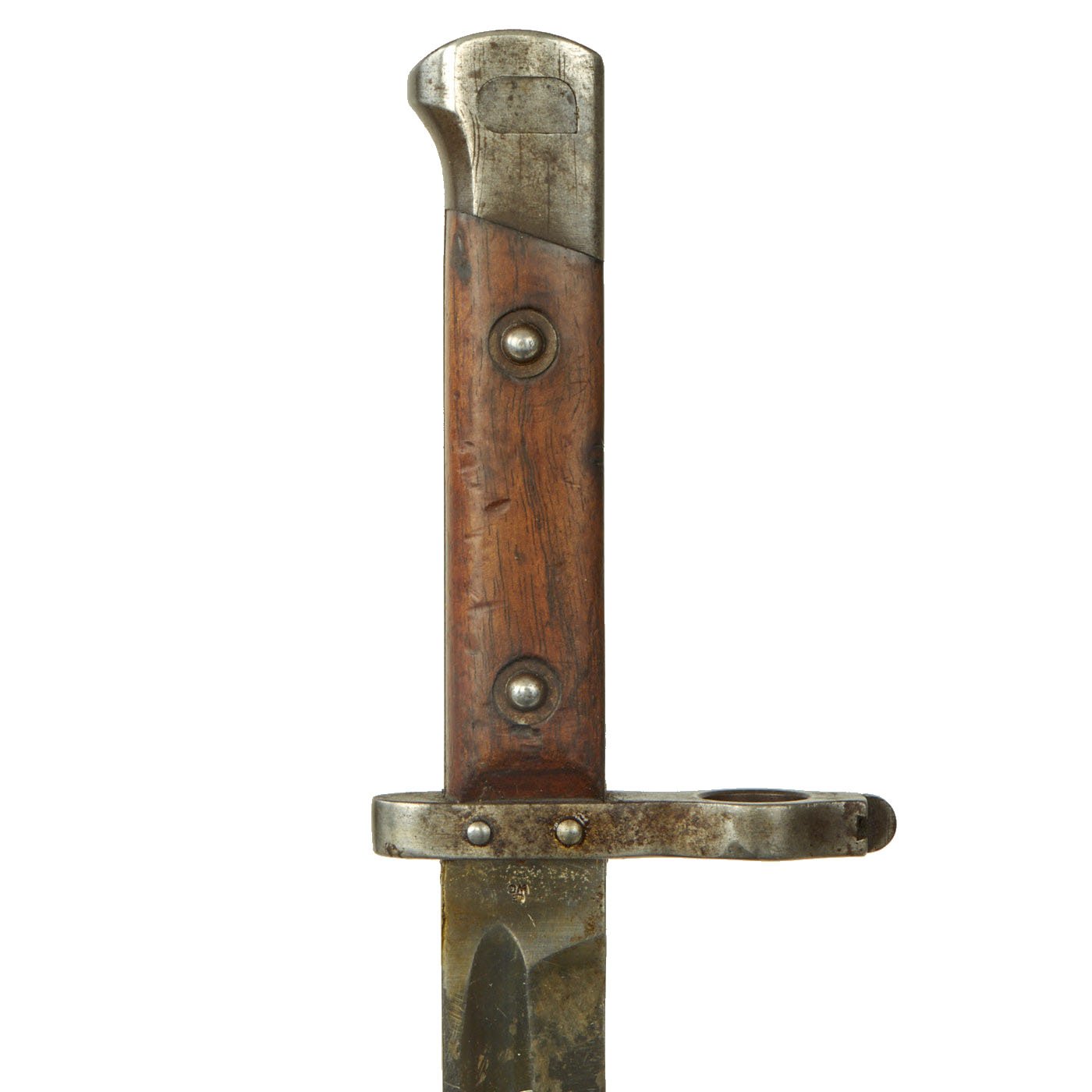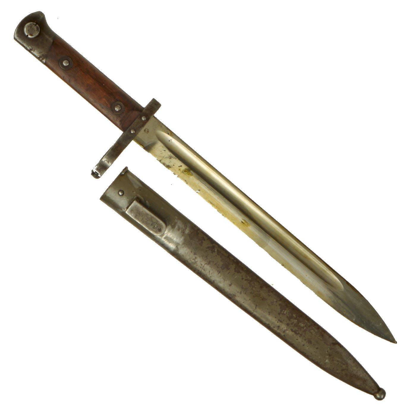 Condition of the bayonet is very good, with the original bright finish still well retained, with very little oxidation or damage of any kind. There is however some wear to the wooden grip scales. The steel scabbard was originally blued, but then painted green, a very common color used during WWI to repaint scabbards. This is now mostly worn away, and there is very little denting of any kind on the scabbard.
