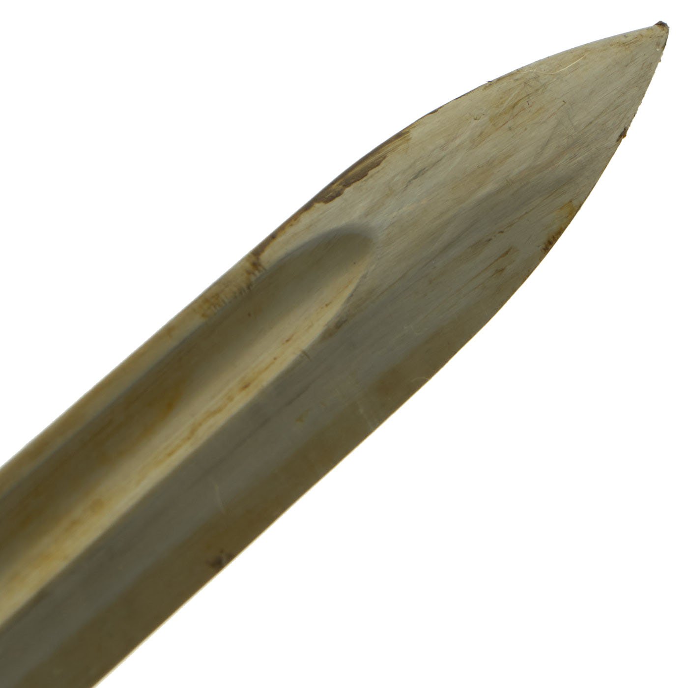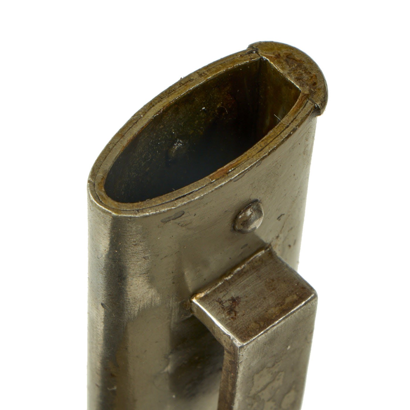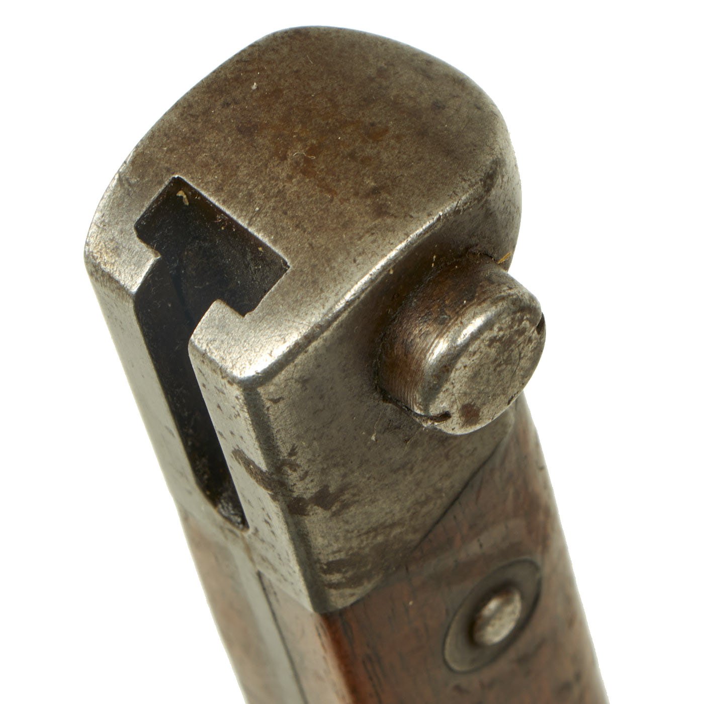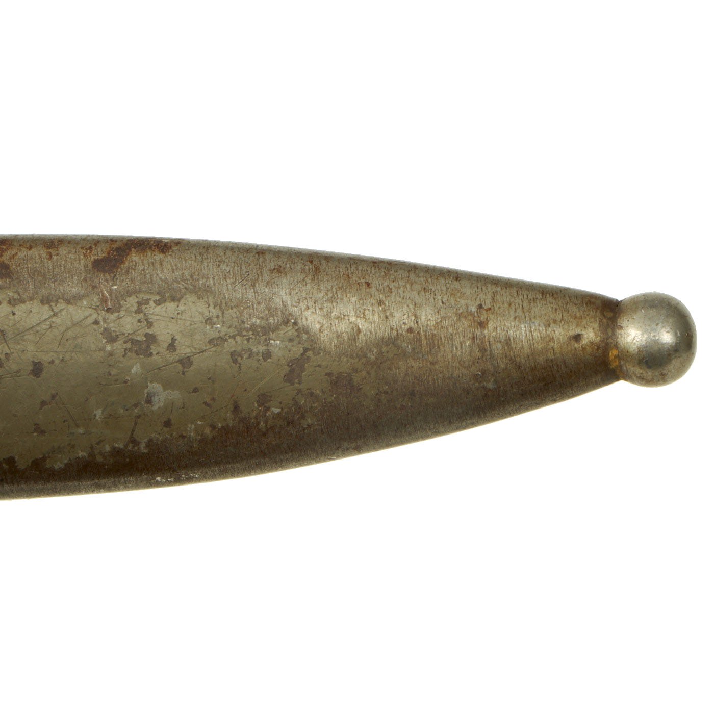 Condition of the bayonet is very good, with the original bright finish still well retained, with very little oxidation or damage of any kind. There is however some wear to the wooden grip scales. The steel scabbard was originally blued, but then painted green, a very common color used during WWI to repaint scabbards. This is now mostly worn away, and there is very little denting of any kind on the scabbard.