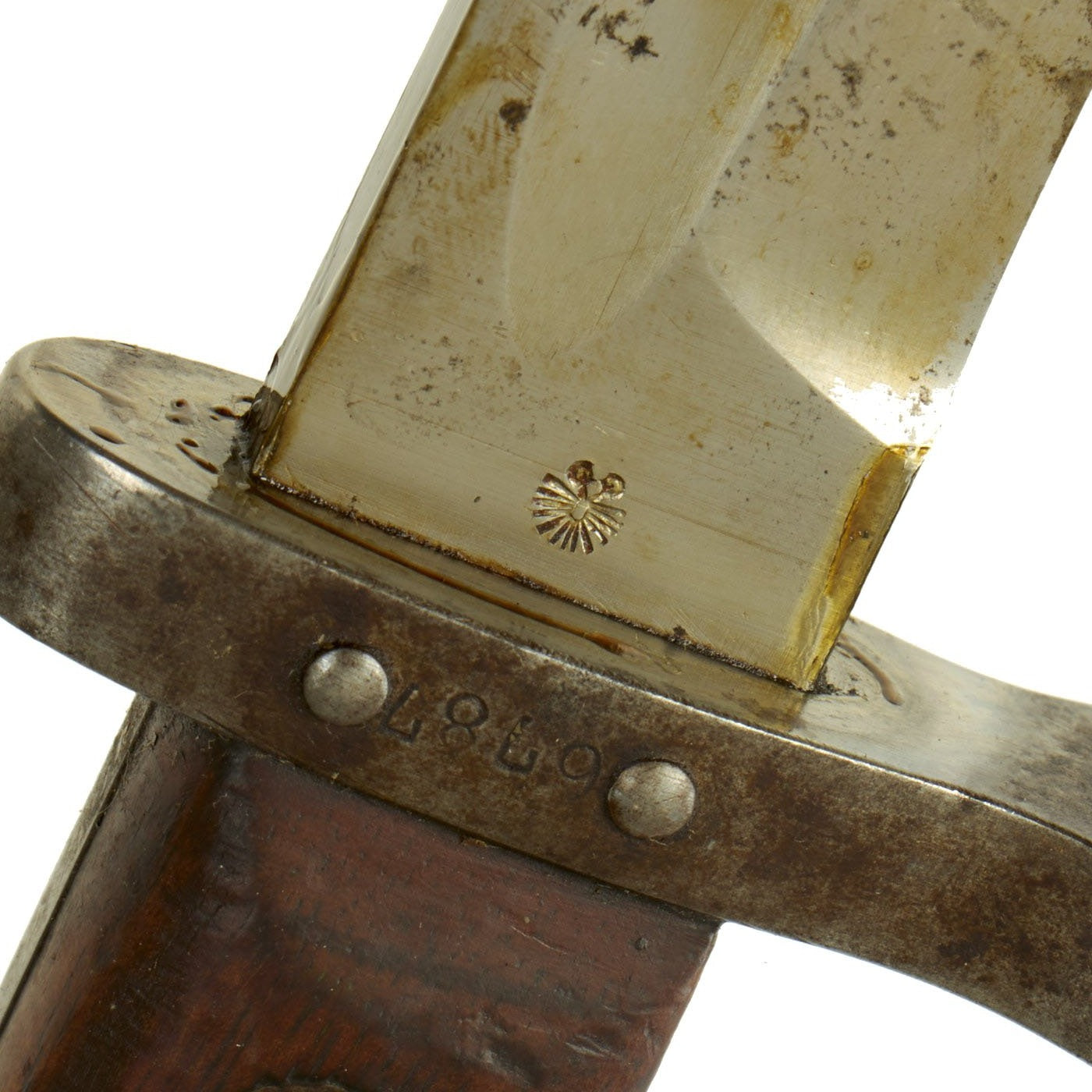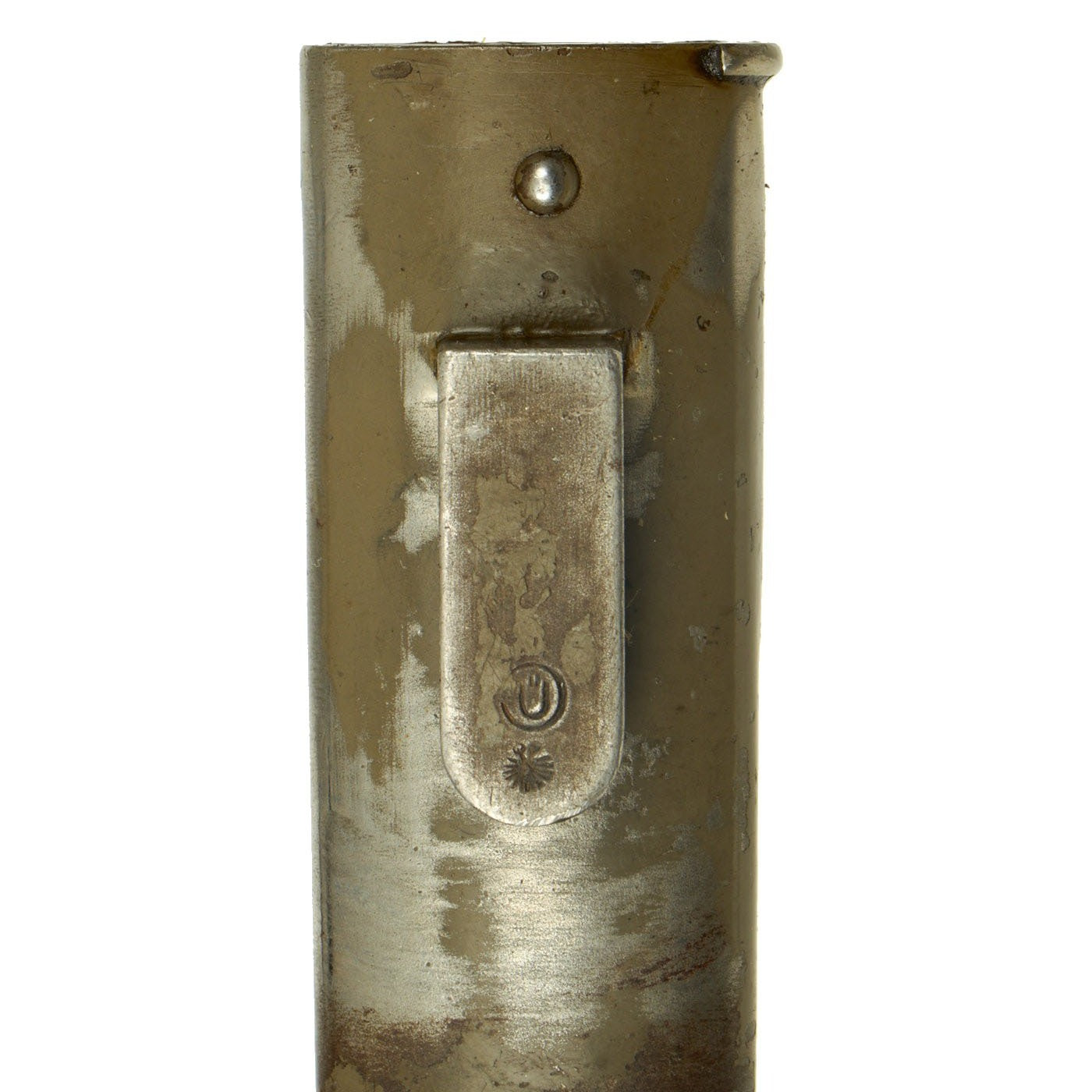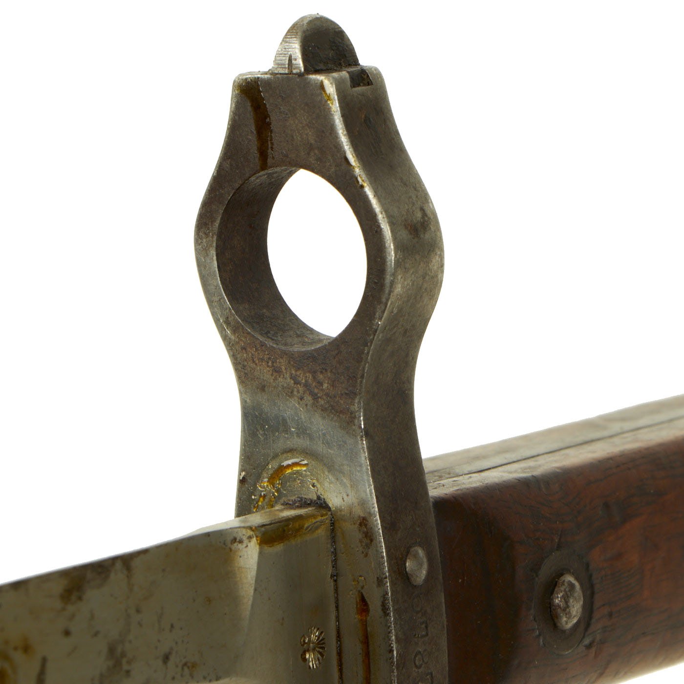 The bayonet is stamped with Œ over WG, the marking for Österreichische Waffenfabriksgesellschaft (Austrian Arms-Manufacturing Company), abbreviated as ŒWG. Steyr Mannlicher firearm production was a part of this company. The reverse ricasso of the bayonet has the Austro-Hungarian Empire's Eagle proof mark stamped. The scabbard has a U in a circle on the frog button, for Moravske Ocelarny (Moravian Steelworks), which is now part of the Czech republic, but was under the rule of Austria until 1918.