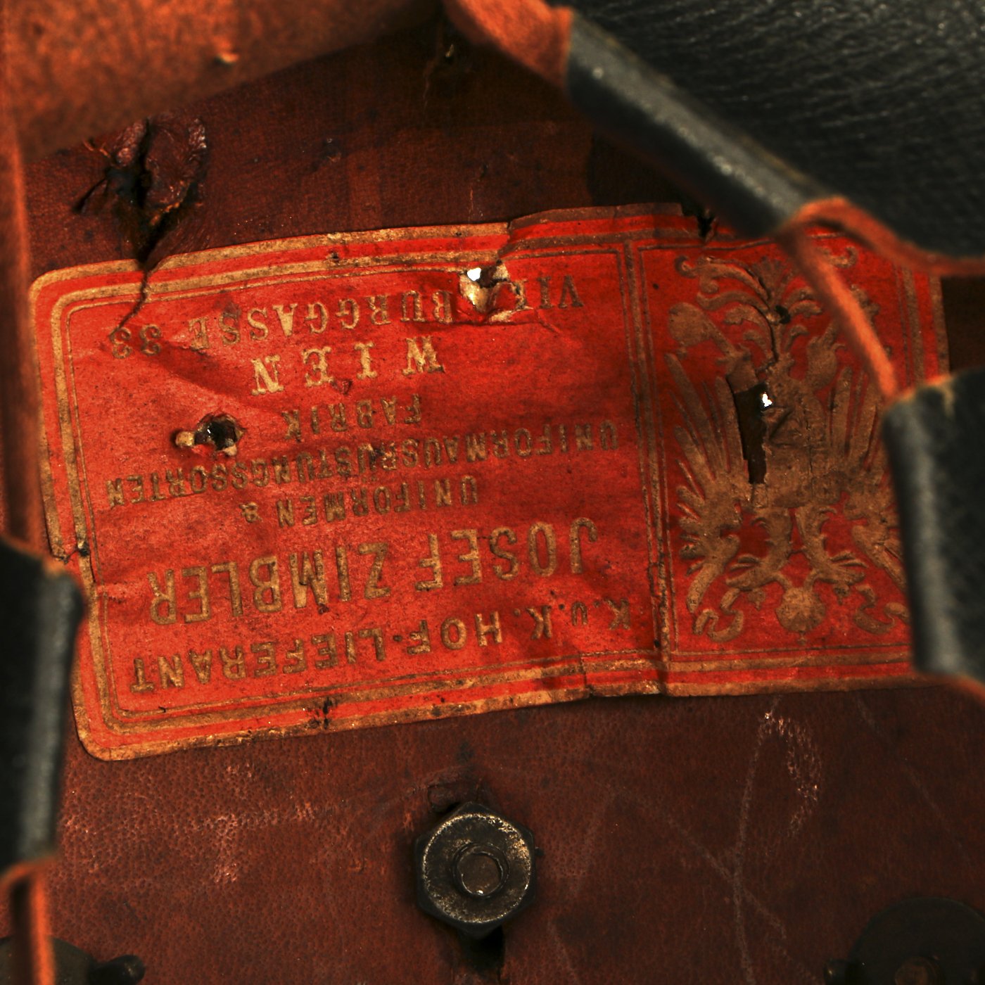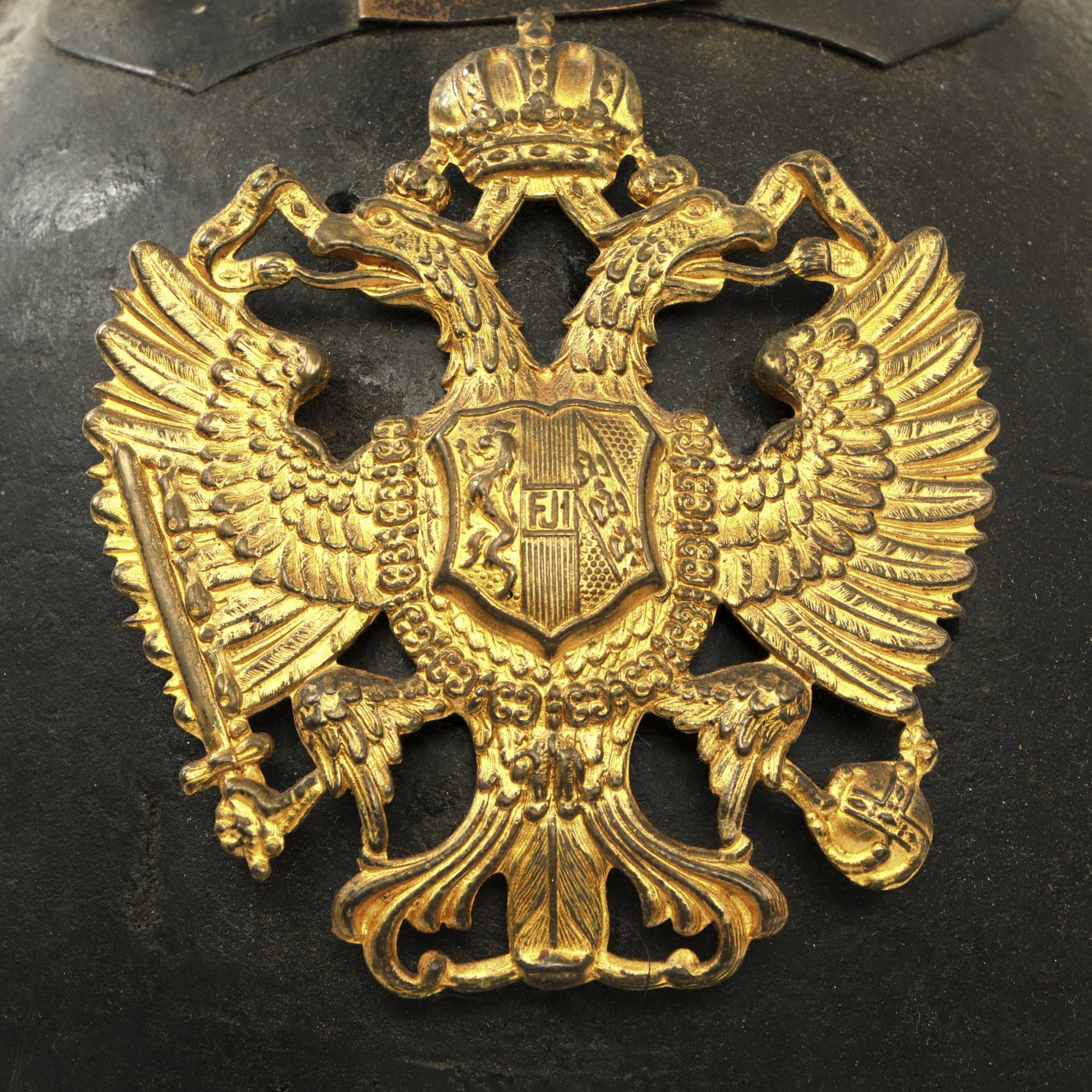 The helmets Wappen (Front Plate) Shows the Austrian Imperial Double-headed Eagle holding a sword and orb in its talons. The central Escutcheon shows the marshaled arms of the Habsburg, Babenberg and Lorraine houses, with FJI in the center, for Franz Joseph I of Austria. He was Emperor of Austria from 1848 until his death in 1916.