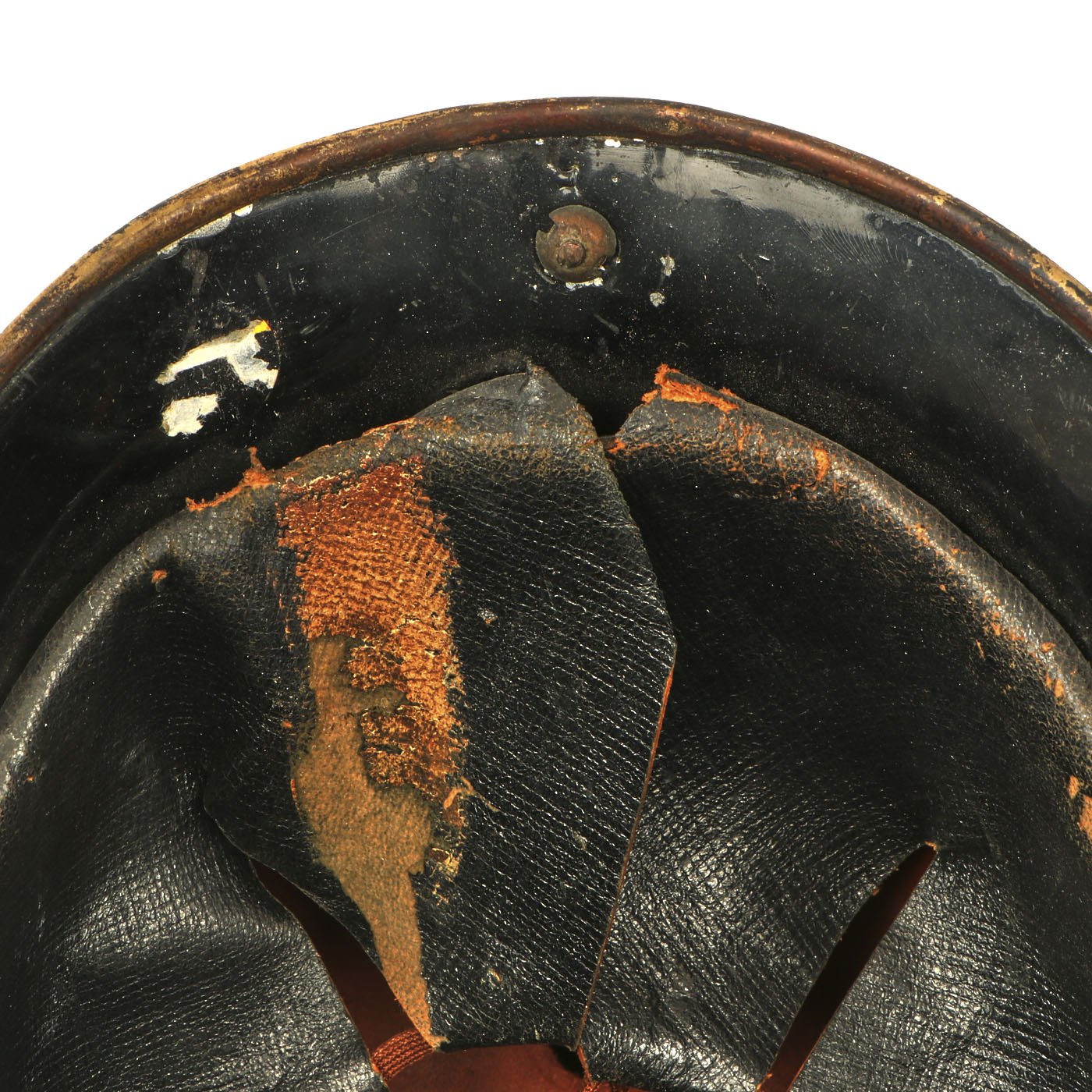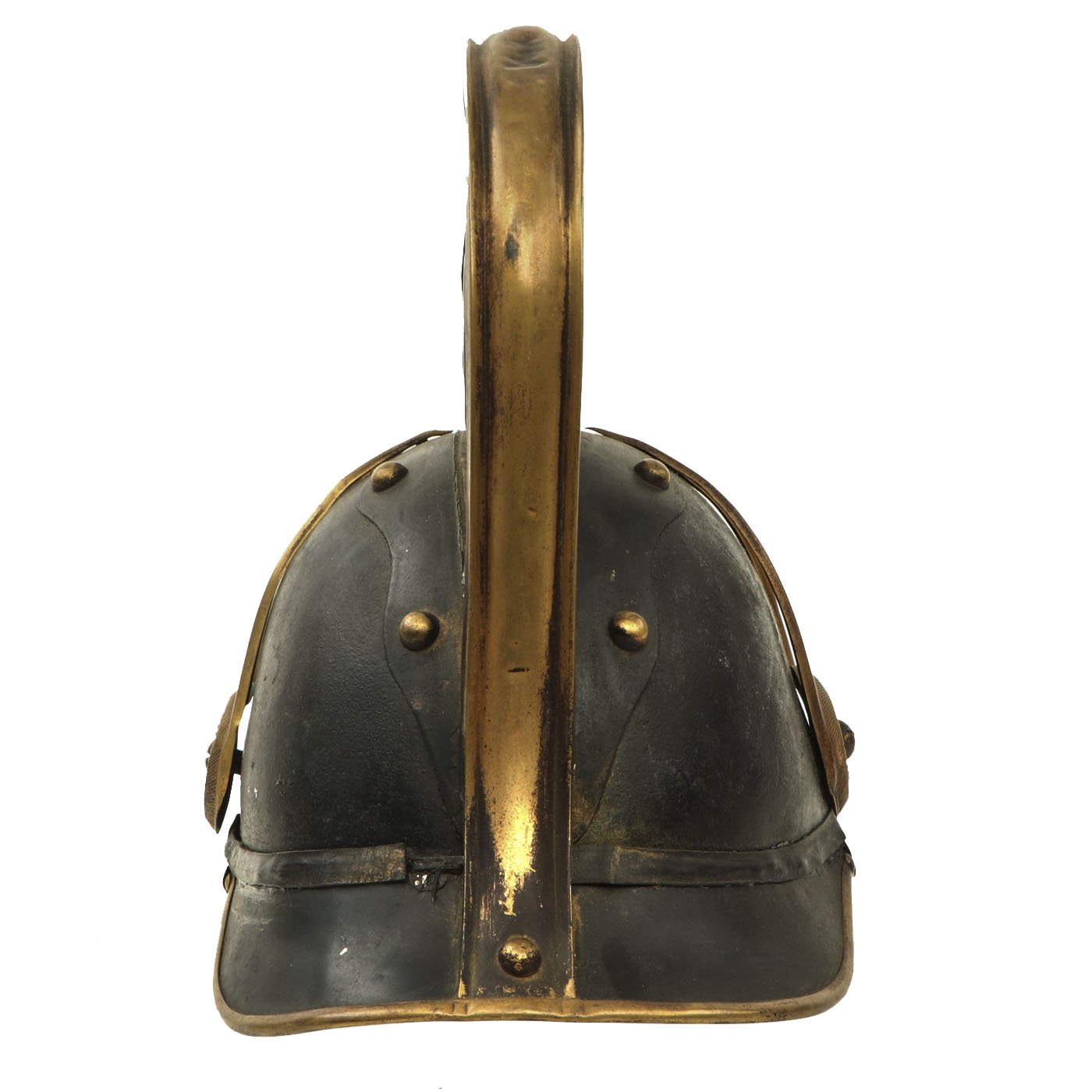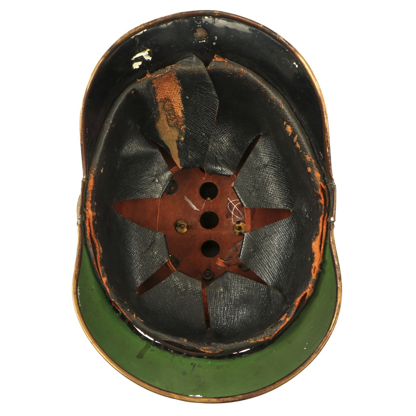The helmet is made from a pressed or boiled leather central body, with brass fitted steel front and rear visors. The comb is also steel with a brass central portion. The liner is black finished leather, and still has the original top tie strap.