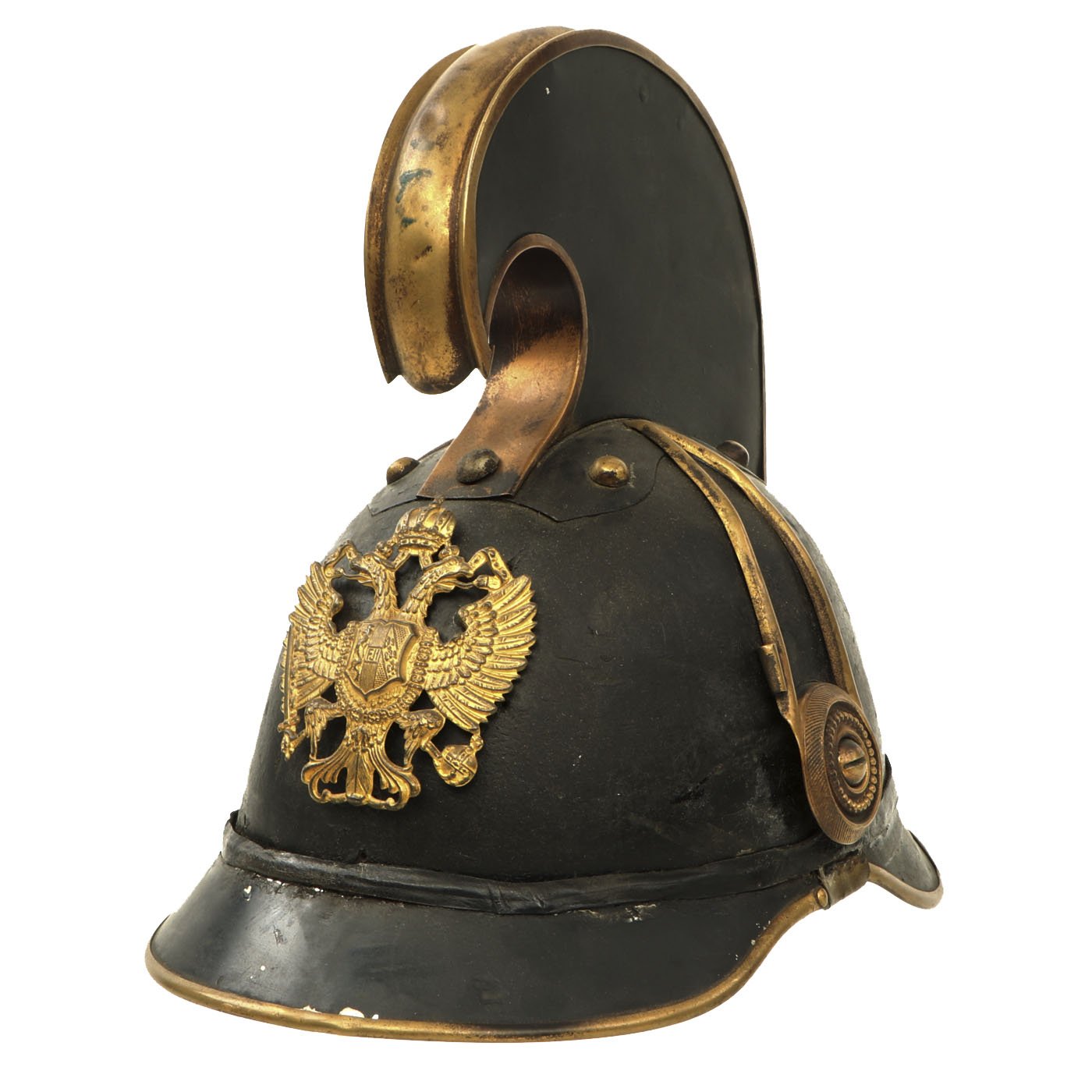 Original Item: Only One Available. This is a very nice condition Austrian Model 1905 Dragoon's Helmet, intended for use by Enlisted Men. Officer's would wear a far more ornate version with chin scales and embossed brass panels on the side of the comb, showing a Lion battling a Snake. "Dragoon" mounted cavalry units were ubiquitous in Europe, and were skilled at both mounted and dismounted fighting. By WWI, they were outdated, but they still enjoyed great prestige, and had the helmets to match.
