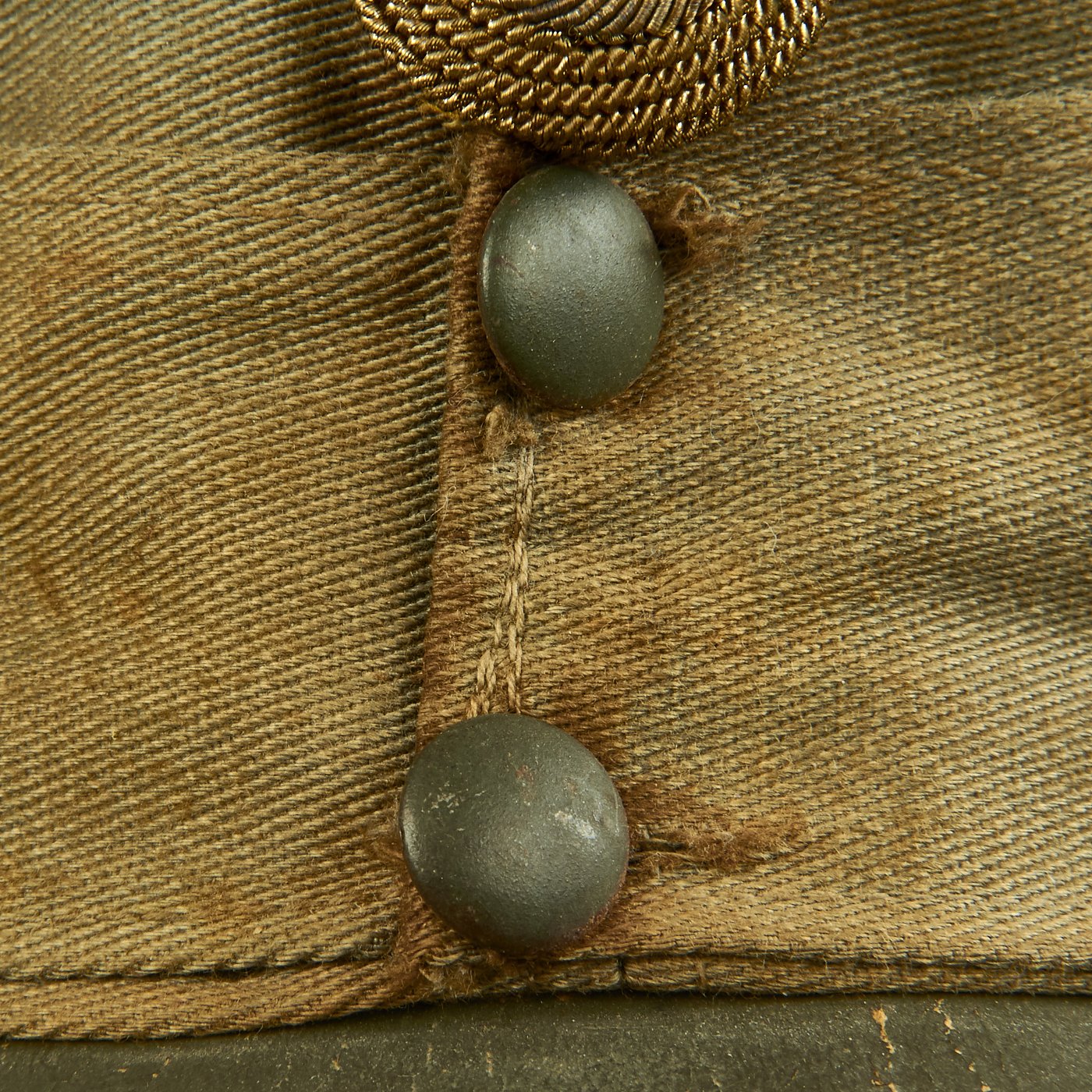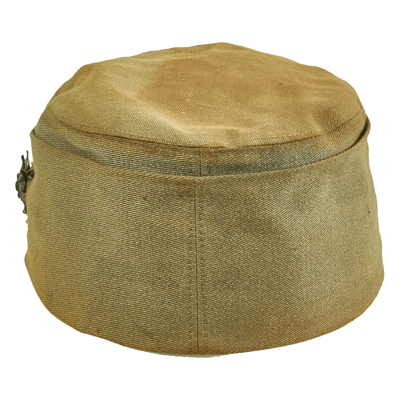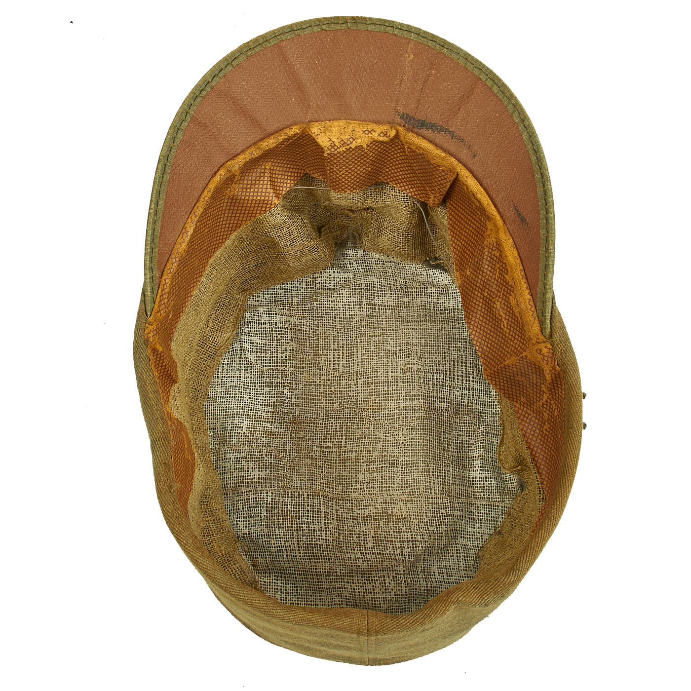 This is a fantastic and rare Word War One Austrian Landesschützen Officer's Model 1915 field cap. Constructed of feldgrau wool cloth, large high relief gold bullion cockade and WW1 Austro-Hungarian Edelweiss pin. Two painted front buttons hold the pull-down side ear/neck cover Interior has a brown leather sweatband and a cheesecloth lining.