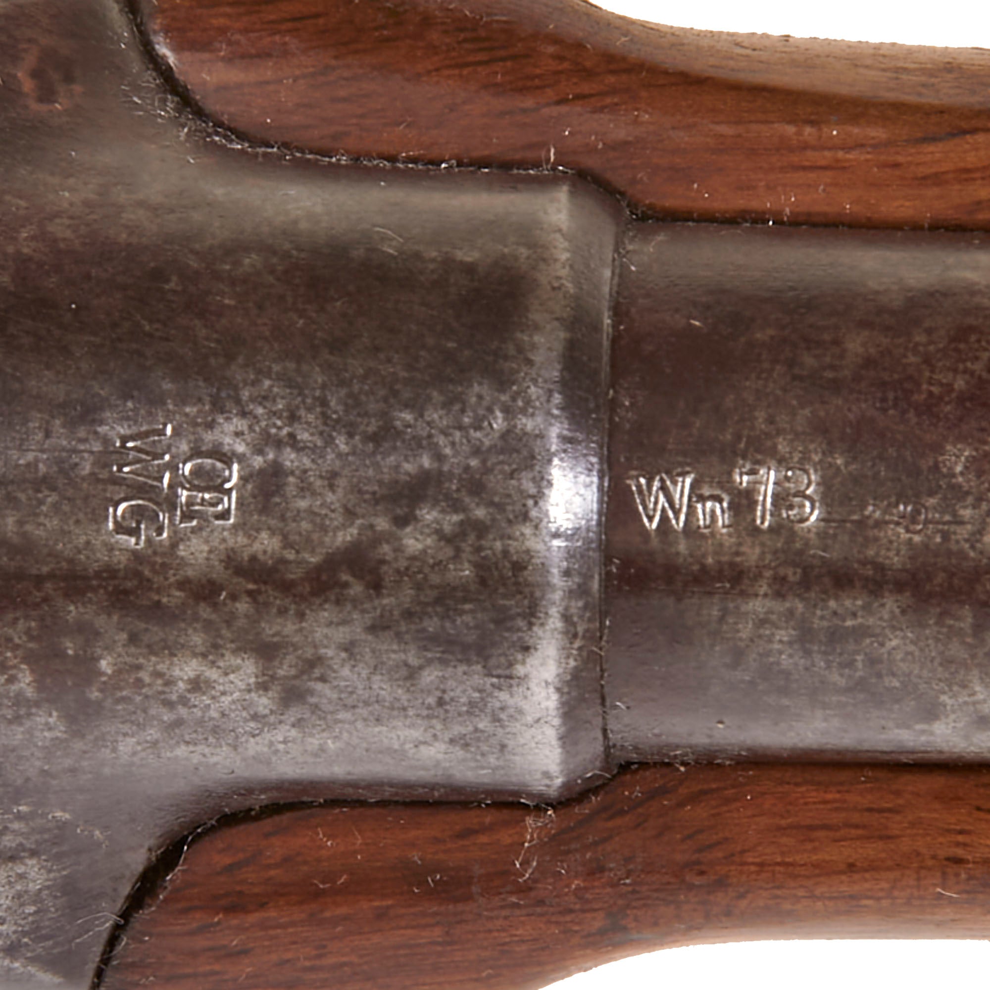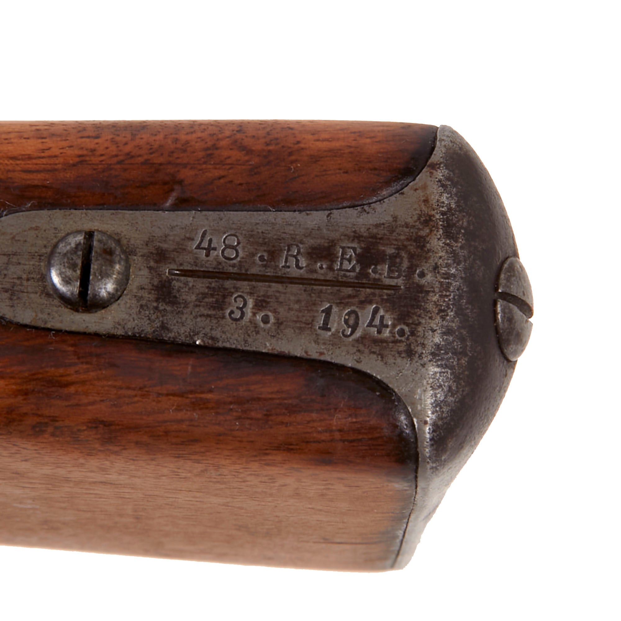 ŒWG (Österreichische Waffenfabriksgesellschaft) produced the Werndl and chambered it for the 11mm scharfe Patrone M.67 (11.15×42R) cartridge. In 1877 the military rechambered the Werndl for the bottleneck 11mm scharfe Patrone M.77 (11.15×58mmR) cartridge. Some were marked WERNDL on the receiver, while others such as this are marked with the Œ / WG logo. It is also marked Wn73 on the barrel, a proof mark indicating production in Wien (Vienna) during 1873, the year following the lock. The rifle also has regimental markings on the butt plate tang, which appear to read 48. R. E. B. / 3. 194., probably for the 48th Regiment, Ersatz Battalion.