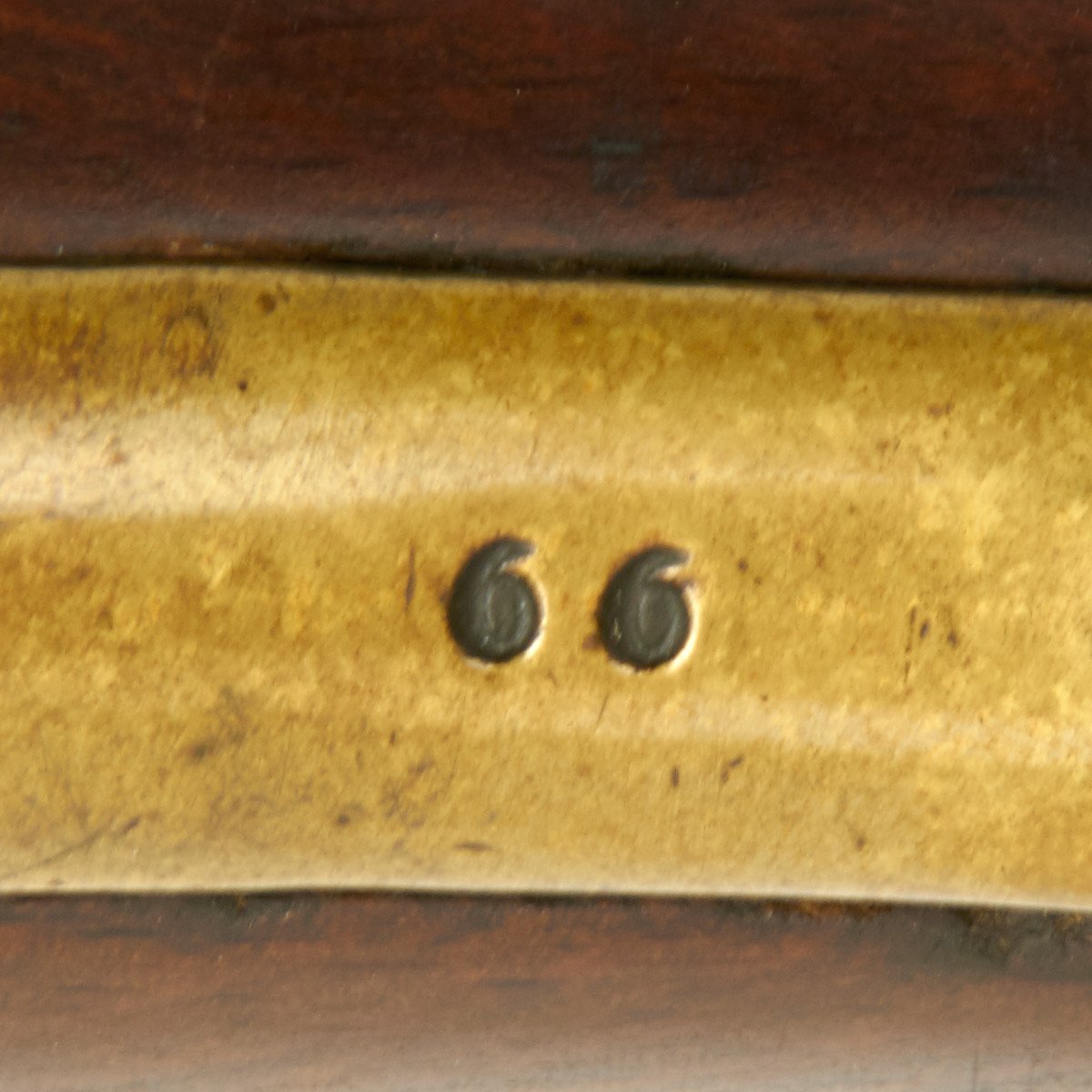 The rifle is 48" in overall length, the barrel being 33". The lock plate is stamped "851" indicating manufacture in 1851. The rifle comes with the original all steel ramrod. Butt stock has integral wood cheek piece and the brass trigger guard has the cast in ramp behind the bow to act as a pistol grip indicating this particular weapon was issued to sappers and miners.