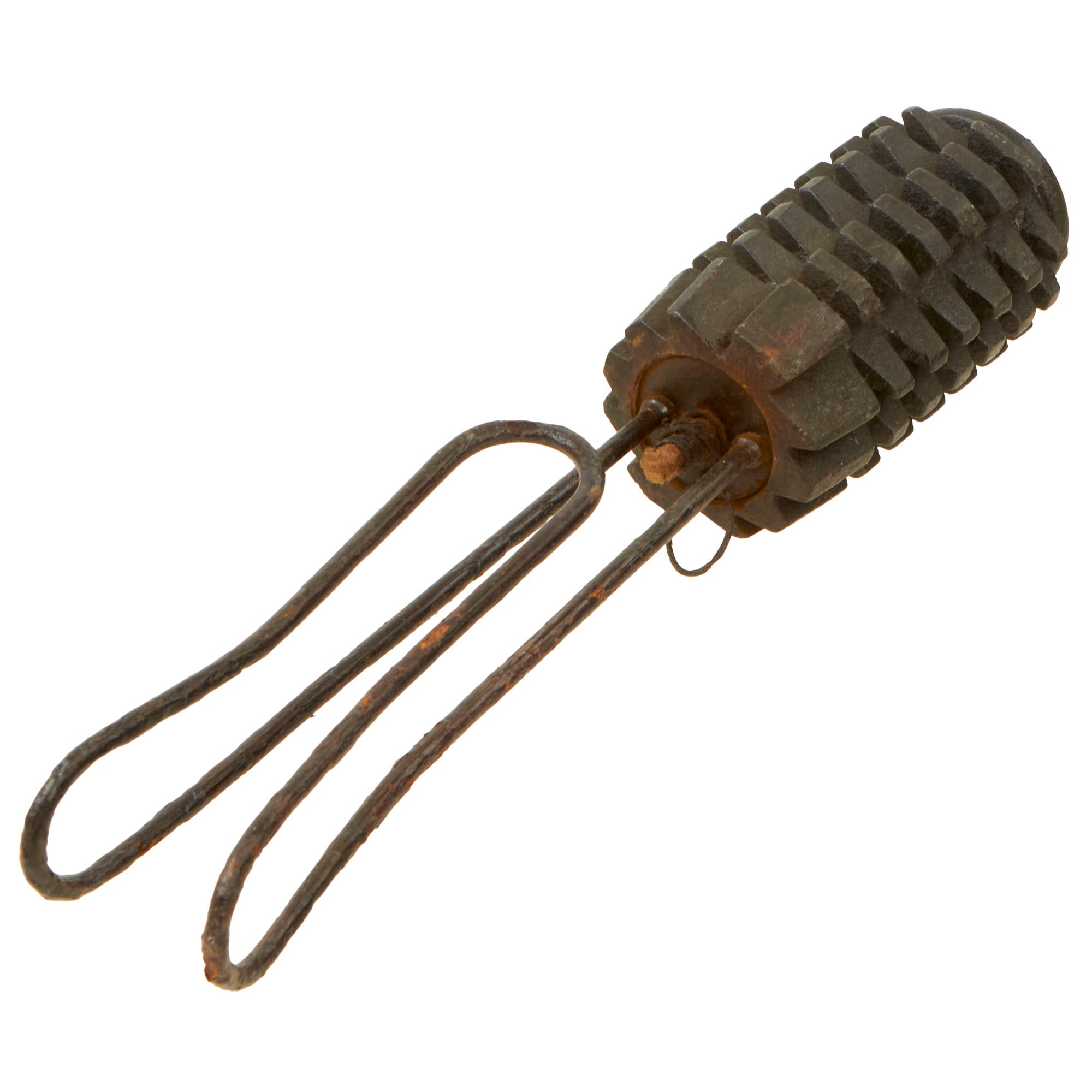 The M15 design was modular, and several different configurations have been seen. This example has the usual wire handle / belt hanger, which screws into the bottom of the grenade body. In the center of the mounting plate, there is a friction pull fuze, which still has the pull string. The exterior is very good, with little rust, and a lot of the original clear finish present. The original fuze is great, and the bottom handle unscrews to show the interior.