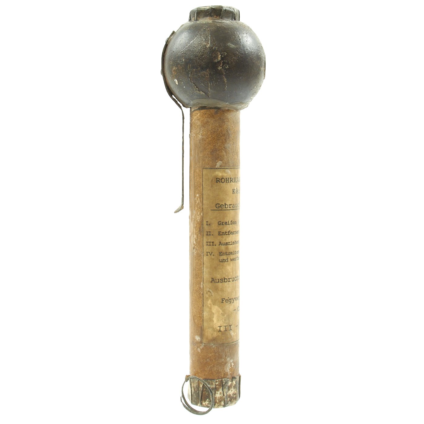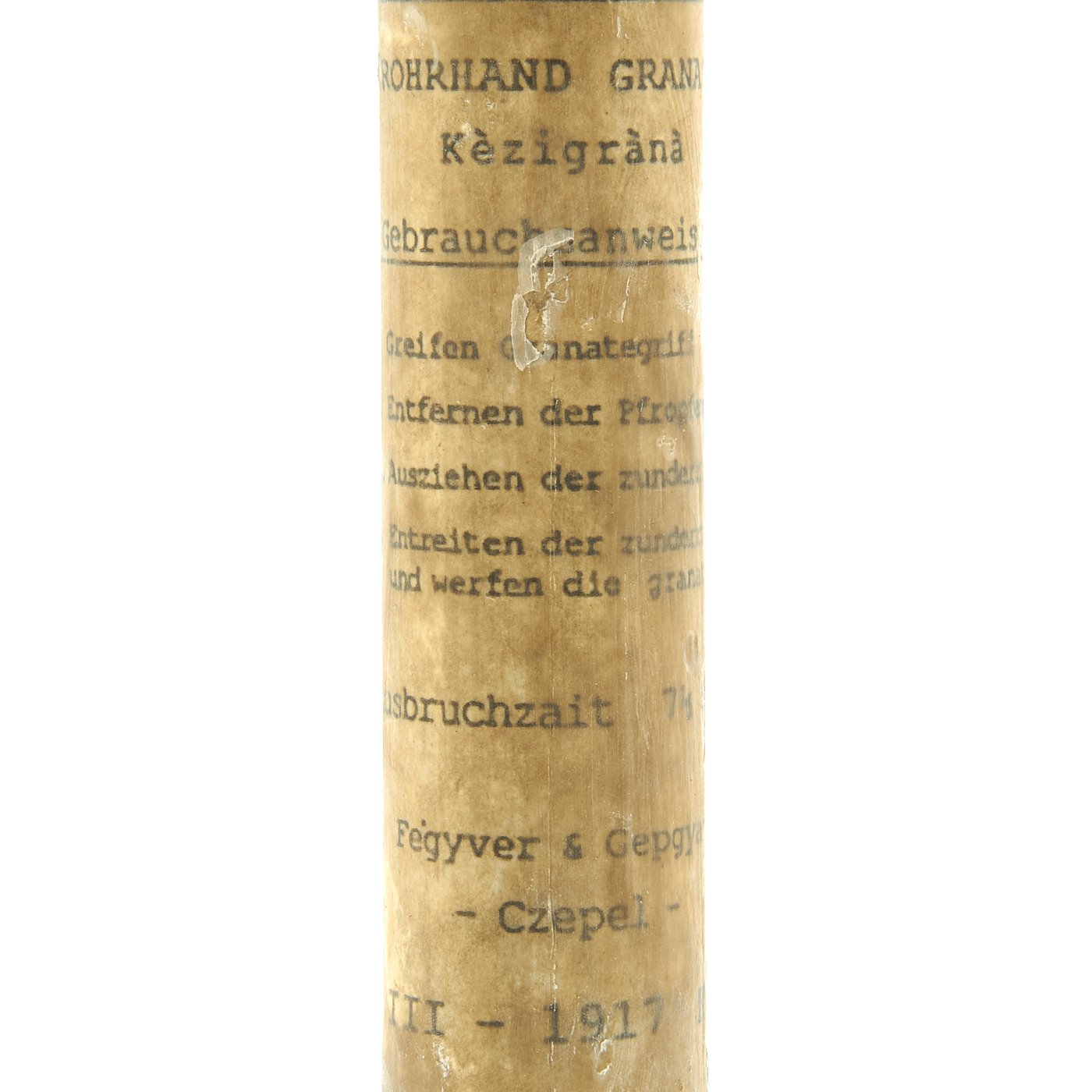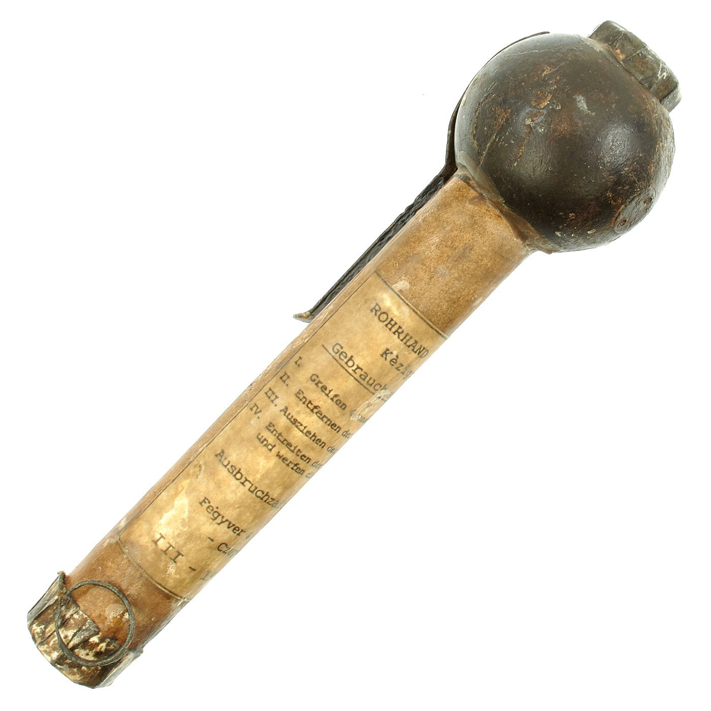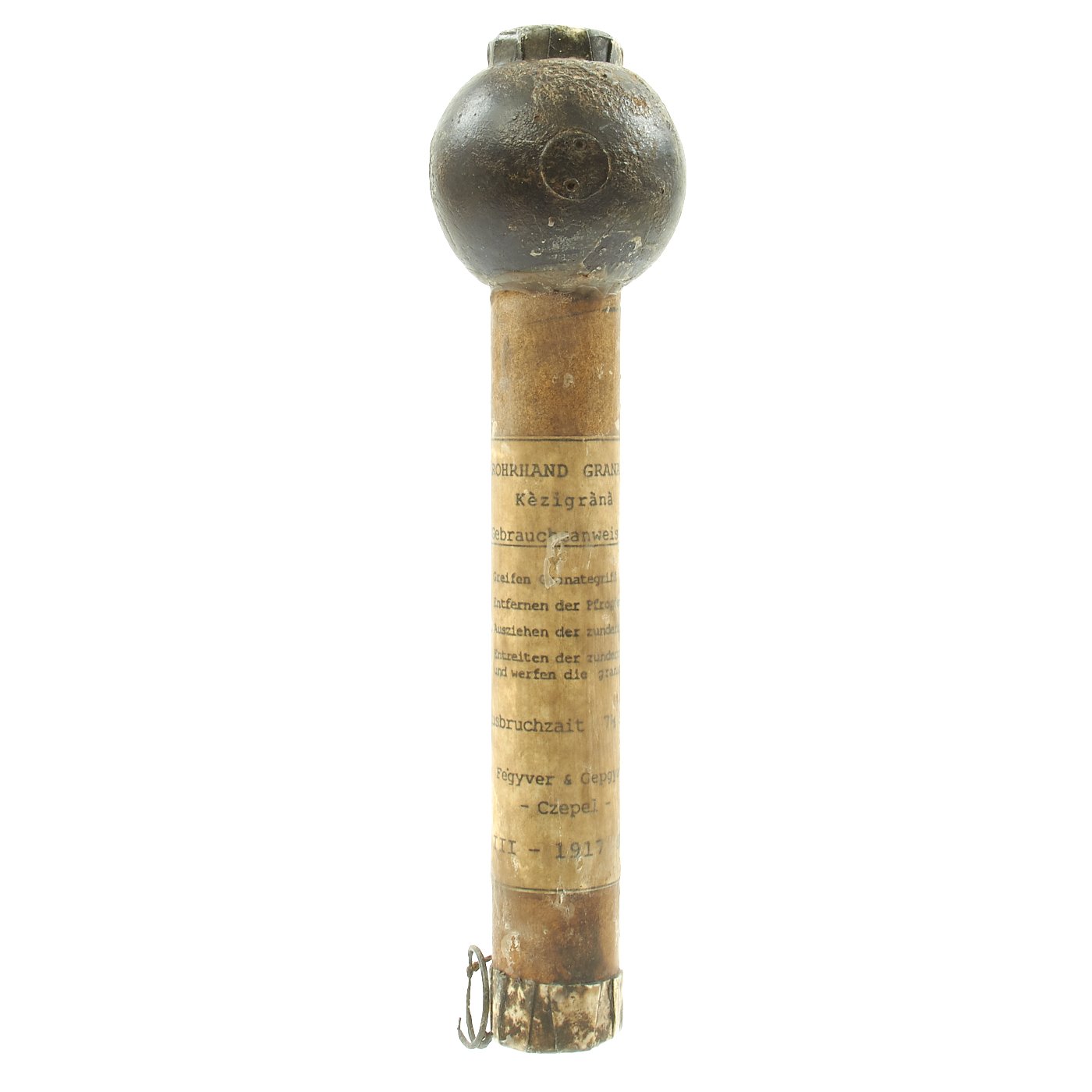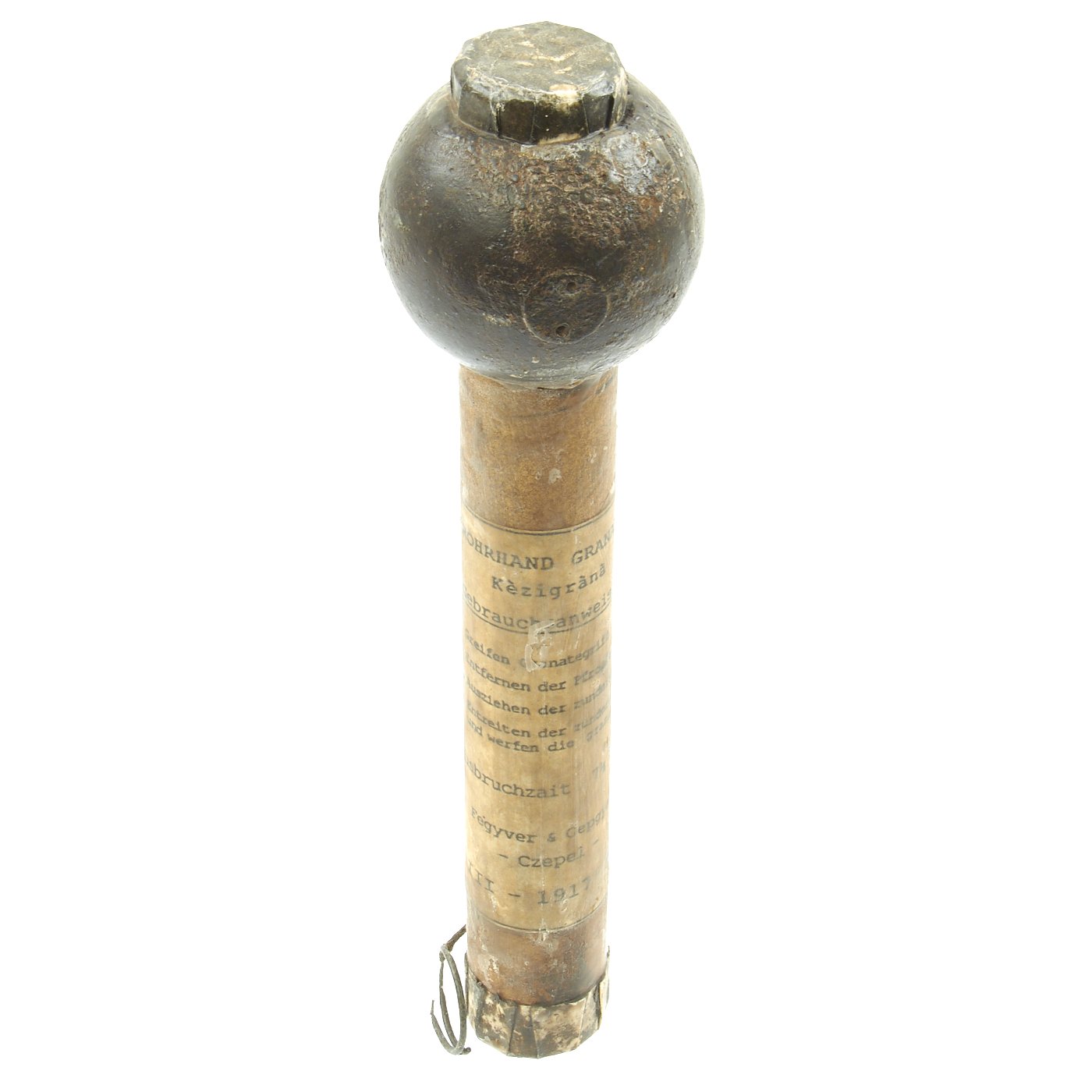 Original Item: Only One Available. This is a totally inert BATF complaint Austro-Hungarian Rohrhandgranate (Pipe Hand Grenade) used during WWI, complete with an original label with a 1917 date. This is the rare alt (old) version with a ball-shaped head designed for fragmentation. The usual type found is the neu (new) type with the cylindrical head, which is the "high explosive" type. It is totally inert, cannot be converted to an explosive devise.