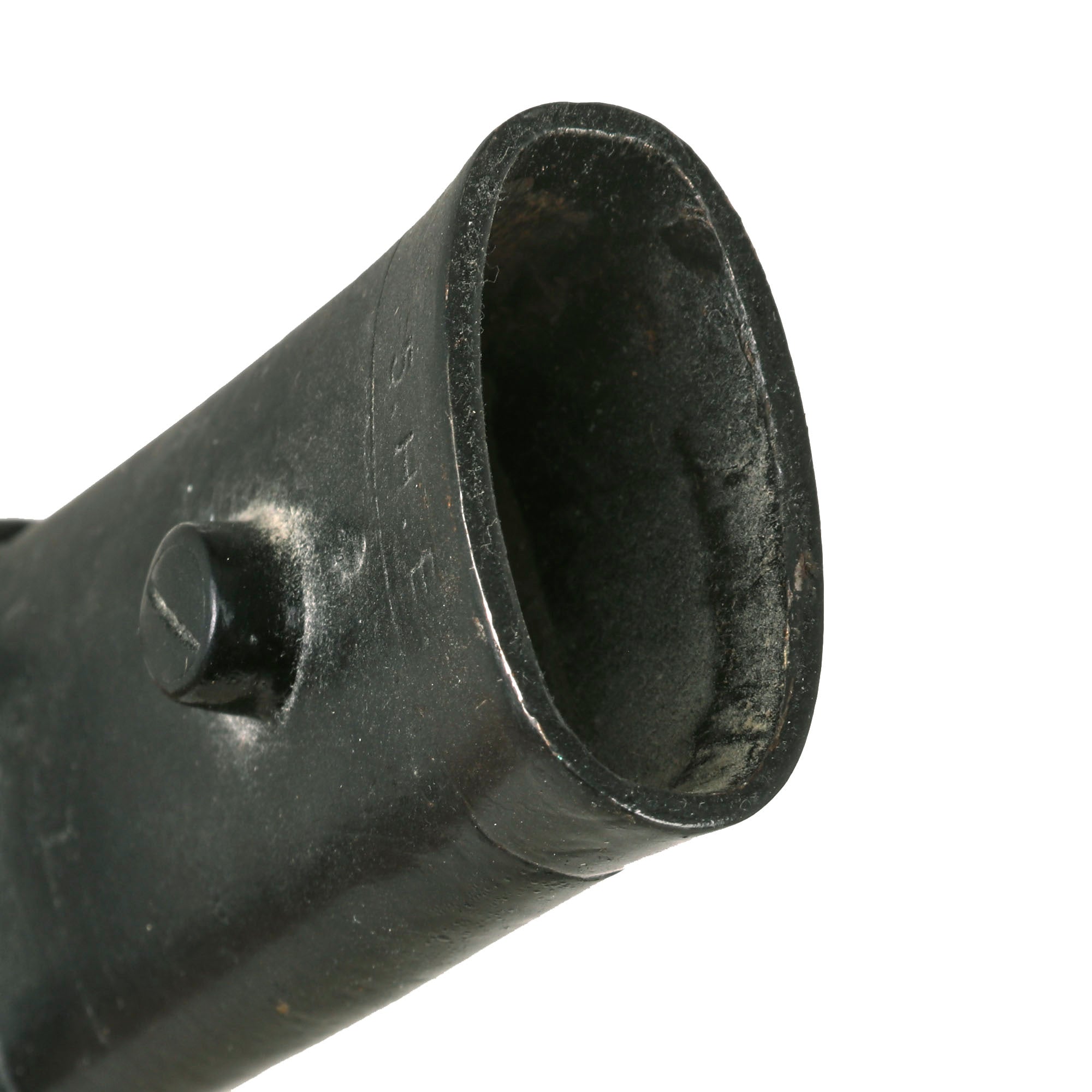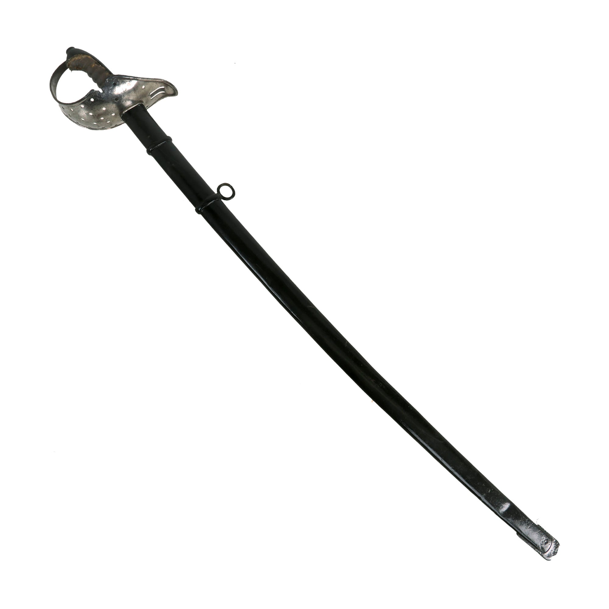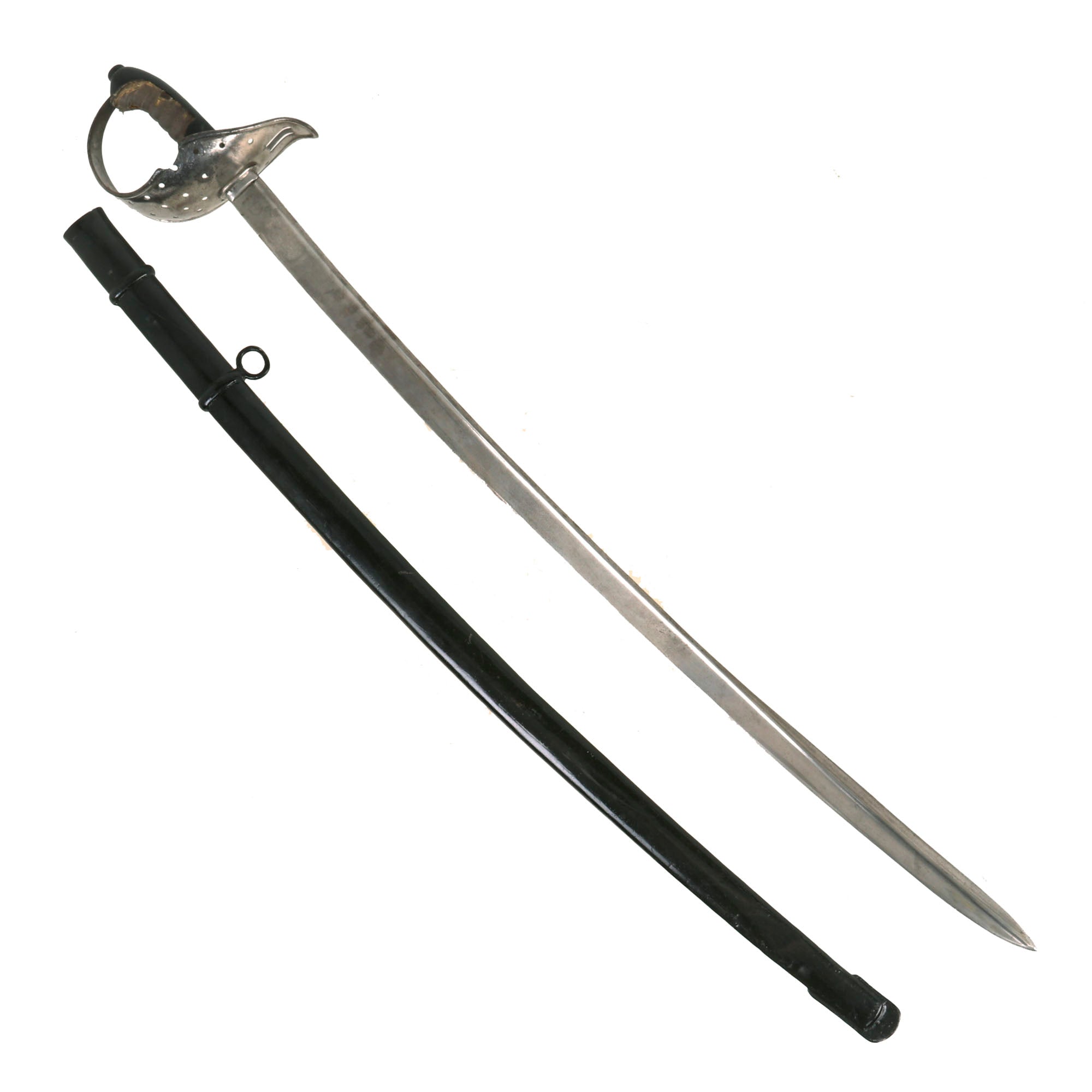 The original 35¼” steel scabbard retains much of its original black paint, with chipping present. It is marked on the throat with 5.H.E., possibly a unit marking, and on the other side with 179, likely a soldier or rack number.
