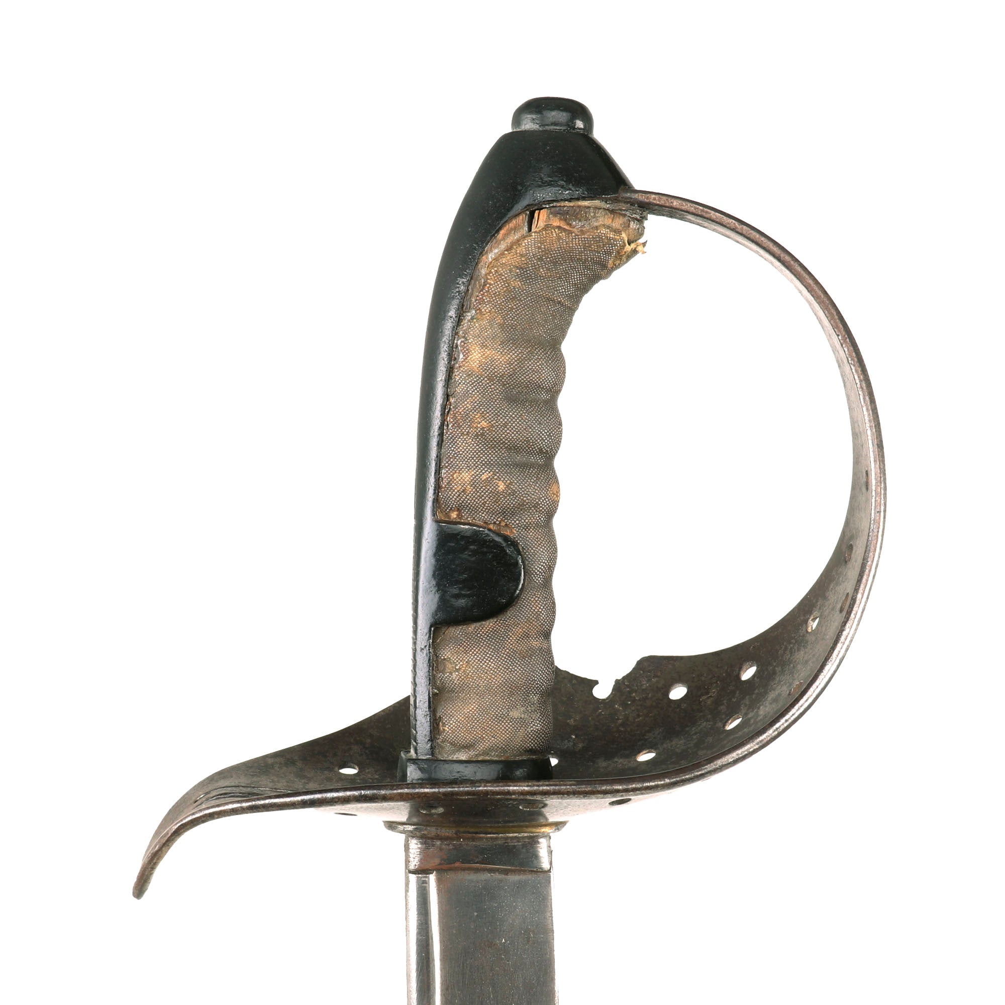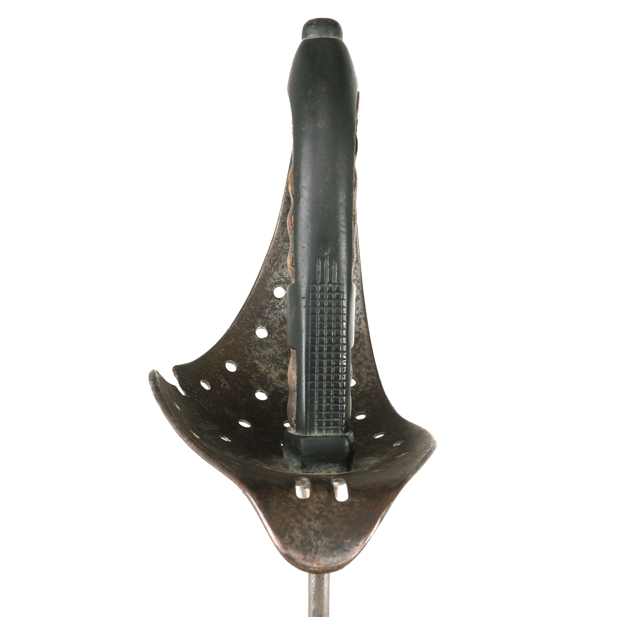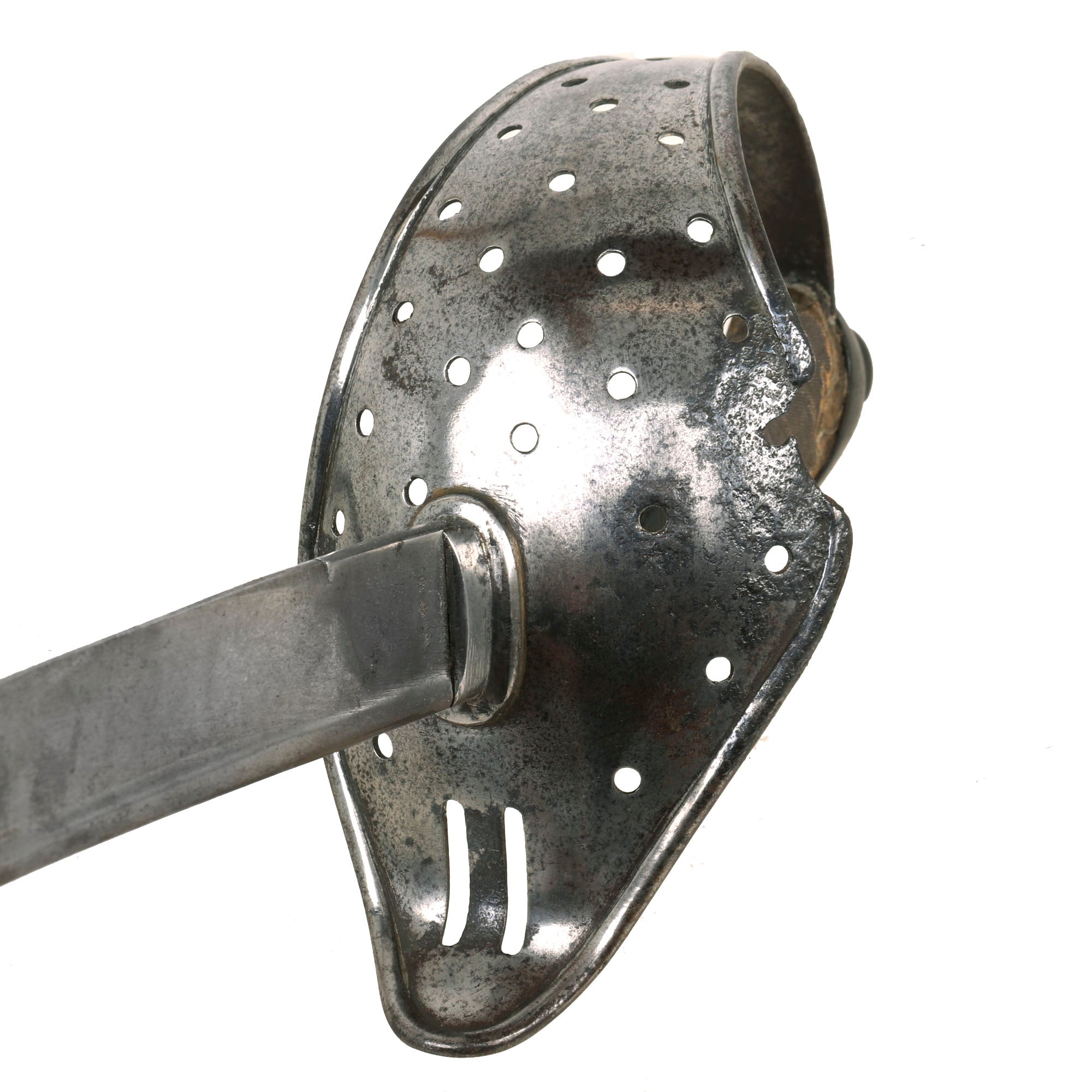 The hilt shows honest service-use, with a small bit of the guard missing with heavy pitting around it. This could be an indication of battle or shrapnel damage, or it could just be from oxidation which has now been neutralized. The grip material is a ray skin rather than sharkskin shagreen, and is heavily worn with some material missing at the edges. If there was a wire wrap at one point, it is now gone. The edges of guard are turned over to protect the wearer's uniform from chafing, and two narrow elongated oval slots are formed, side-by-side, in the upper guard, above the blade.