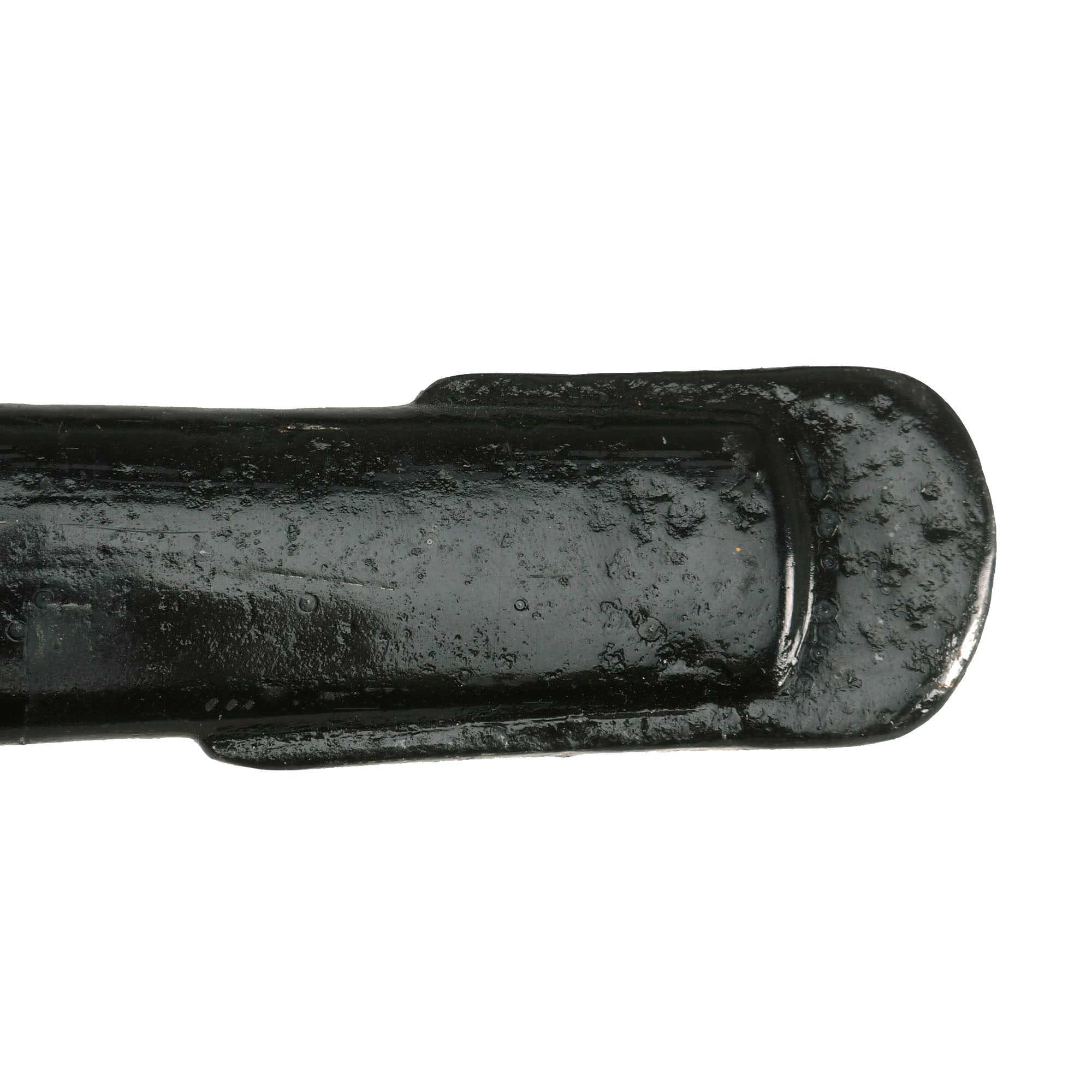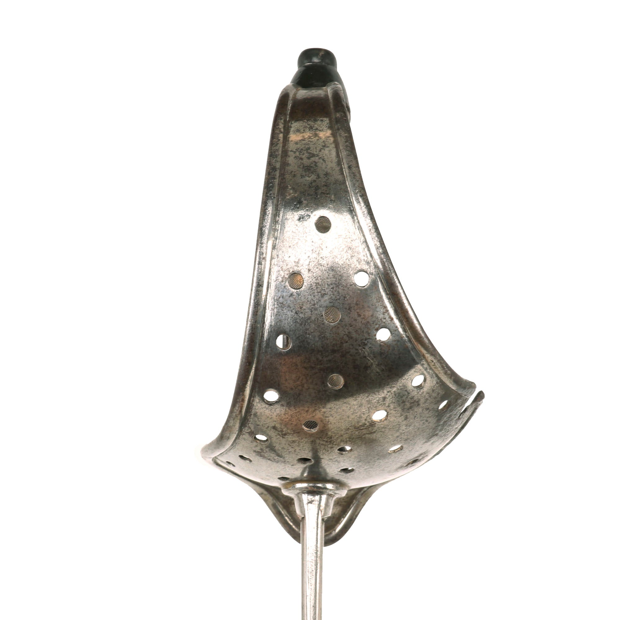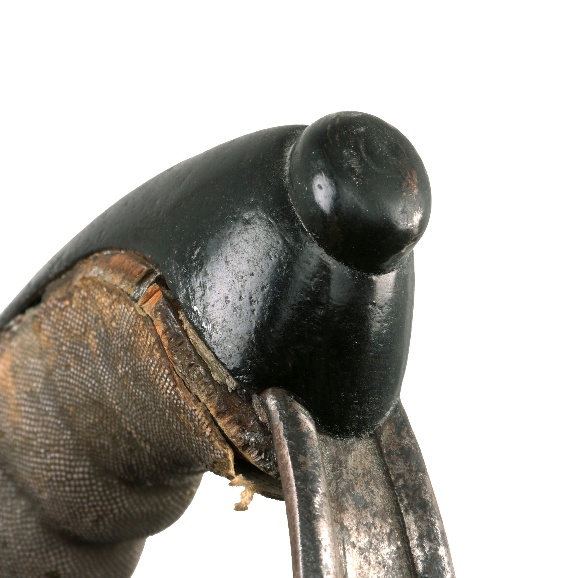 The hilt shows honest service-use, with a small bit of the guard missing with heavy pitting around it. This could be an indication of battle or shrapnel damage, or it could just be from oxidation which has now been neutralized. The grip material is a ray skin rather than sharkskin shagreen, and is heavily worn with some material missing at the edges. If there was a wire wrap at one point, it is now gone. The edges of guard are turned over to protect the wearer's uniform from chafing, and two narrow elongated oval slots are formed, side-by-side, in the upper guard, above the blade.