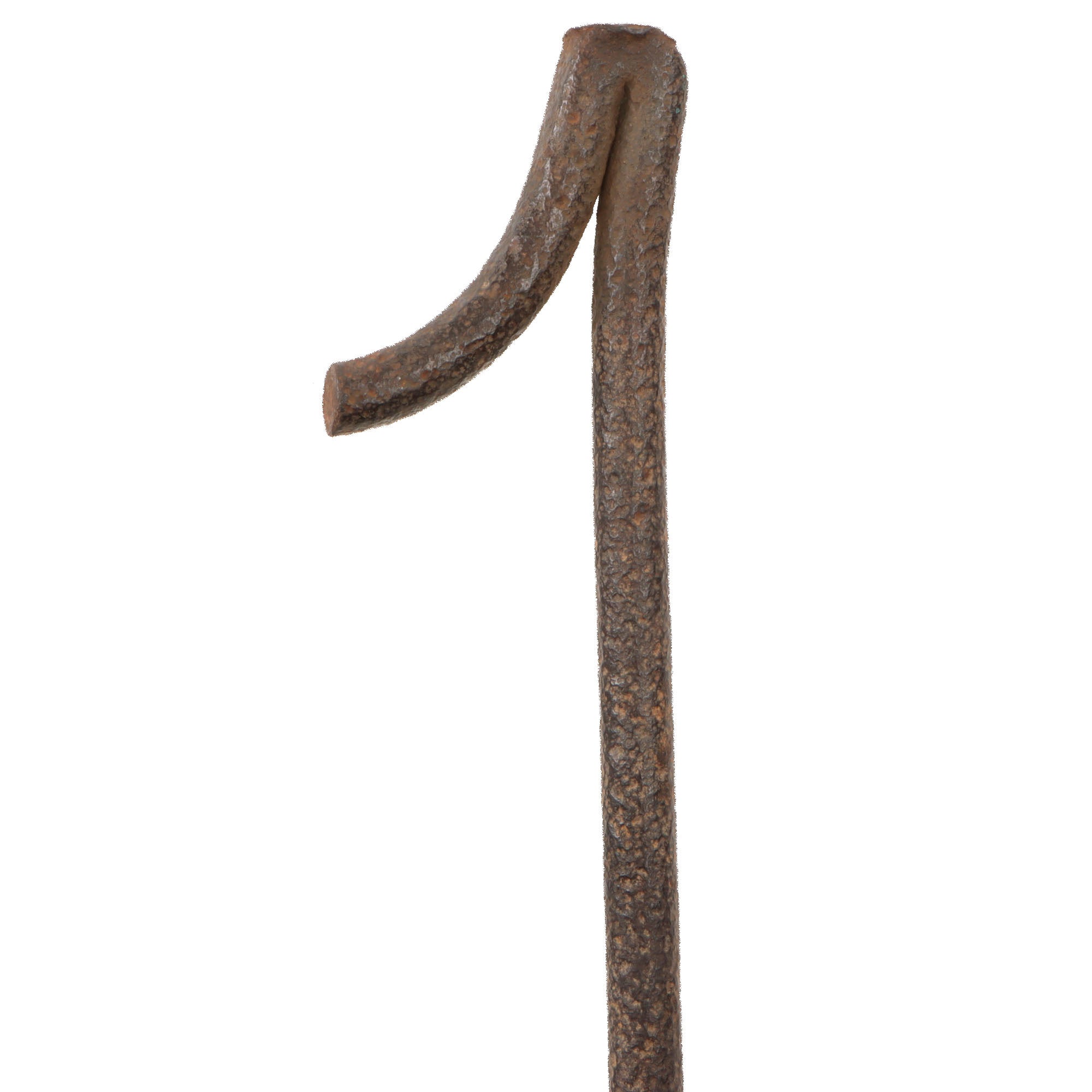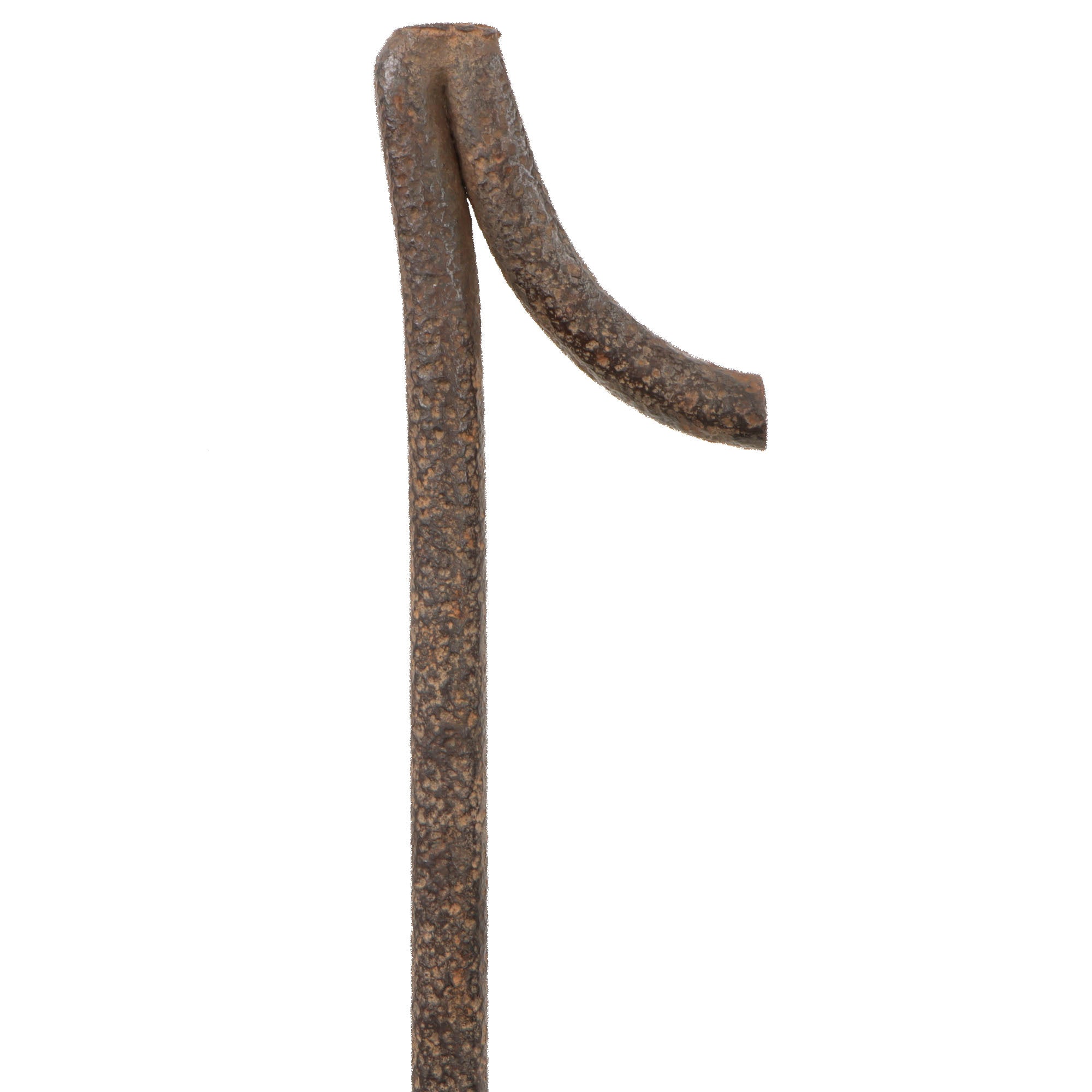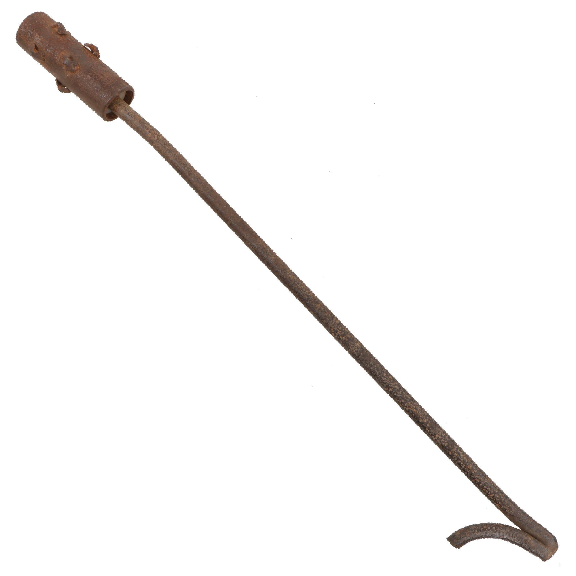 The handle and head now show heavy oxidation, with the handle covered in pitting. Because of this, we believe it’s possible there was originally something wrapped around the handle or perhaps the pommel to afford the user a better grip. The handle is now a small bit dented, and the entire piece is rather heavy and awkward to use. Overall it measures roughly 22¼”.
