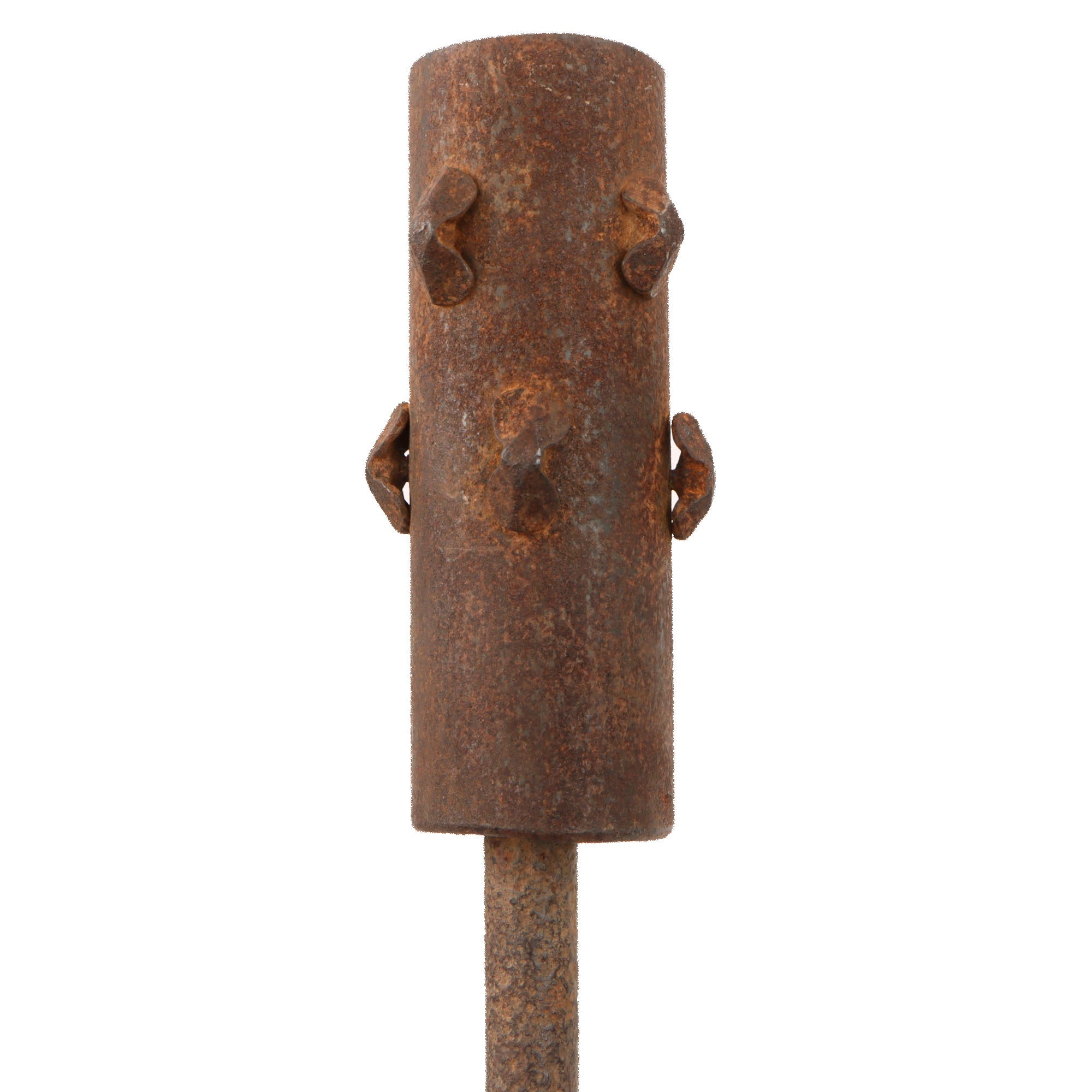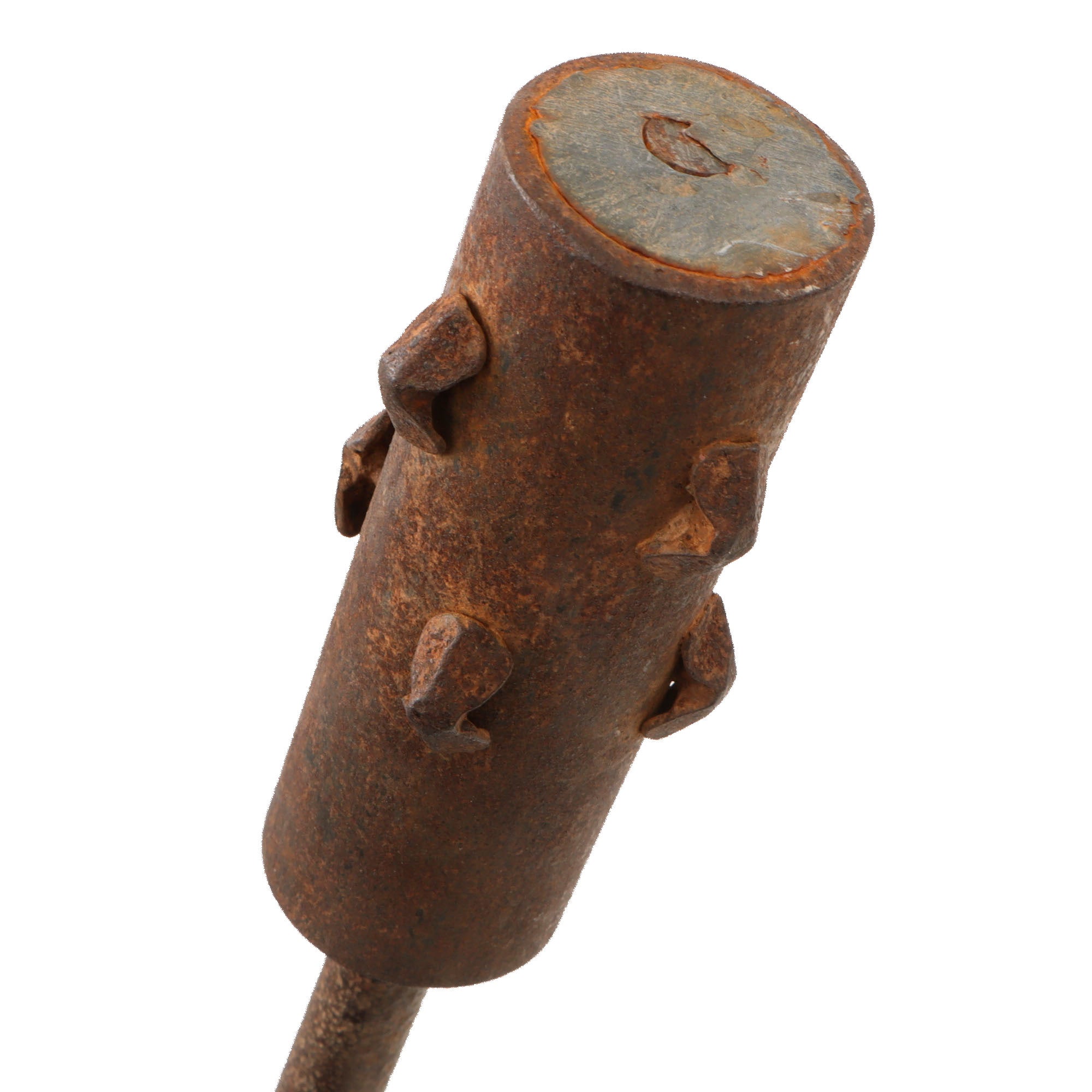 “This is an excellent example of an Austrian trench club that illustrates a soldier's resourcefulness in using the readily available materials to manufacture a weapon while stationed along the front. The entire club was made from metal and has an approximate length of 563 mm and a mass of 1300 grams. A piece of iron pipe (100 mm long) was used for the head of this club into which eight "metal studs or cleats" have been anchored. The central void of the iron pipe was filled with lead. This lead serves to join the club's handle and head together as well as to increase its effective weight when used as a weapon. A barbed wire fence stake was used to create the handle, which retains a uniform diameter along its length until it reaches the grip. The bottom end of the fence stake was heated, bent and cut to form the club's iron grip and the flat base for its pommel.”