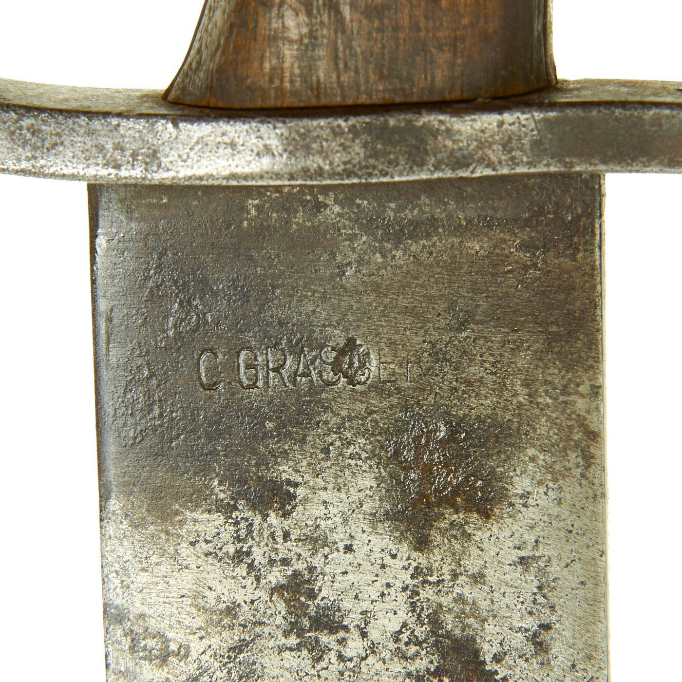 The blade ricasso is marked faintly with maker C. GRASSER, for Carl Grasser of Wien (Vienna), a well known maker seen on many edged weapons from the late 19th century onwards. It is somewhat obscured by the Austrian Imperial Eagle proof that was stamped on one of the "S" letters in the marking. There is also a regimental marking on the crossguard of F H R 33, for Feldhaubitzenregiment 33 (Field Howitzer Regiment 33). Most likely it was used to clear brush for the artillery emplacements, and to help make camouflage from trees.