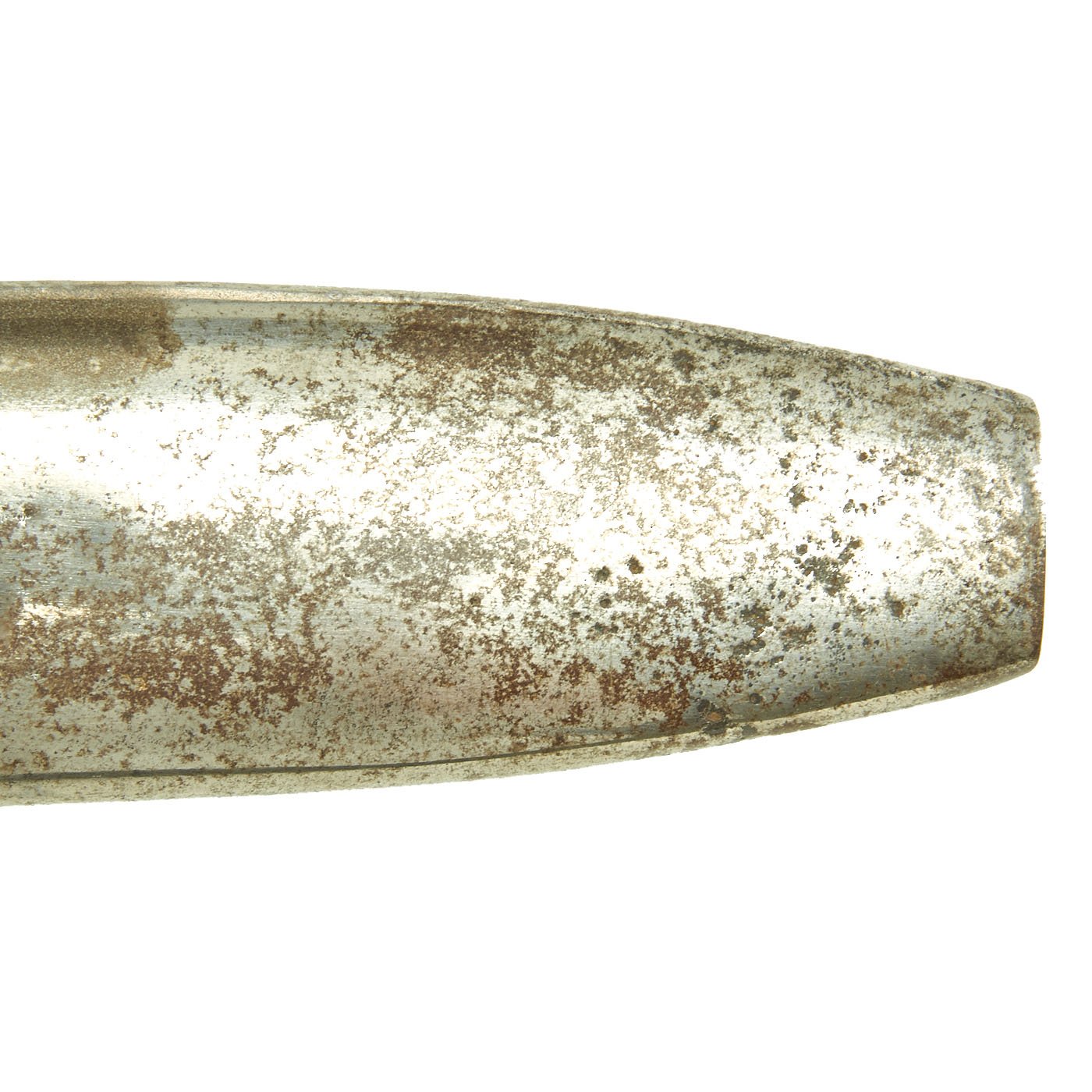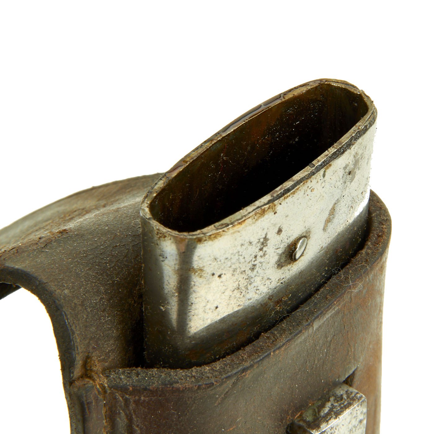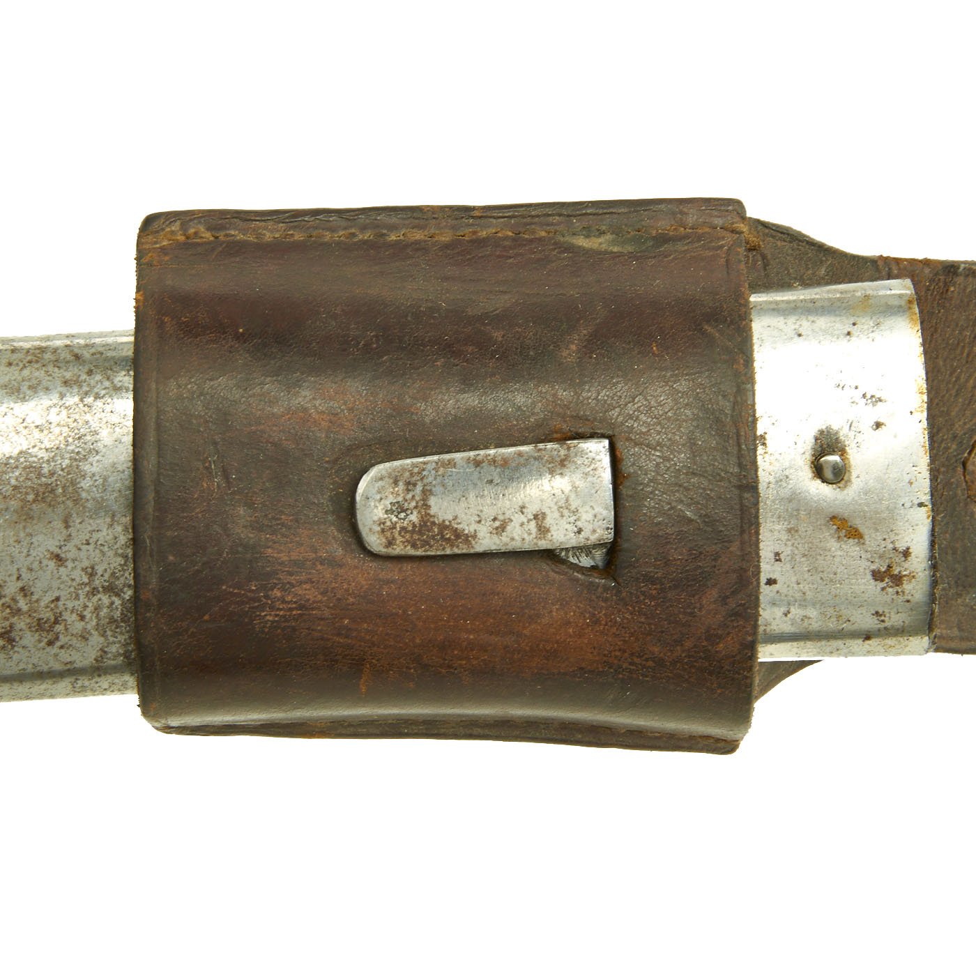 The heavy steel scabbard looks to have been issued "in the white", or had the paint removed at some later time. It has an imperial proof on the frog button, and is retained by a very nice brown leather belt frog.